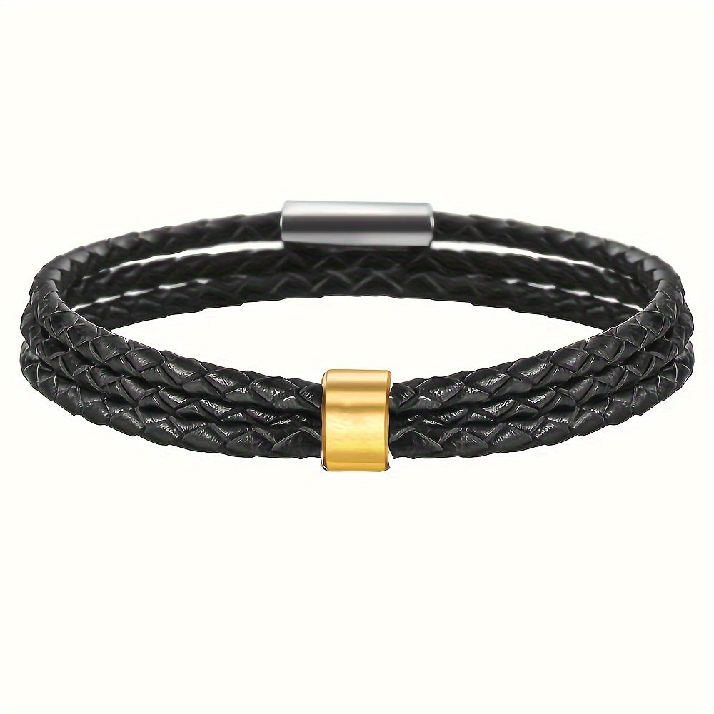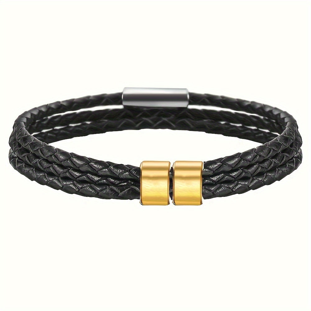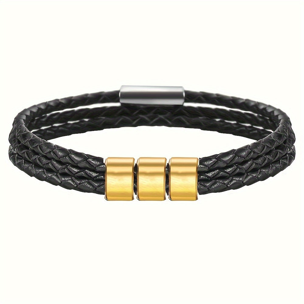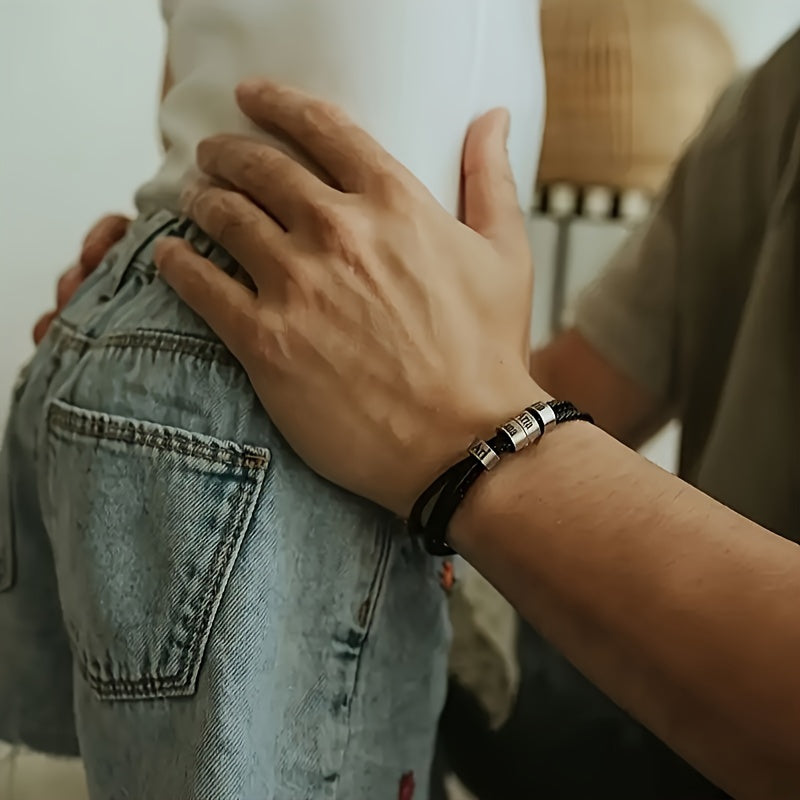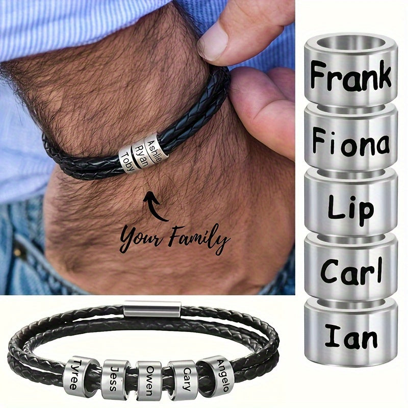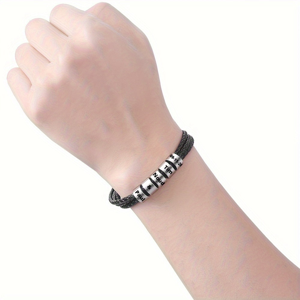 This stylish bracelet can be laser-engraved with your family members' names. Made with faux leather and stainless steel, the round accessory is available in golden, silvery tones.
