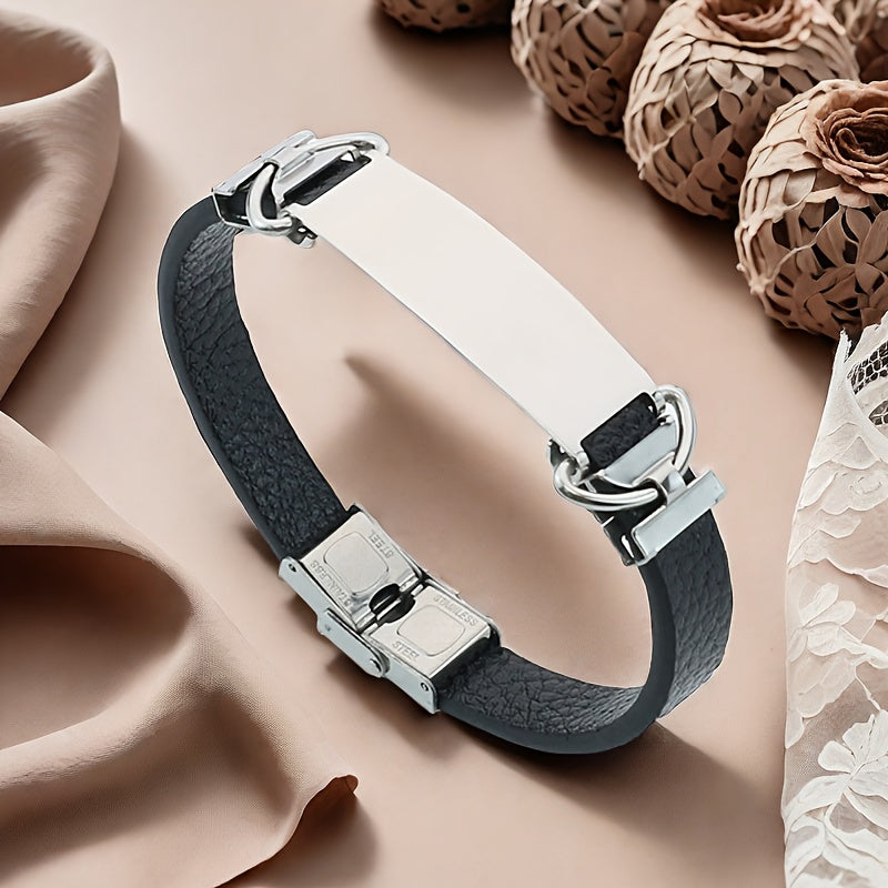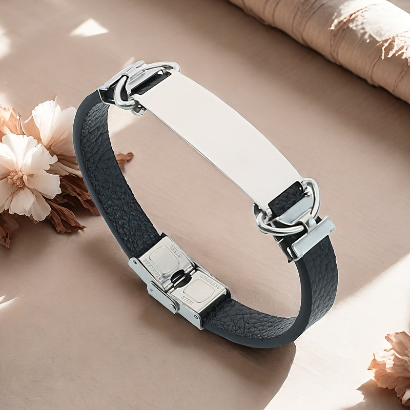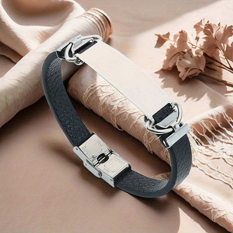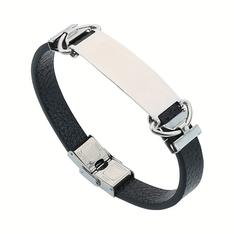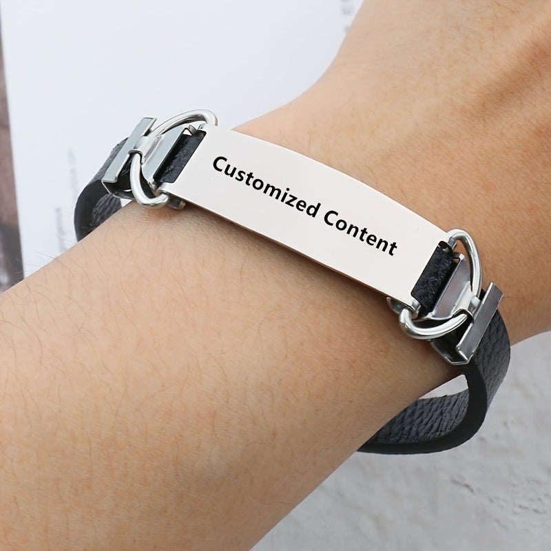 Customize this stylish men's stainless steel ID bracelet with laser engraved name on faux leather wristband. Perfect gift for birthdays, Valentine's Day, Father's Day, and more.