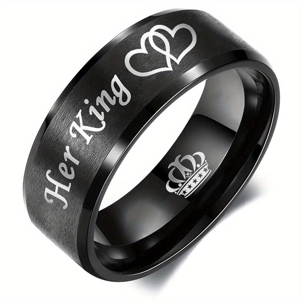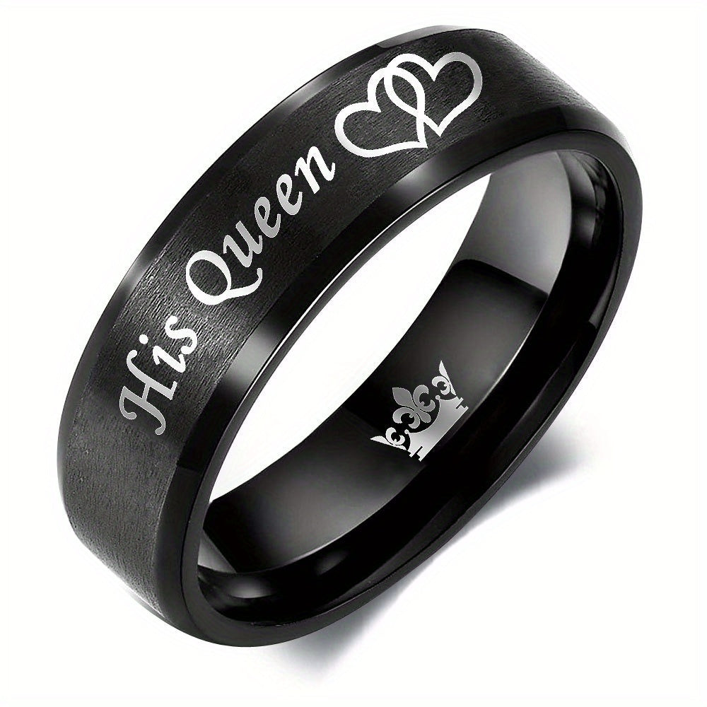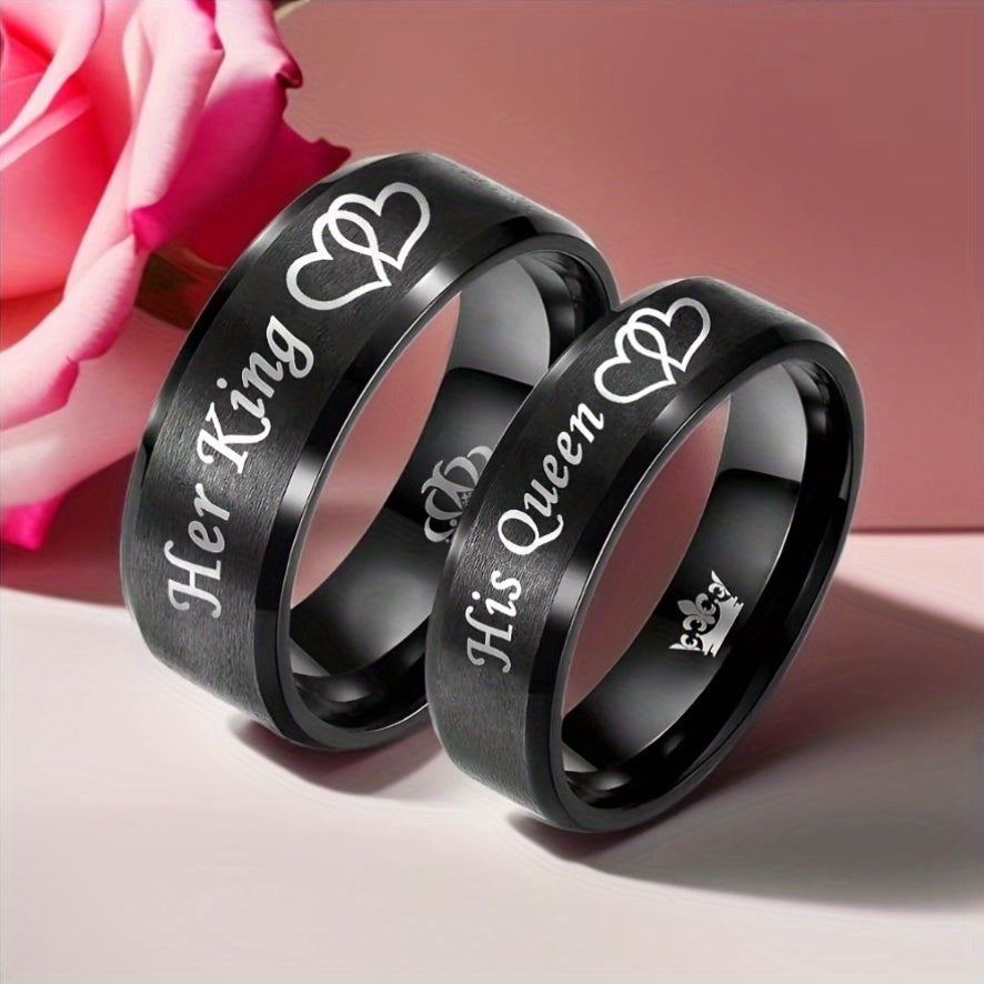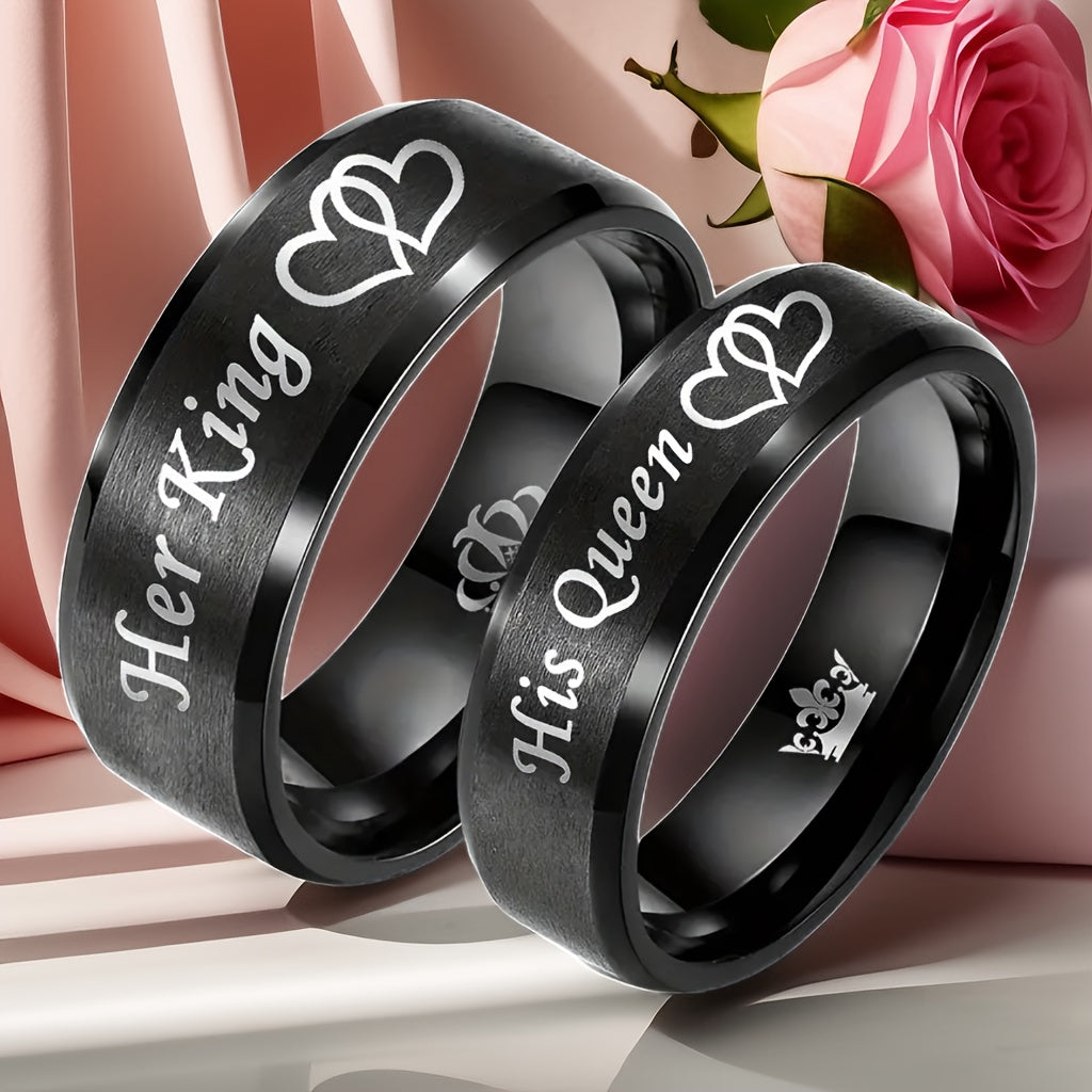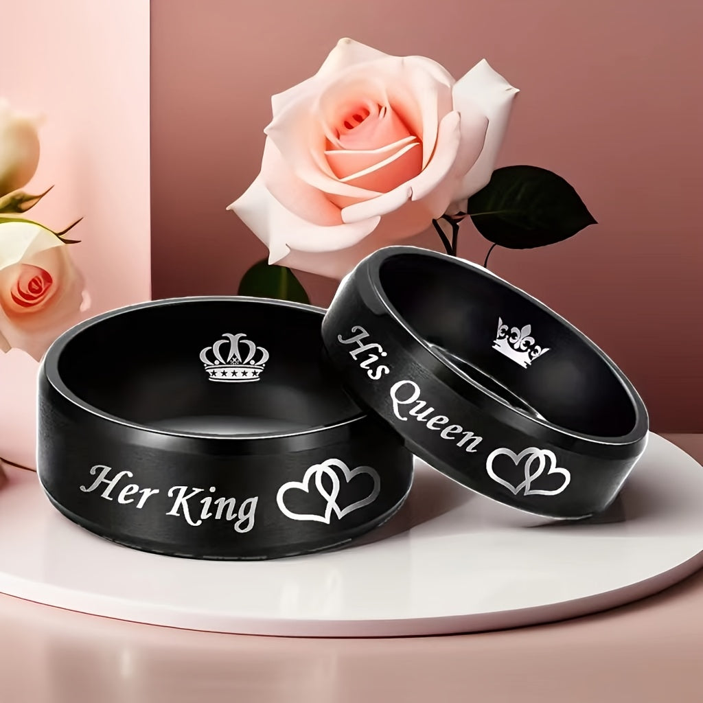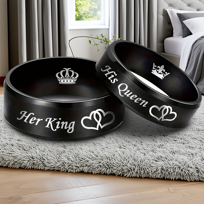 Get these His Queen Her King stainless steel wedding rings featuring crown and heart motifs, the perfect accessory for newlyweds brides and grooms.