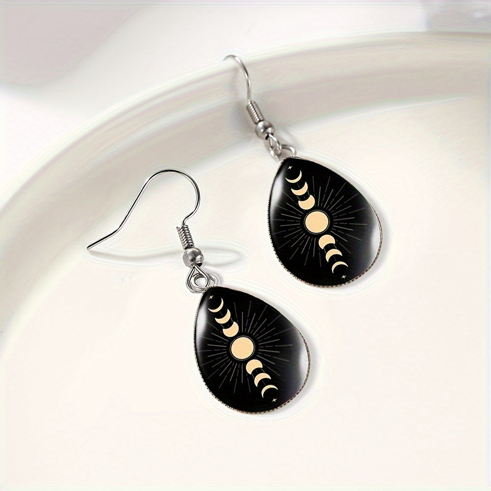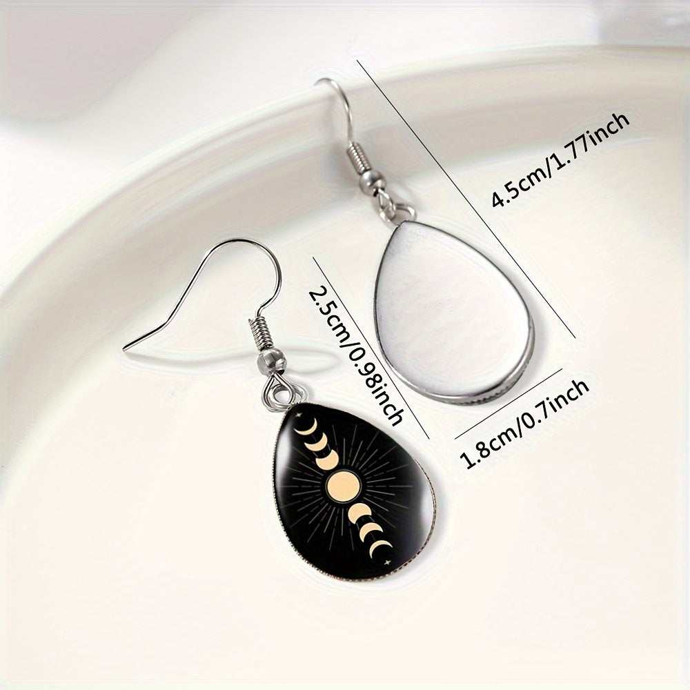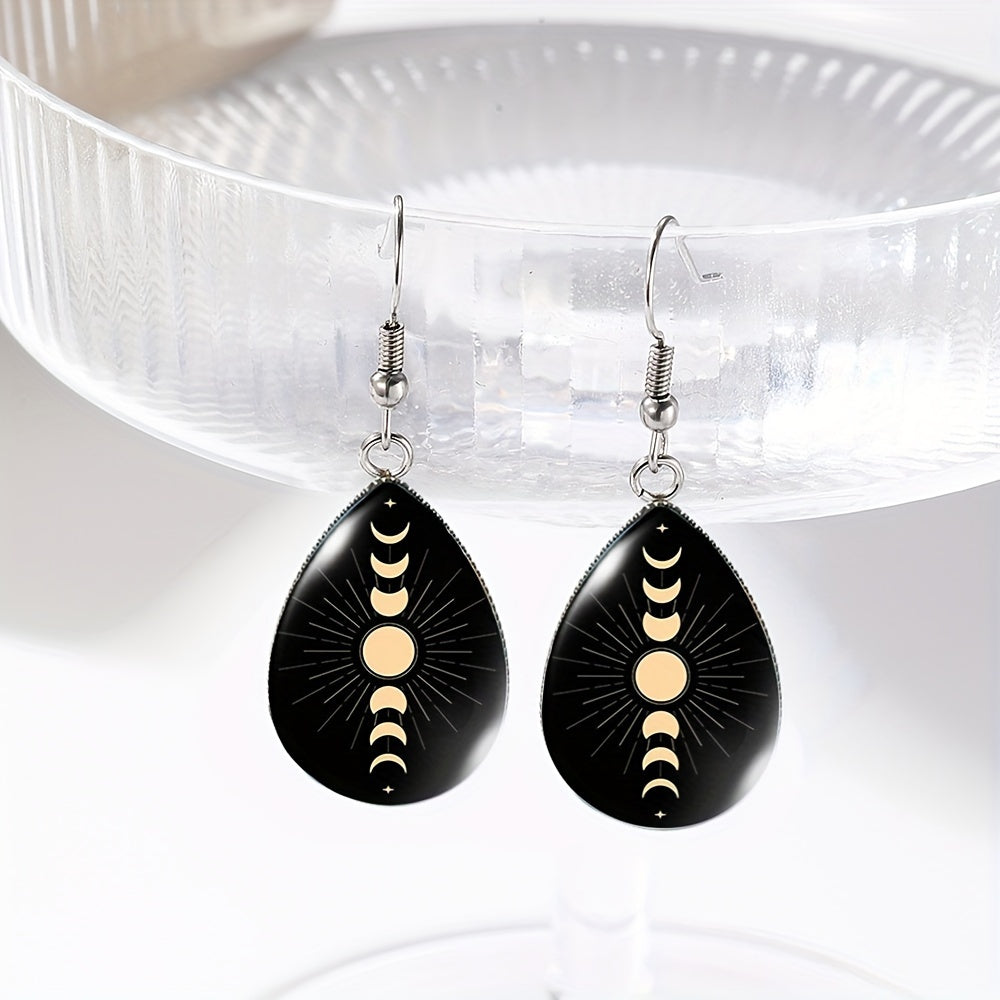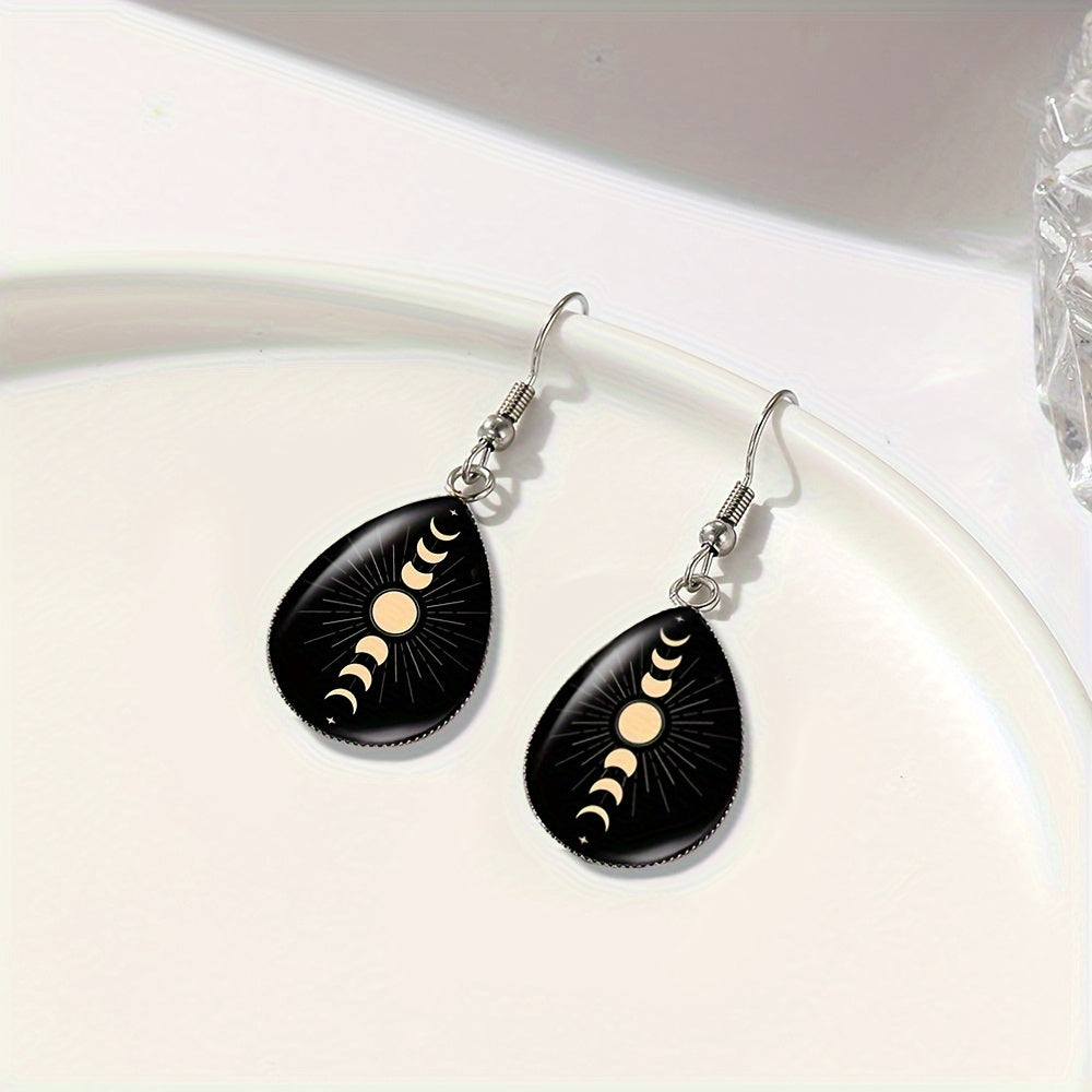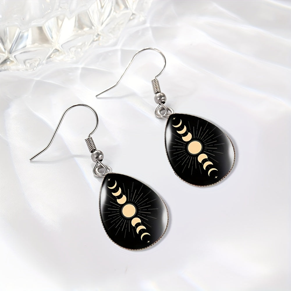 Retro Glass Teardrop Earrings Stainless Steel Hooks Golden Moon Phases
