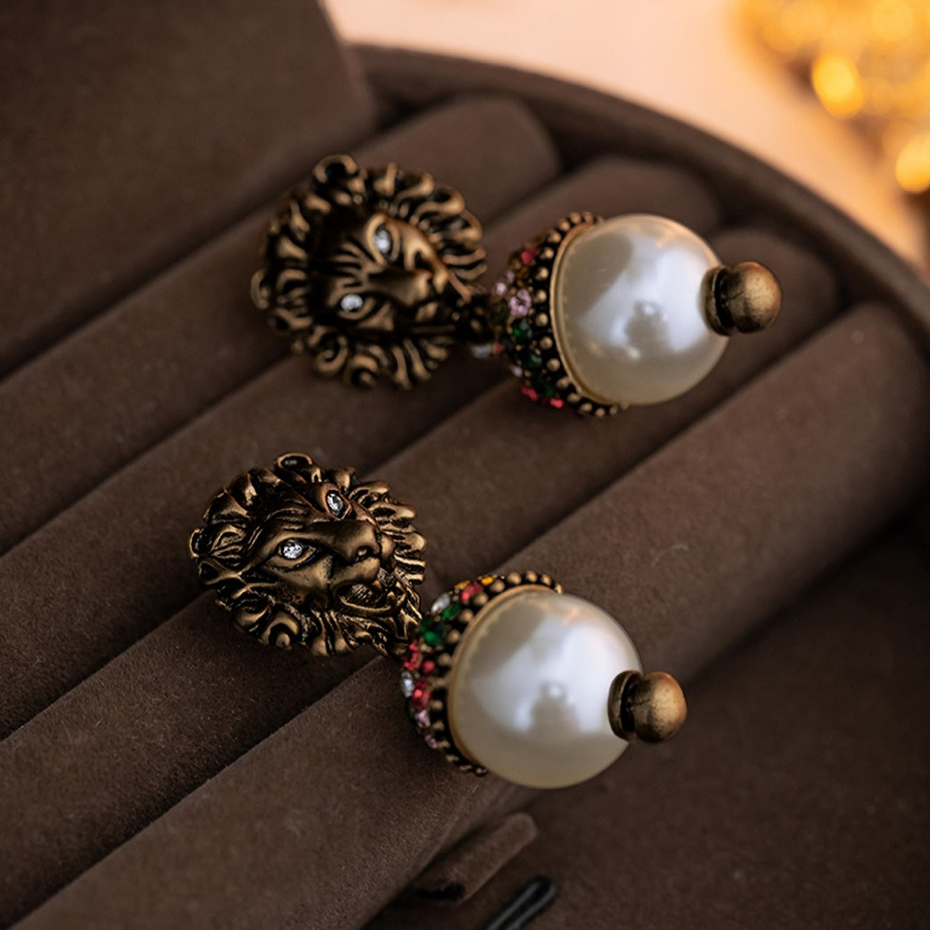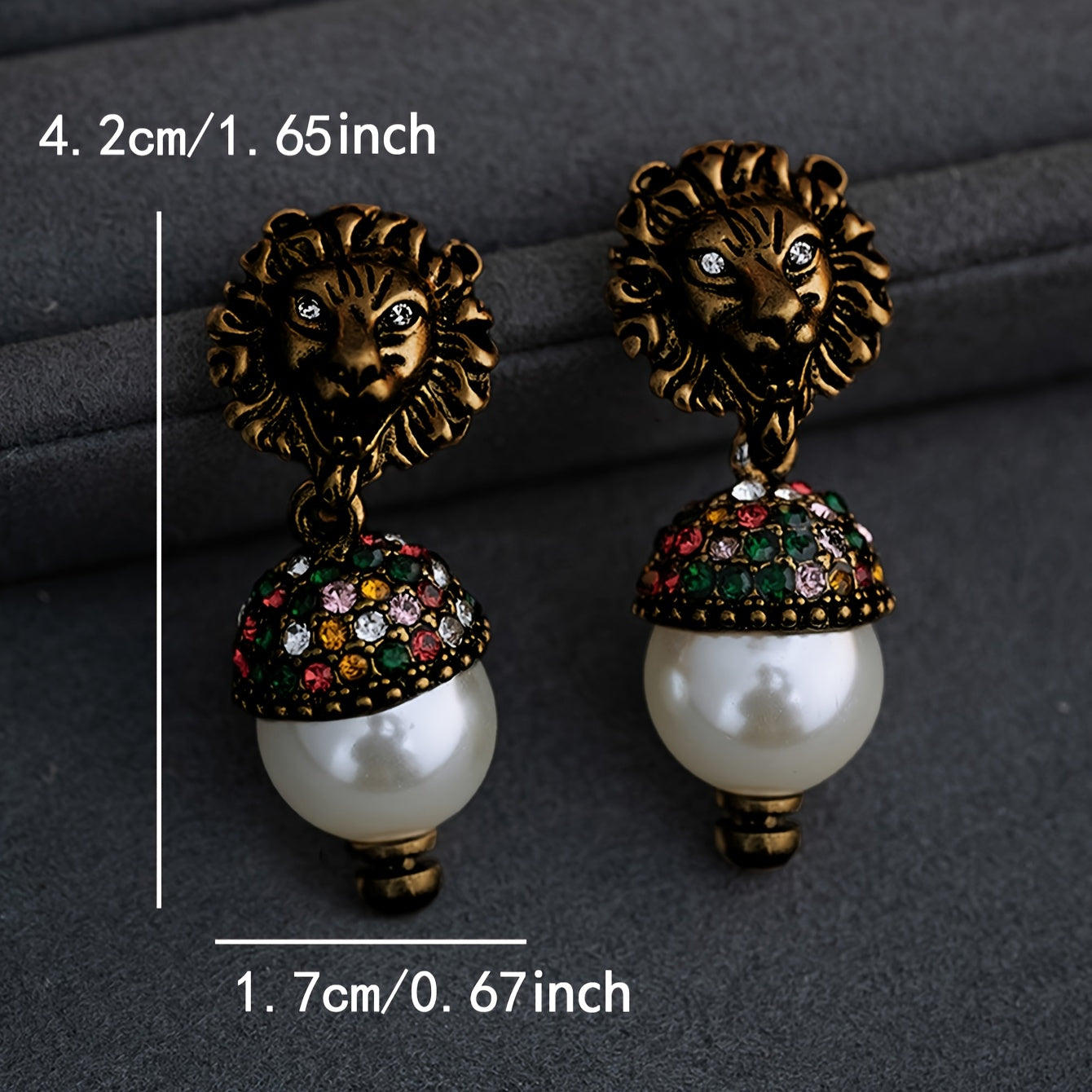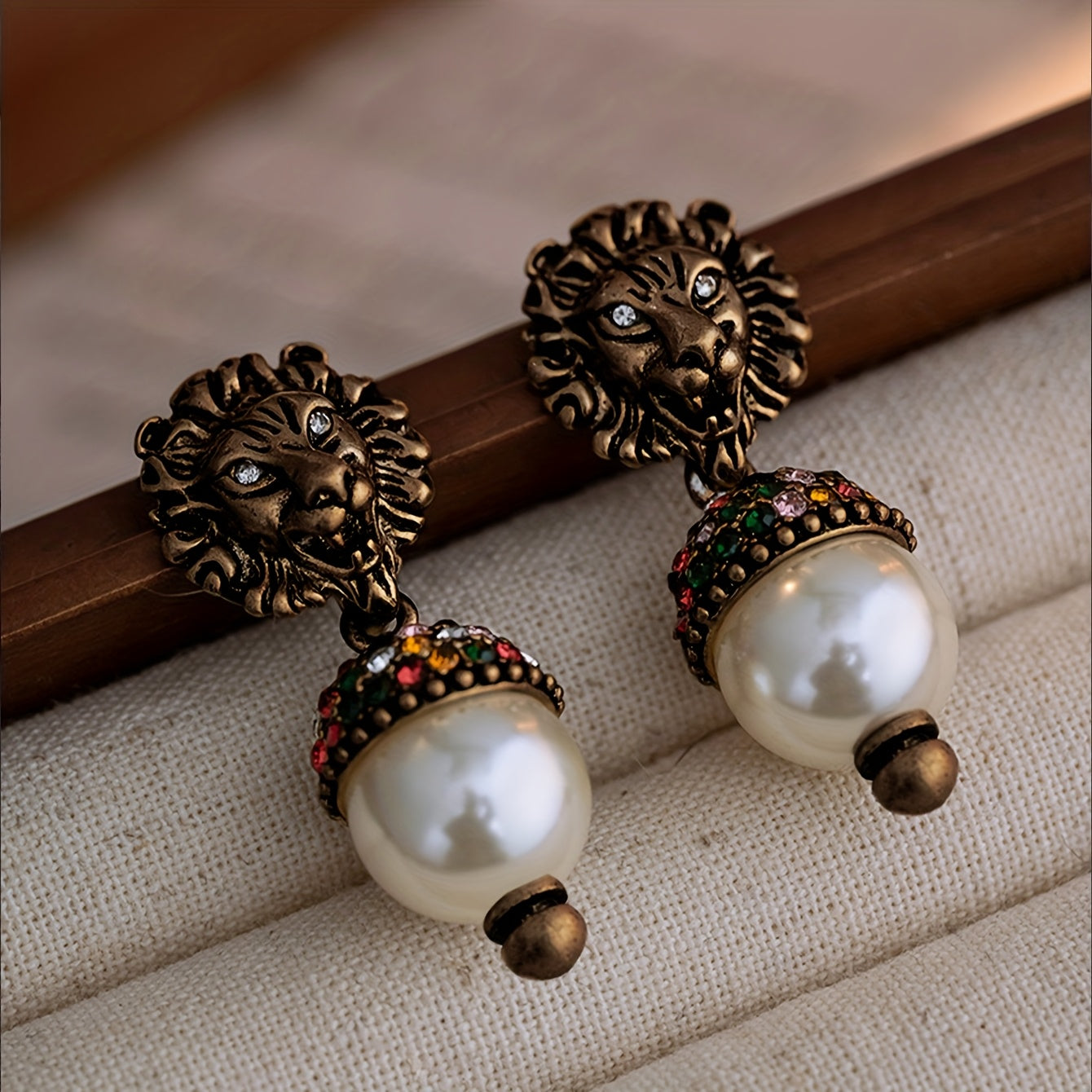 Elevate your party outfits with these stunning drop earrings featuring a retro lion design with inlaid faux pearl. The perfect accessory for daily wear or special occasions.