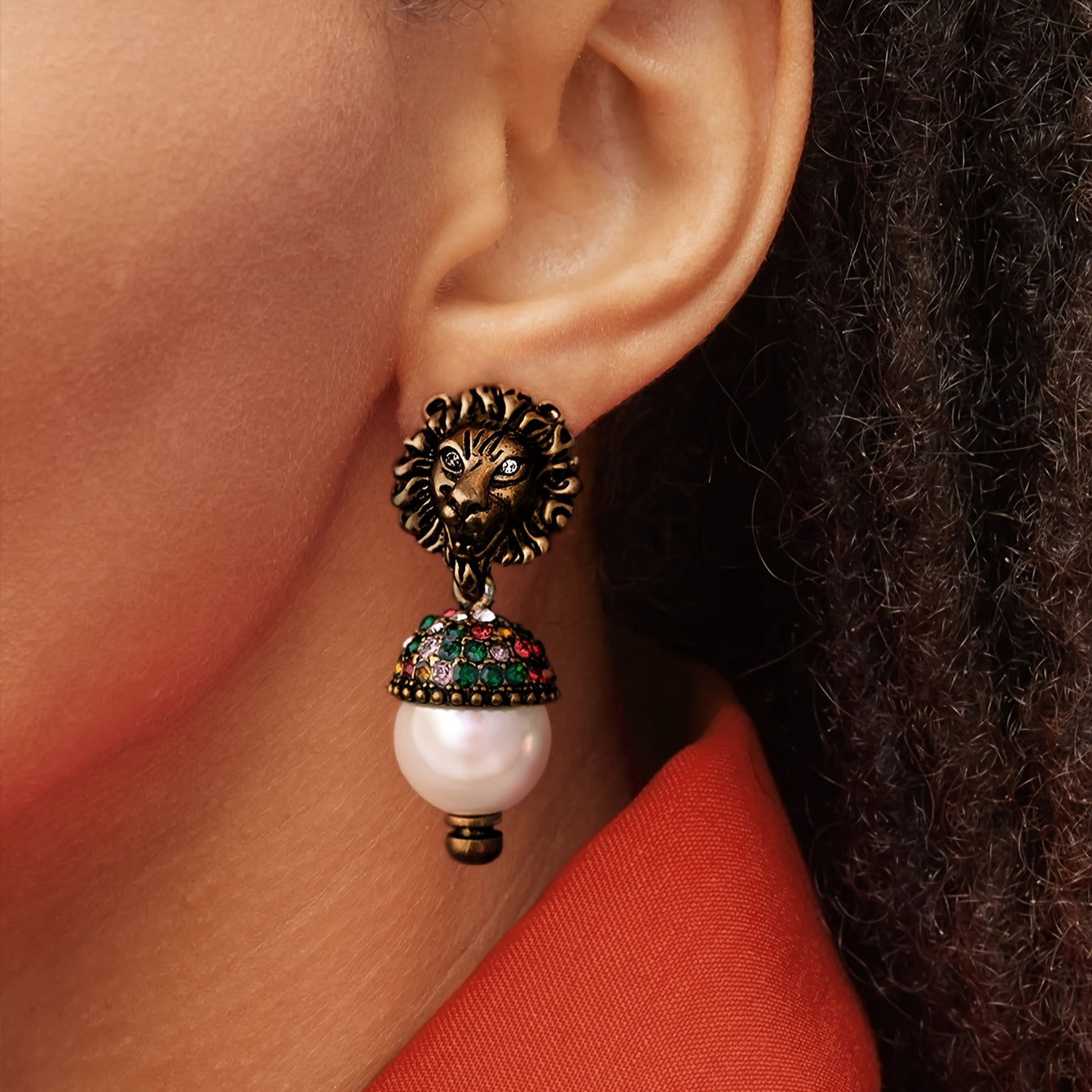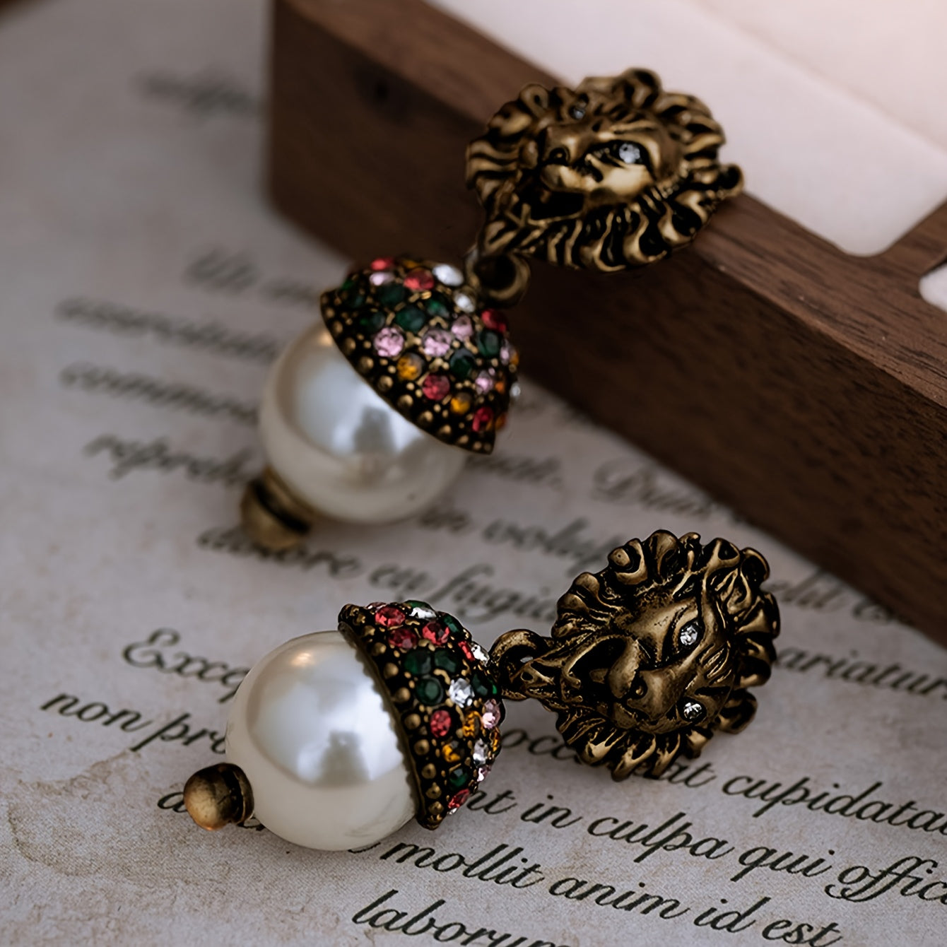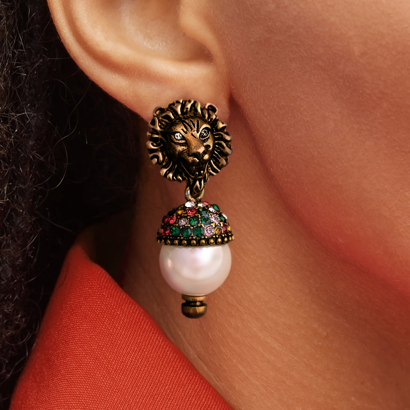 Elevate your party outfits with these stunning drop earrings featuring a retro lion design with inlaid faux pearl. The perfect accessory for daily wear or special occasions.