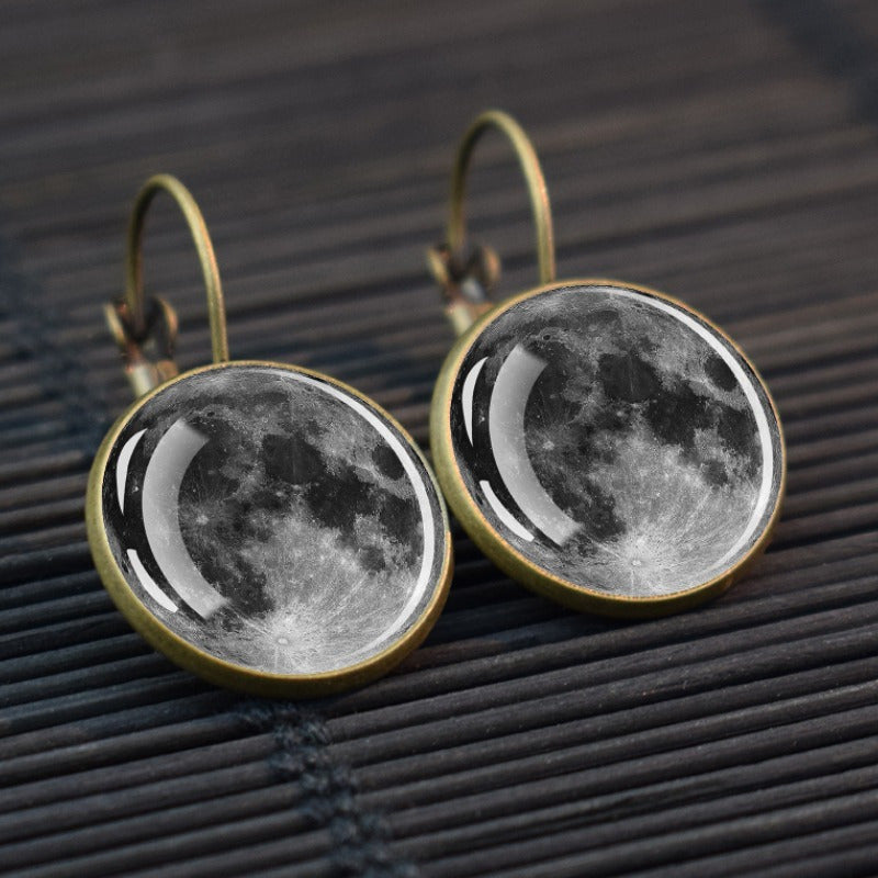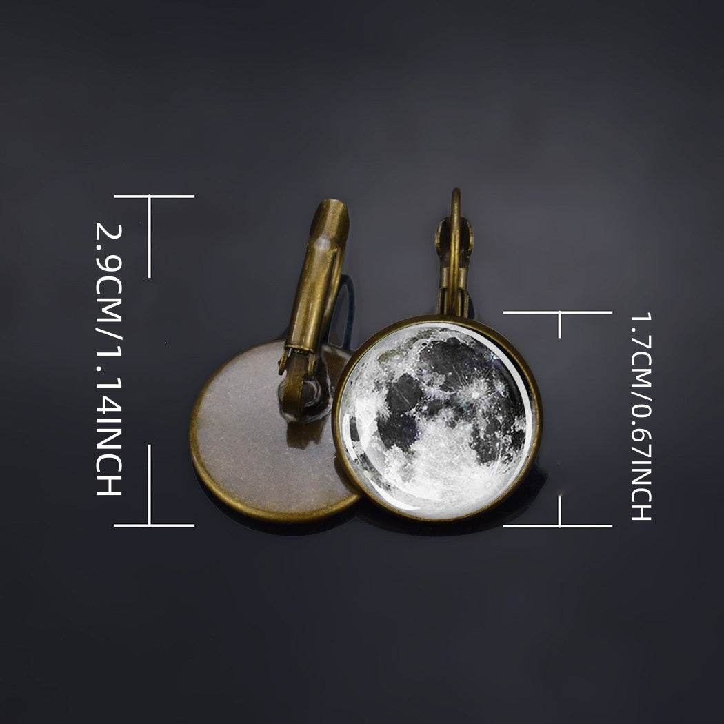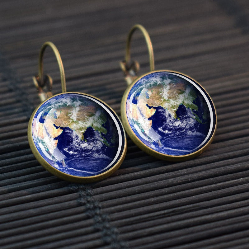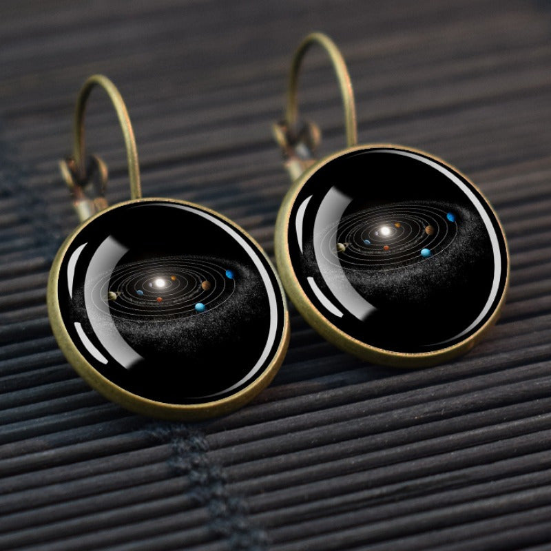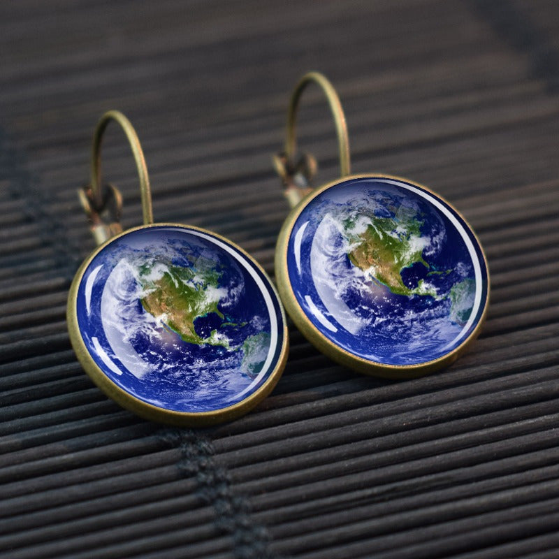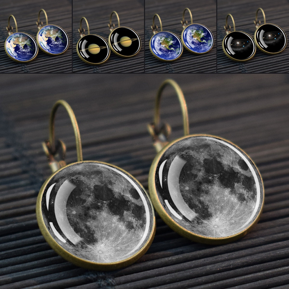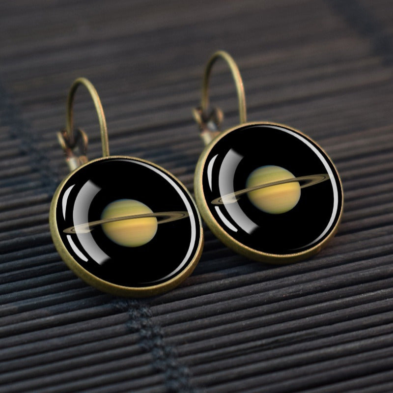 These earrings feature a retro design of the solar system with patterns of Saturn, the Moon, and Earth. A perfect gift for Valentine's Day.