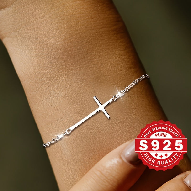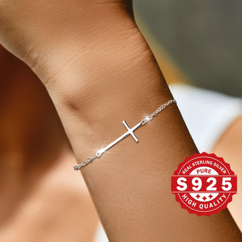 Elegant women's bracelet made of sterling silver with a horizontal cross design and an O link chain, perfect for any outfit.