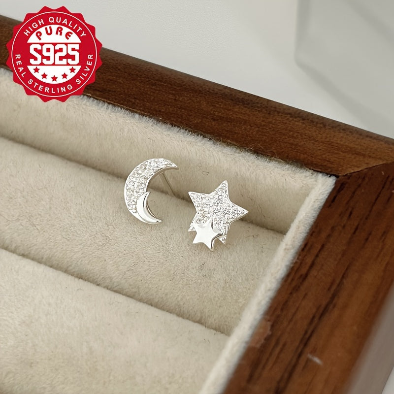 S925 Silver Star & Moon Stud Earrings with Asymmetrical Style
