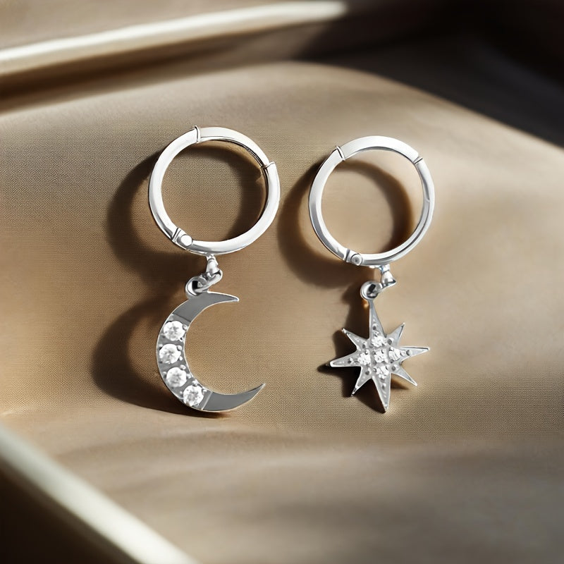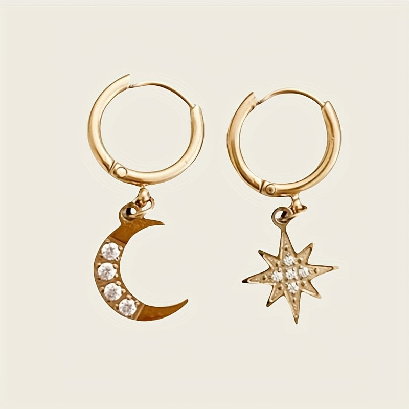 Stainless Steel Star & Moon Asymmetrical Hoop Earrings for Women