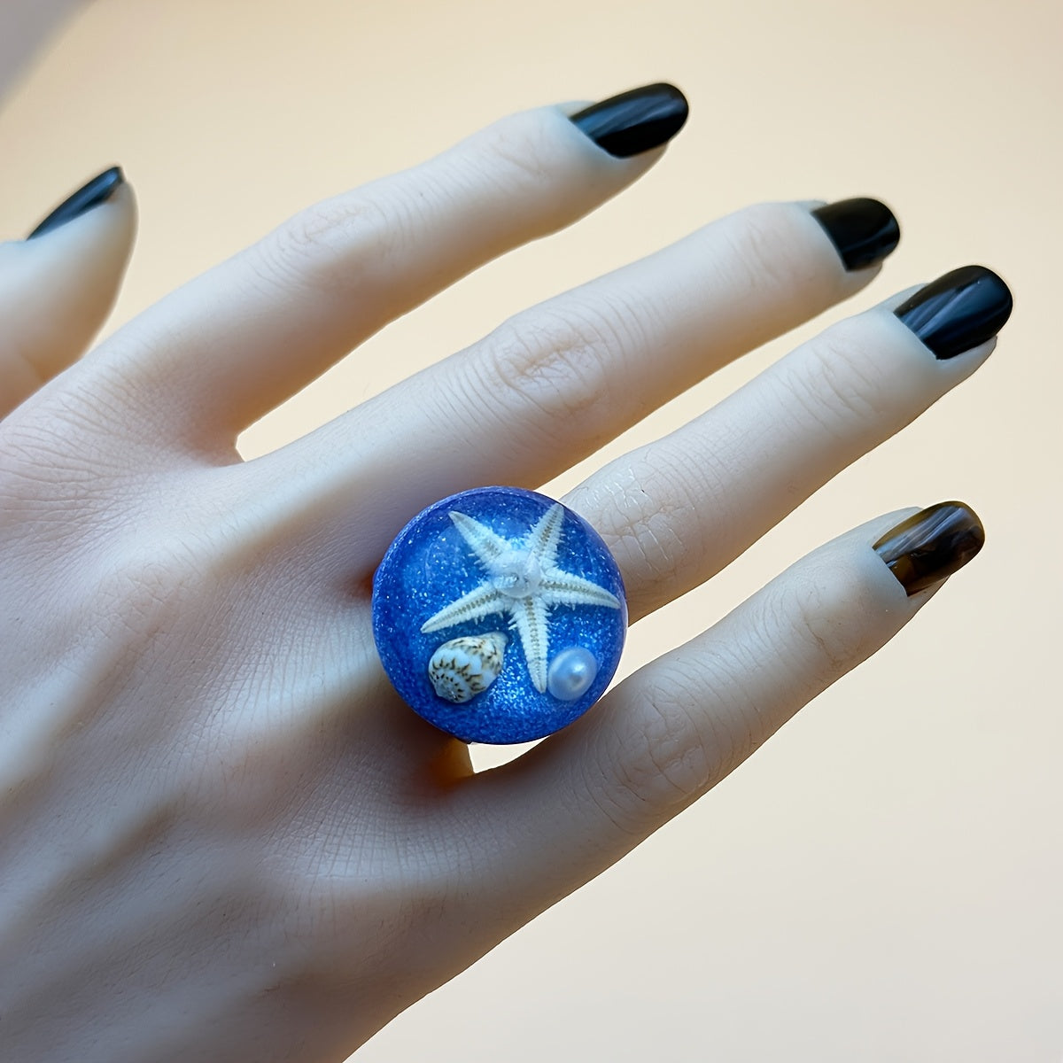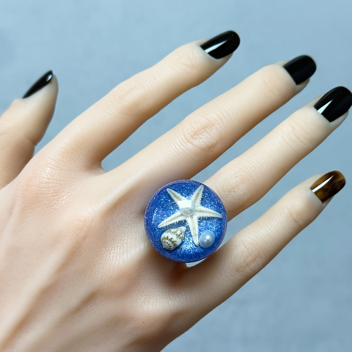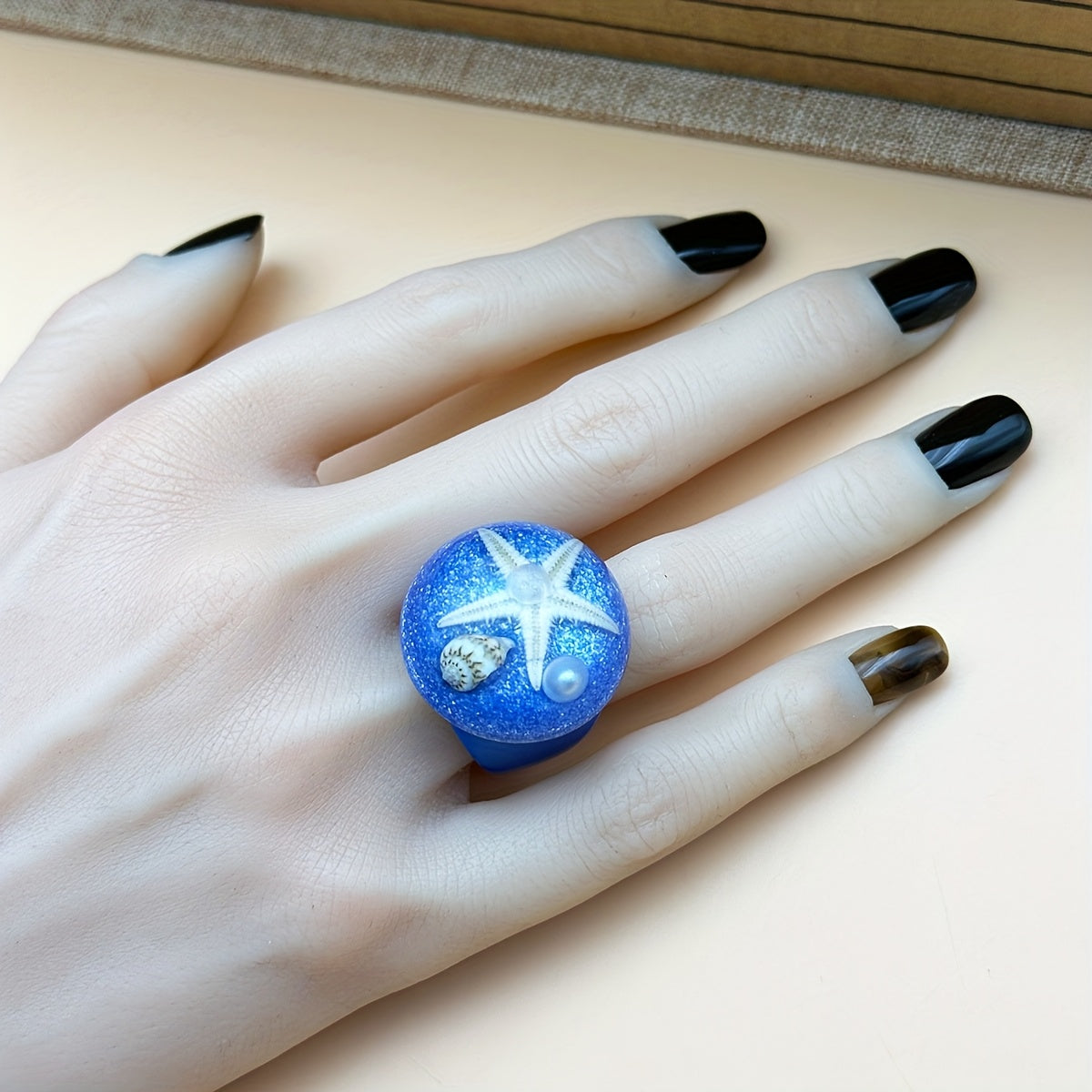 This unique resin ring features a starfish and seashell design, perfect for daily wear or party occasions. Suitable for both men and women.
