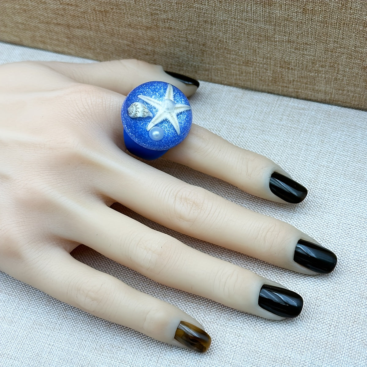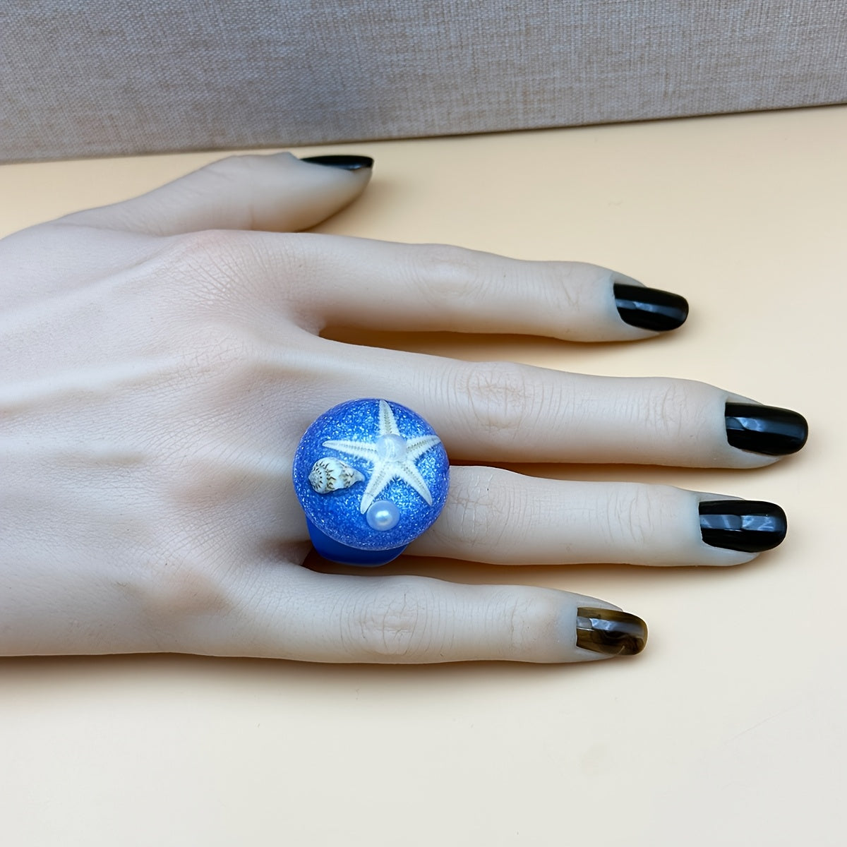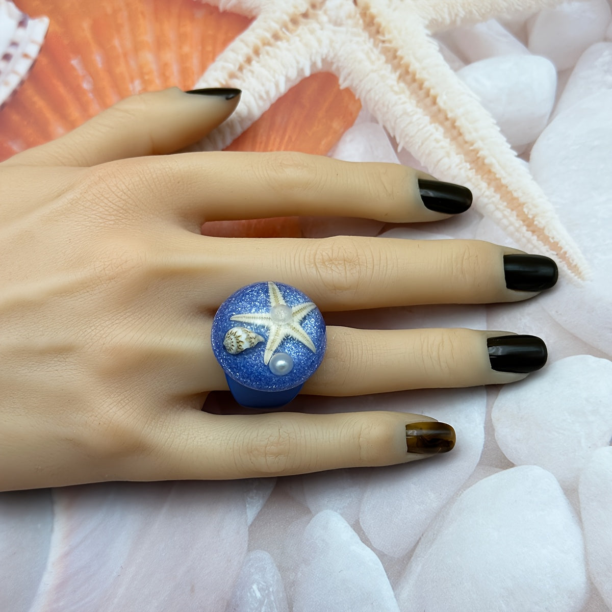This unique resin ring features a starfish and seashell design, perfect for daily wear or party occasions. Suitable for both men and women.