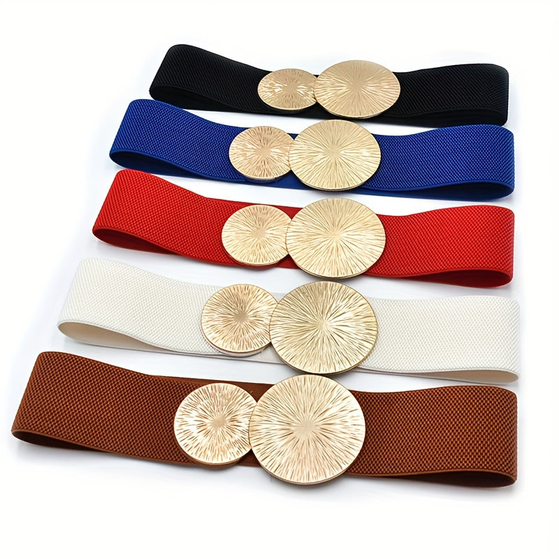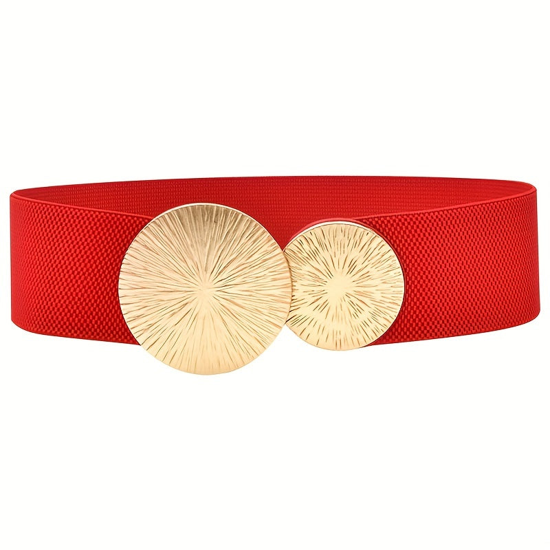 Enhance your outfit with this wide elastic belt featuring a golden buckle. The belt is perfect for dresses and provides a flattering fit.