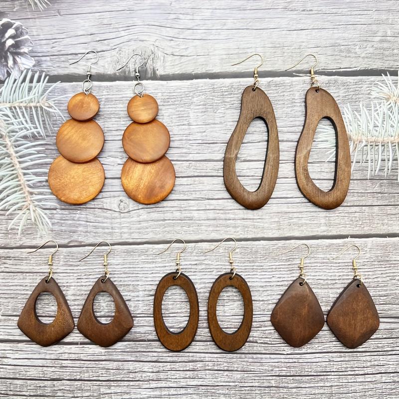 Elevate your look with this set of 5 stylish wooden pendant earrings in a versatile retro coffee color. Perfect for a bohemian vacation style, these exaggerated geometric wooden earrings are a must-have accessory.