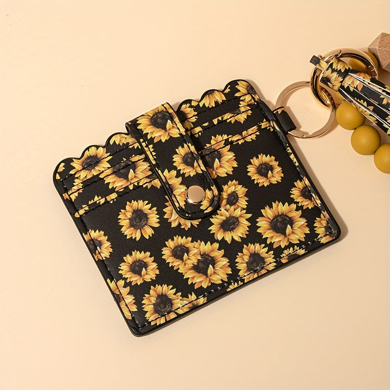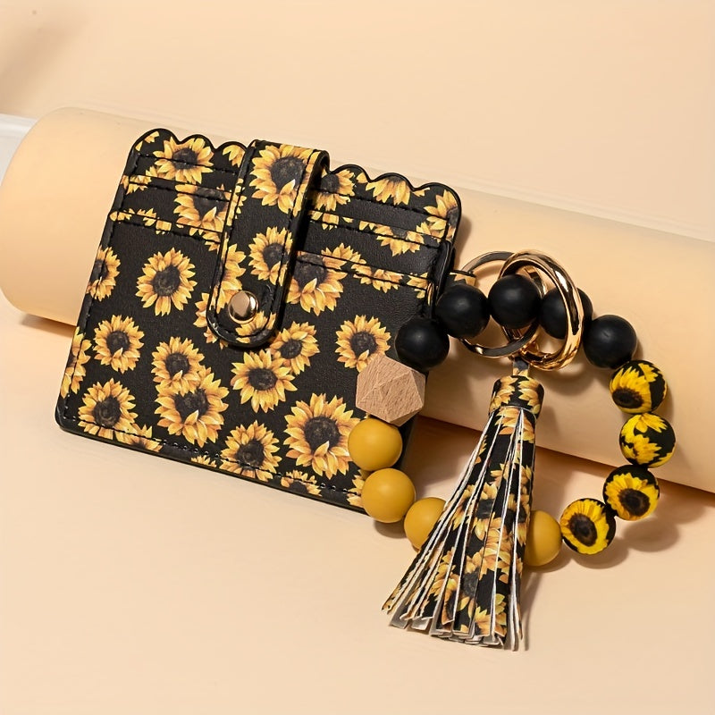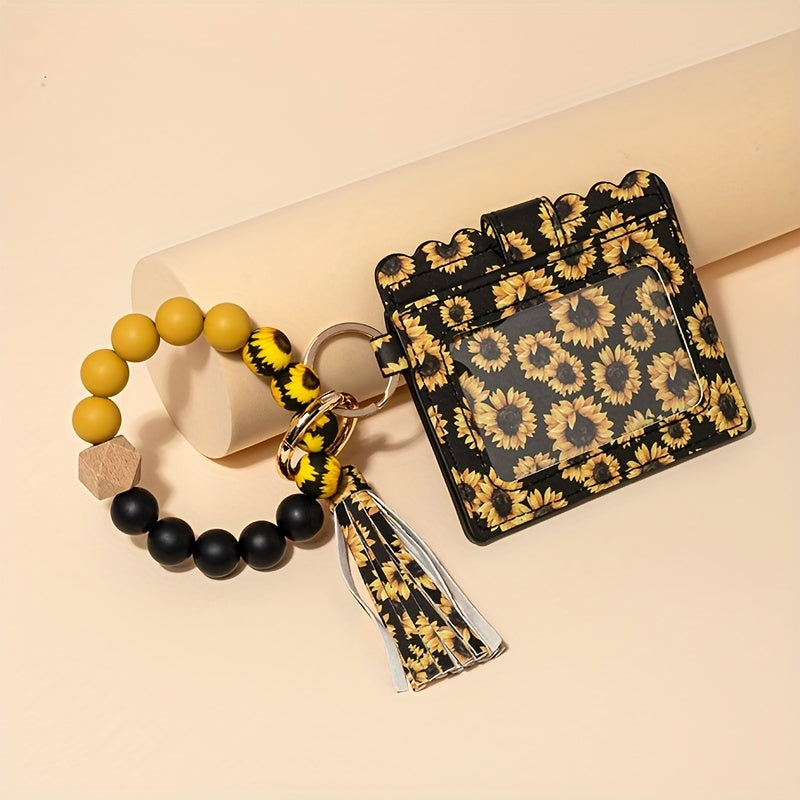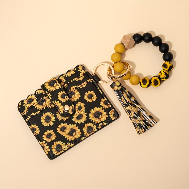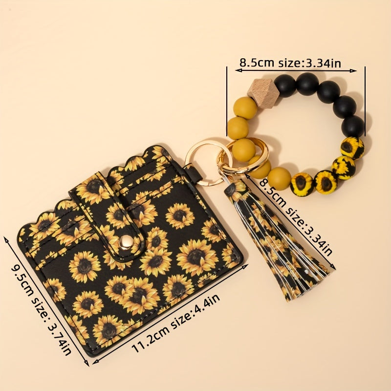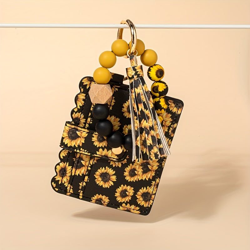 This stylish accessory combines a card bag, bracelet, and key ring in one. It features a sunflower design with a PU tassel for added charm.