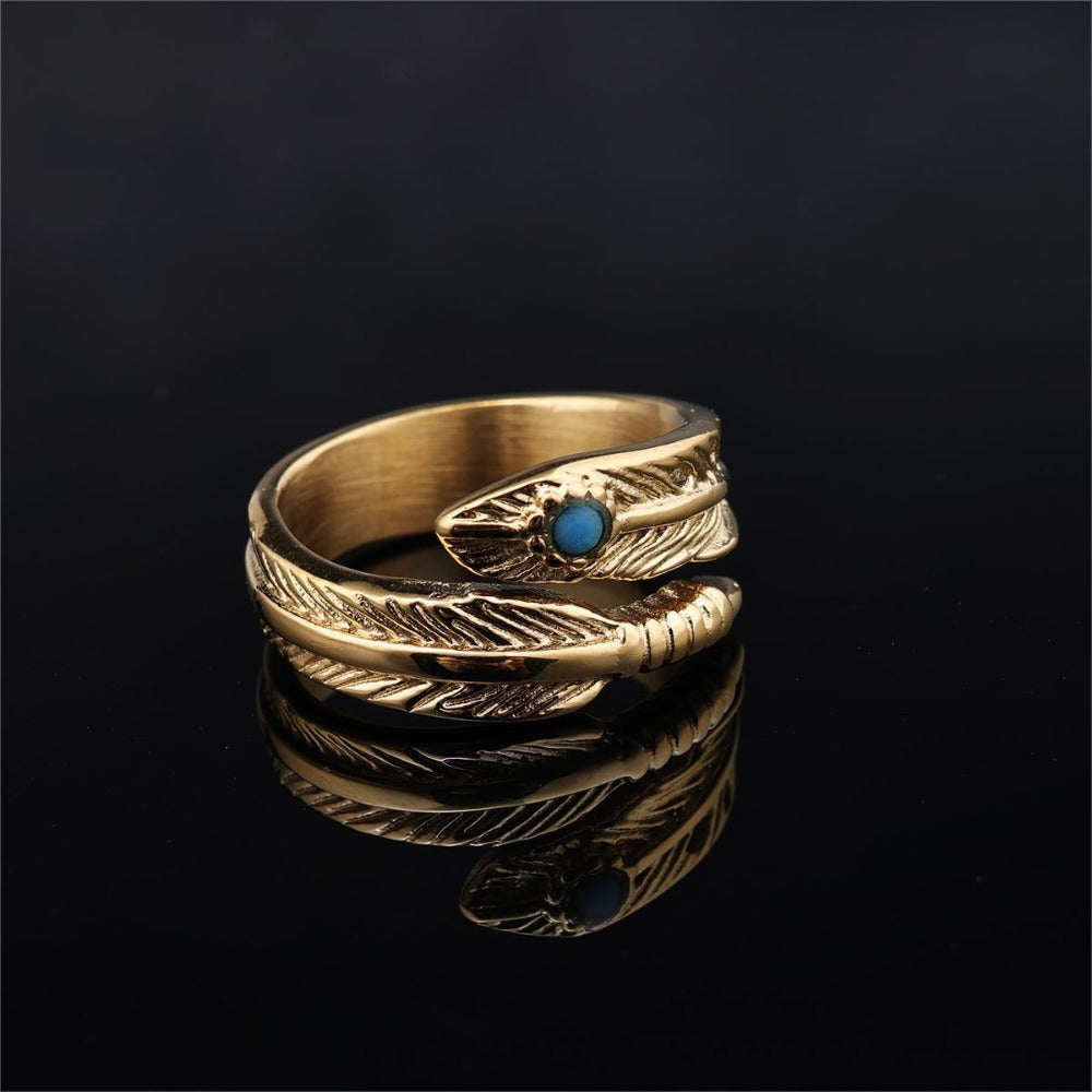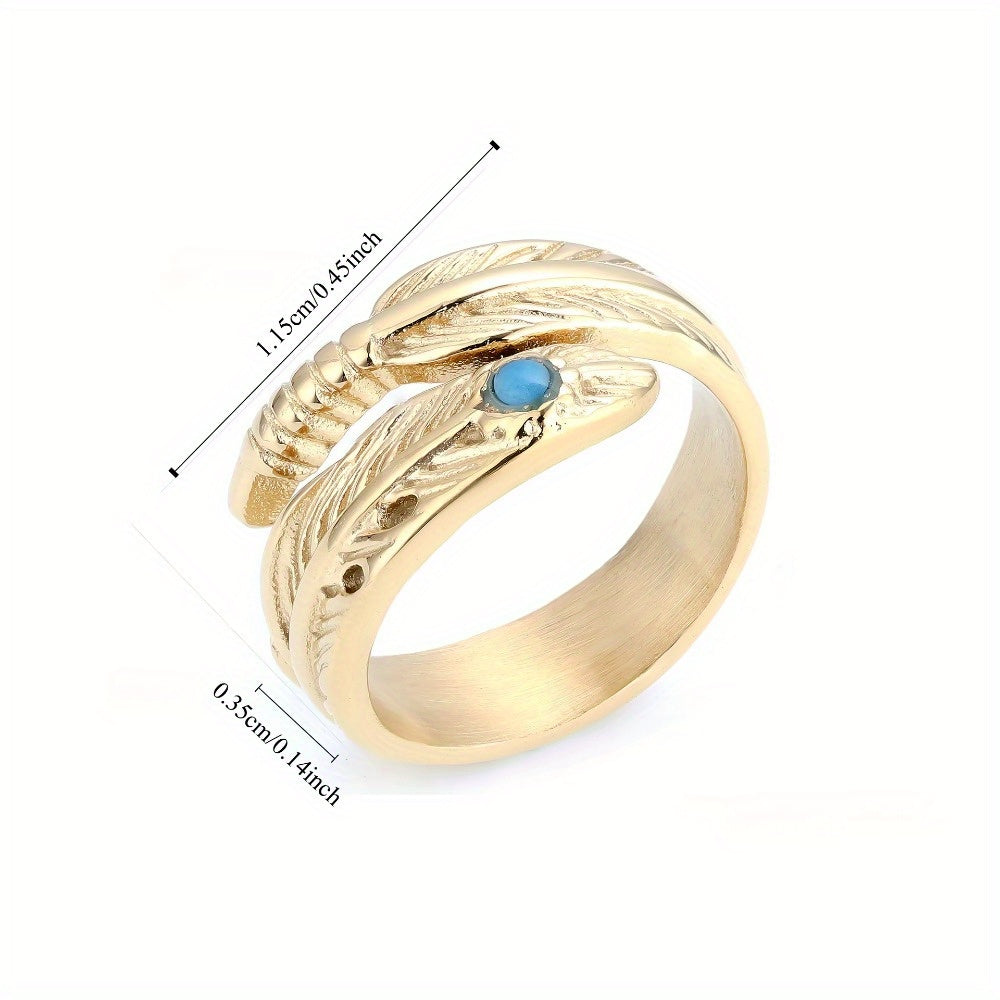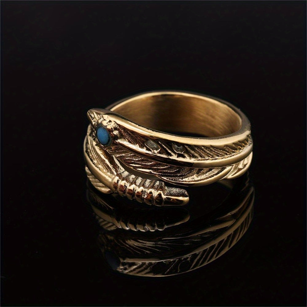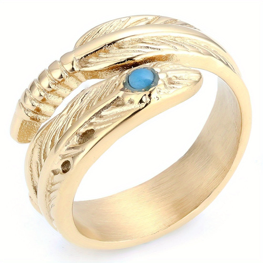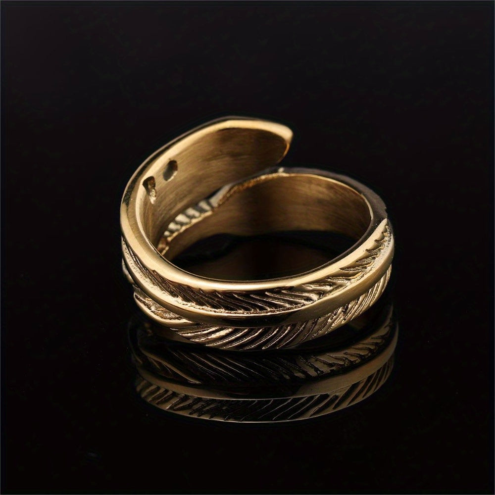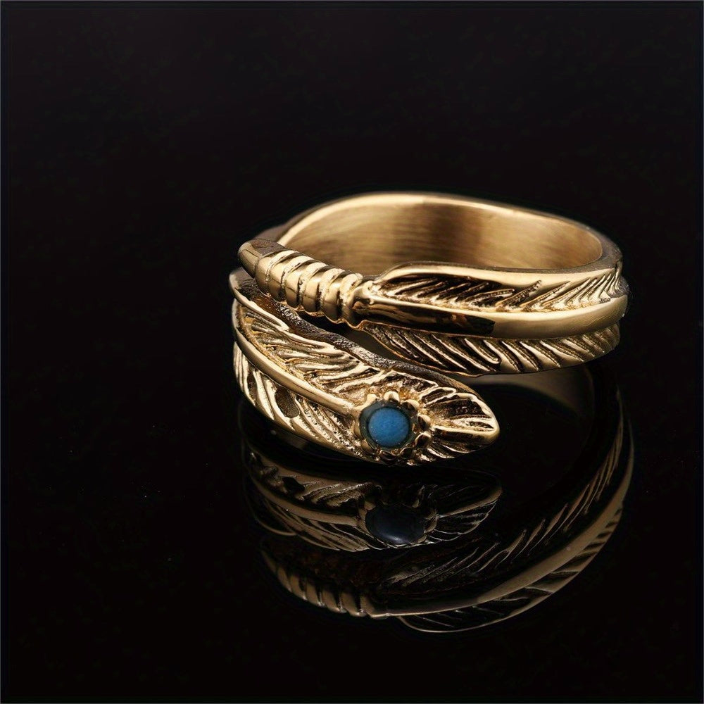 This ring is crafted from high-quality Ti 316L stainless steel and features a natural stone feather design in gold. Suitable for both men and women.