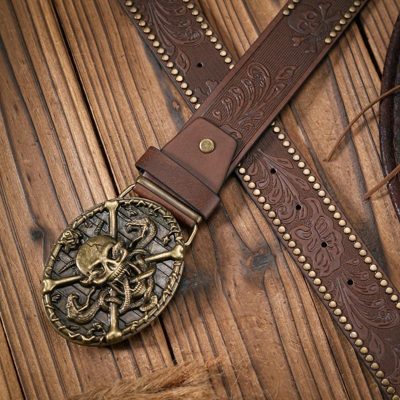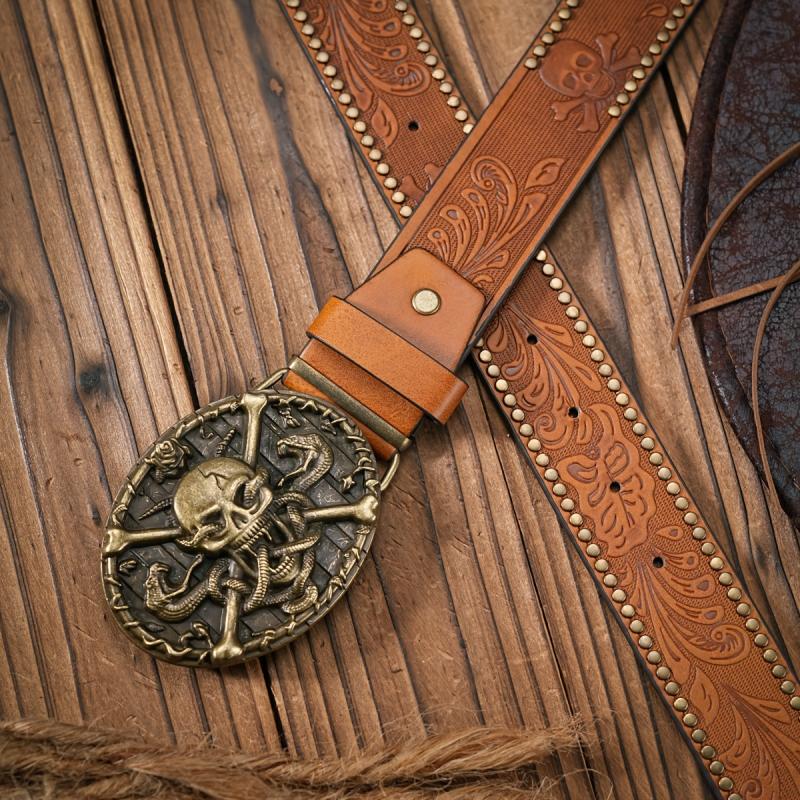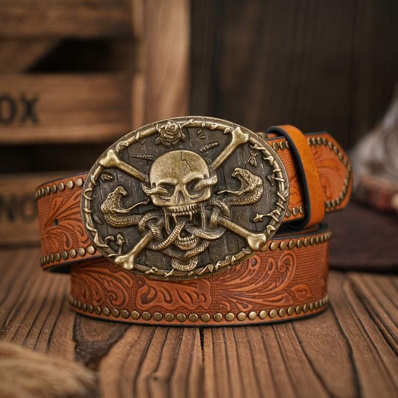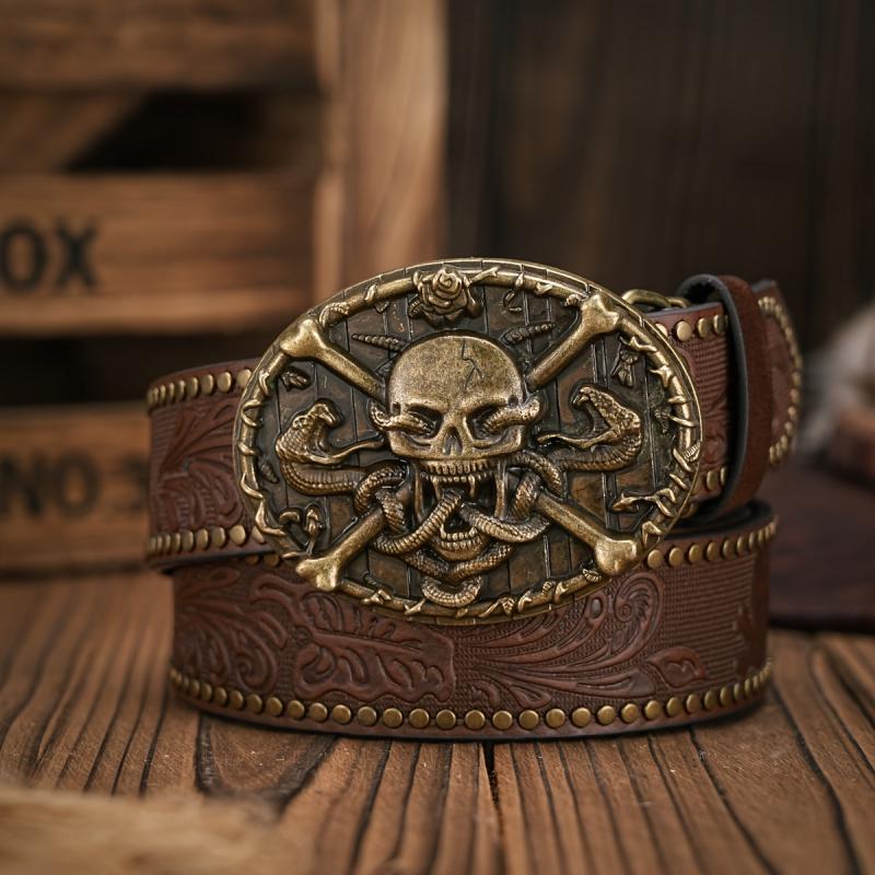 Add a touch of bold western flair to your outfit with this vintage brown PU belt featuring a skull embossed metal buckle.