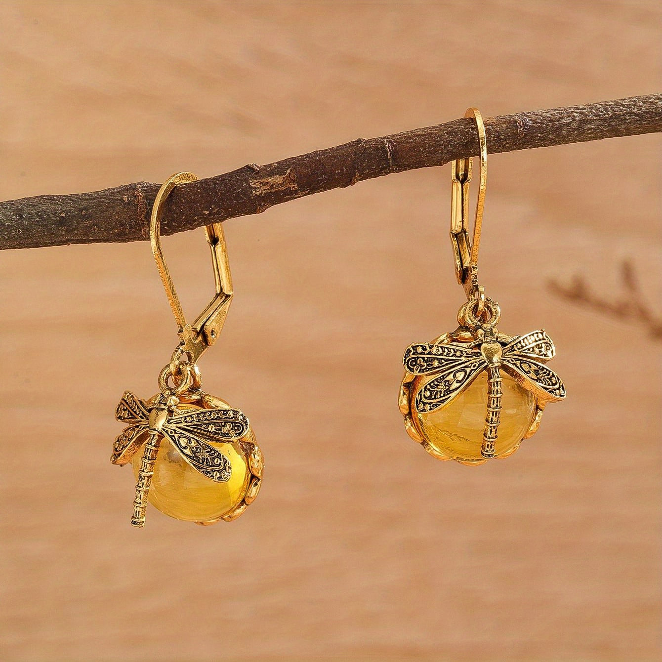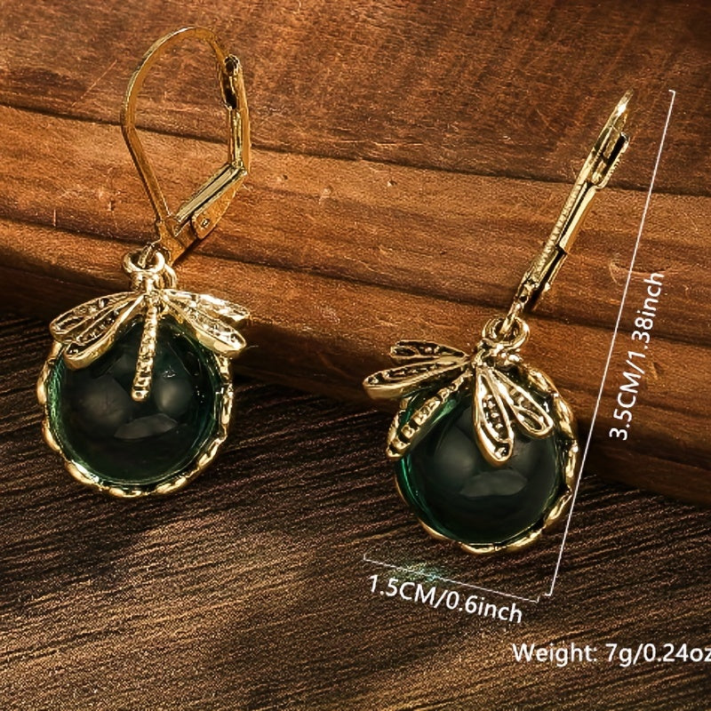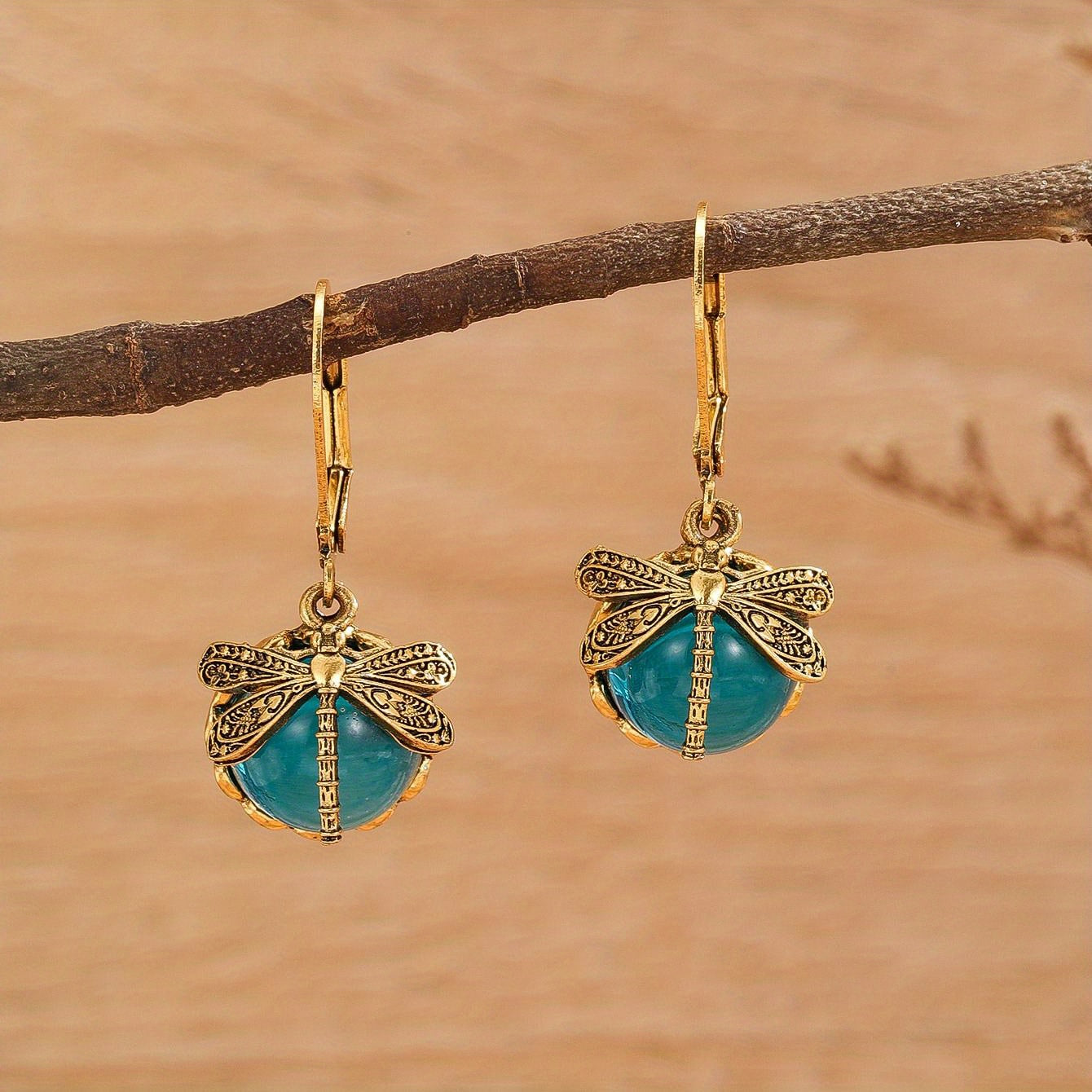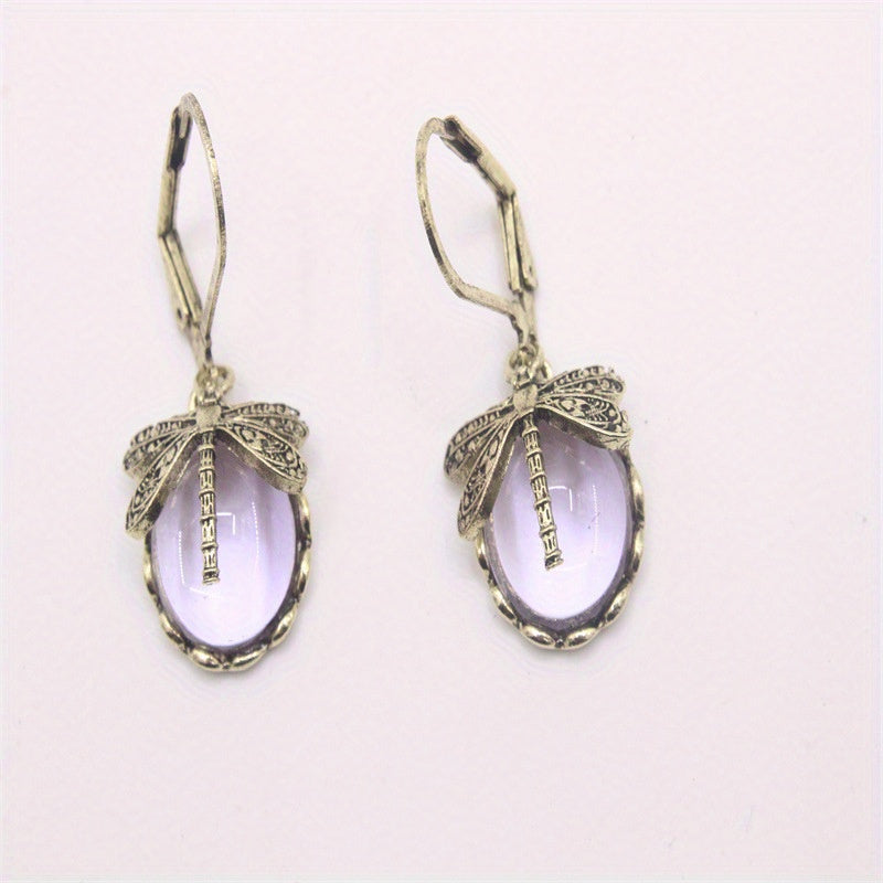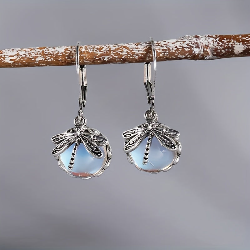 These vintage dragonfly earrings feature moonstone glass rounds, making them a unique and elegant accessory. Perfect for women looking to add a touch of nature-inspired style to their outfit.