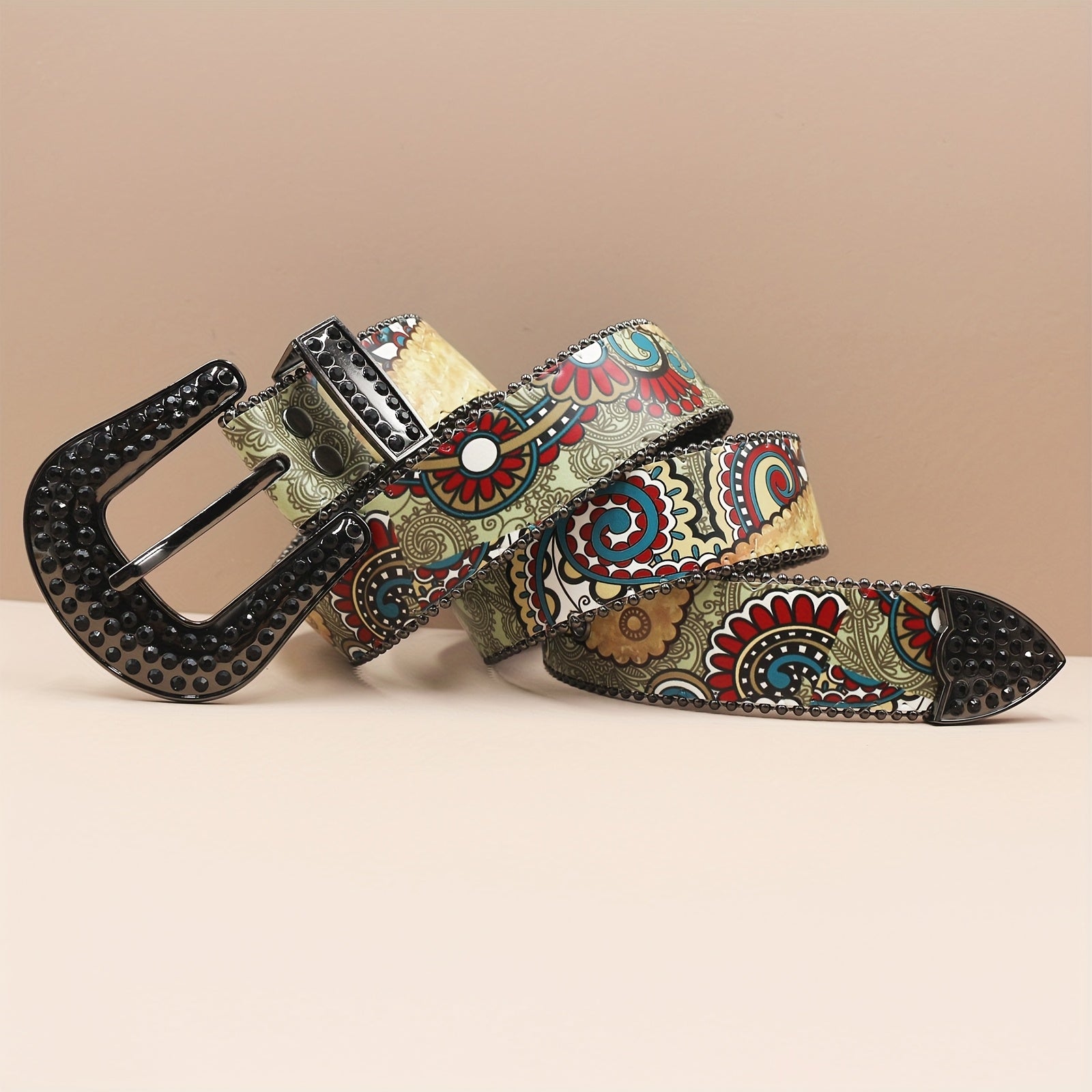 • Vintage-inspired belt with ethnic print and rhinestones
