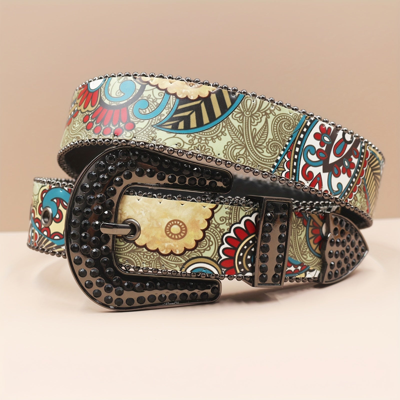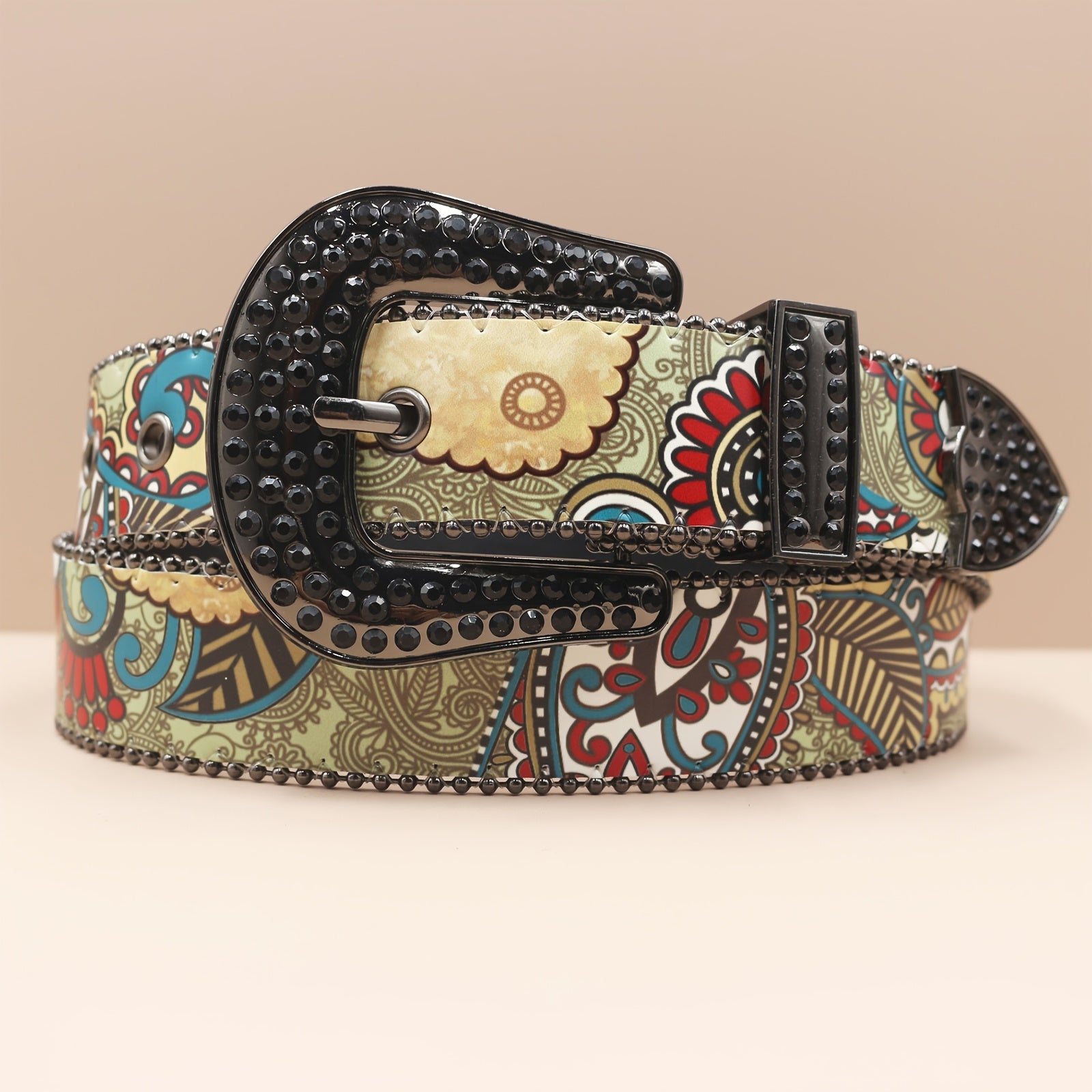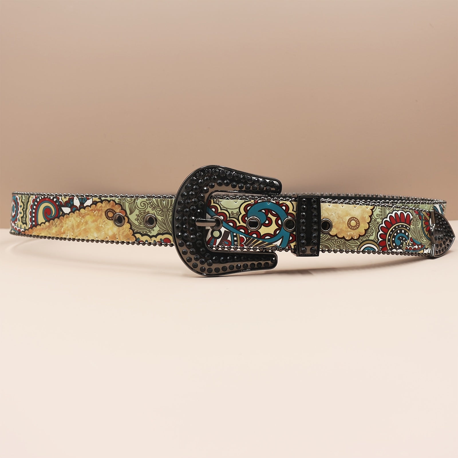 Add a touch of rebellious punk rock style to your outfit with this vintage-inspired belt featuring ethnic print, rhinestones, western buckle, and colorful patterns. Made of faux leather with sequins, this wide belt is a unique accessory for any fashion lover.