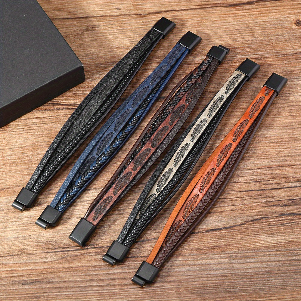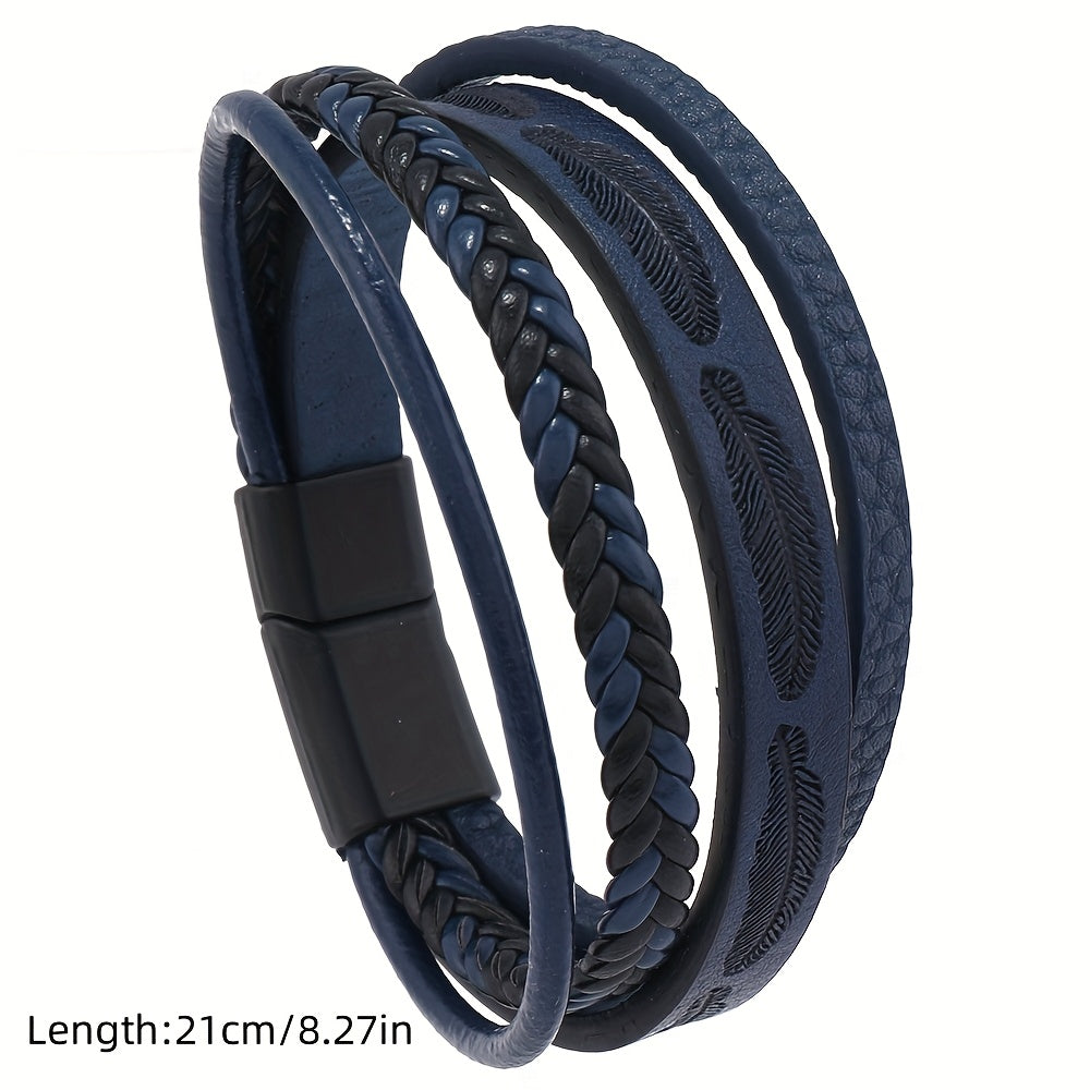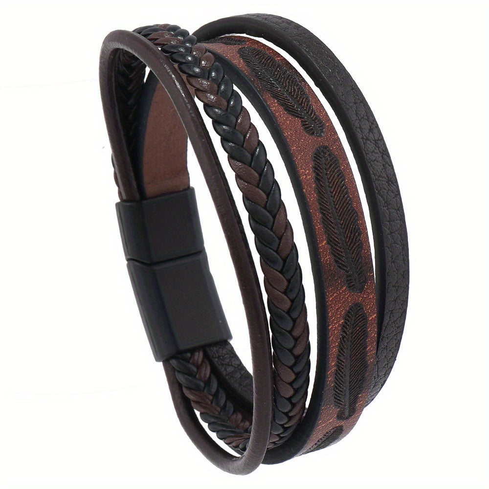 This woven bracelet features a feather pattern and punk style, perfect for casual attire. It is made of faux leather, ideal for a bohemian accessory. The adjustable design allows for a comfortable fit.