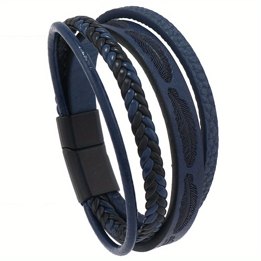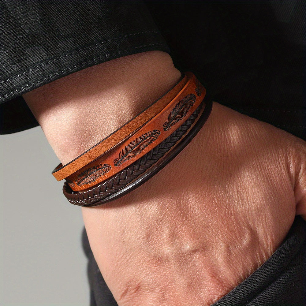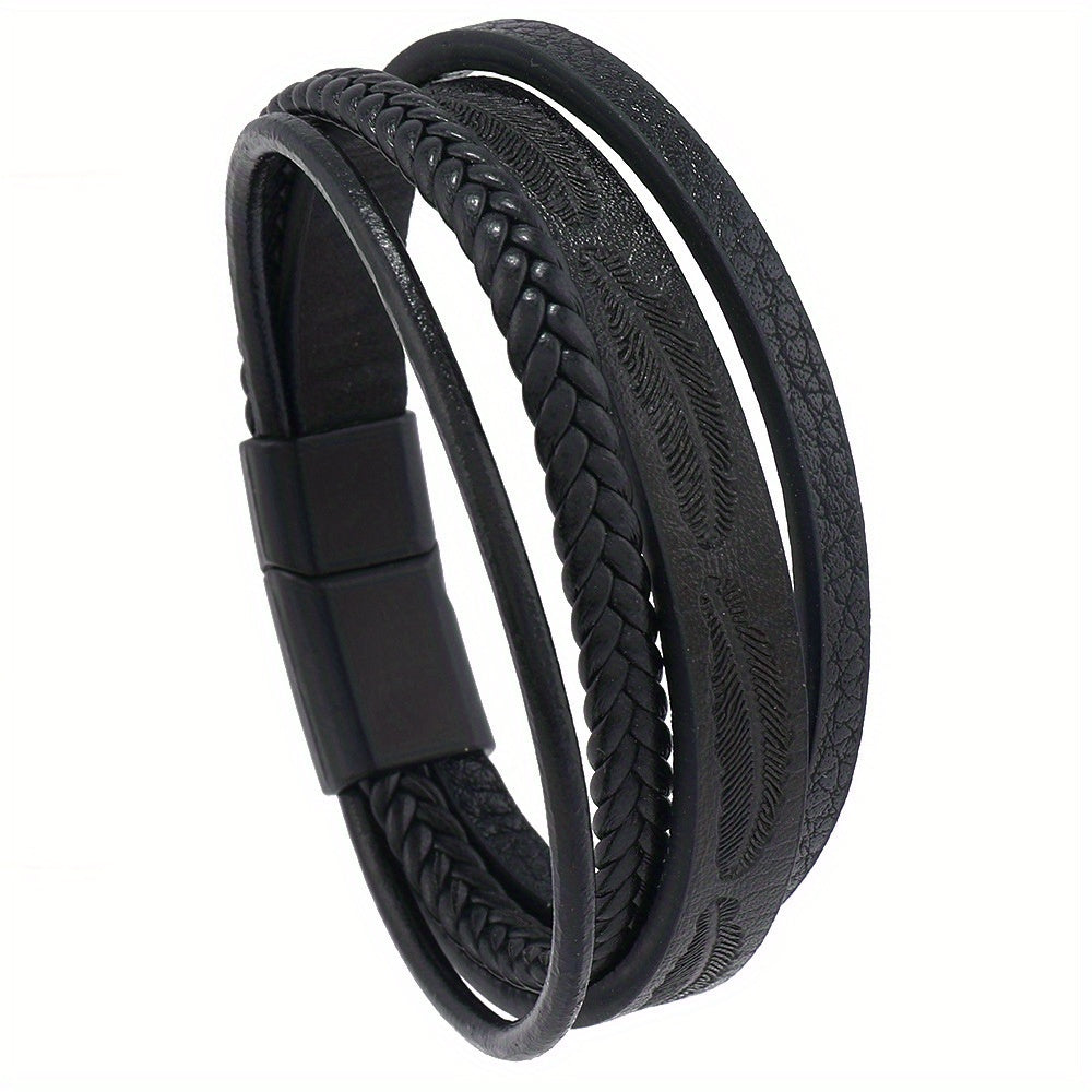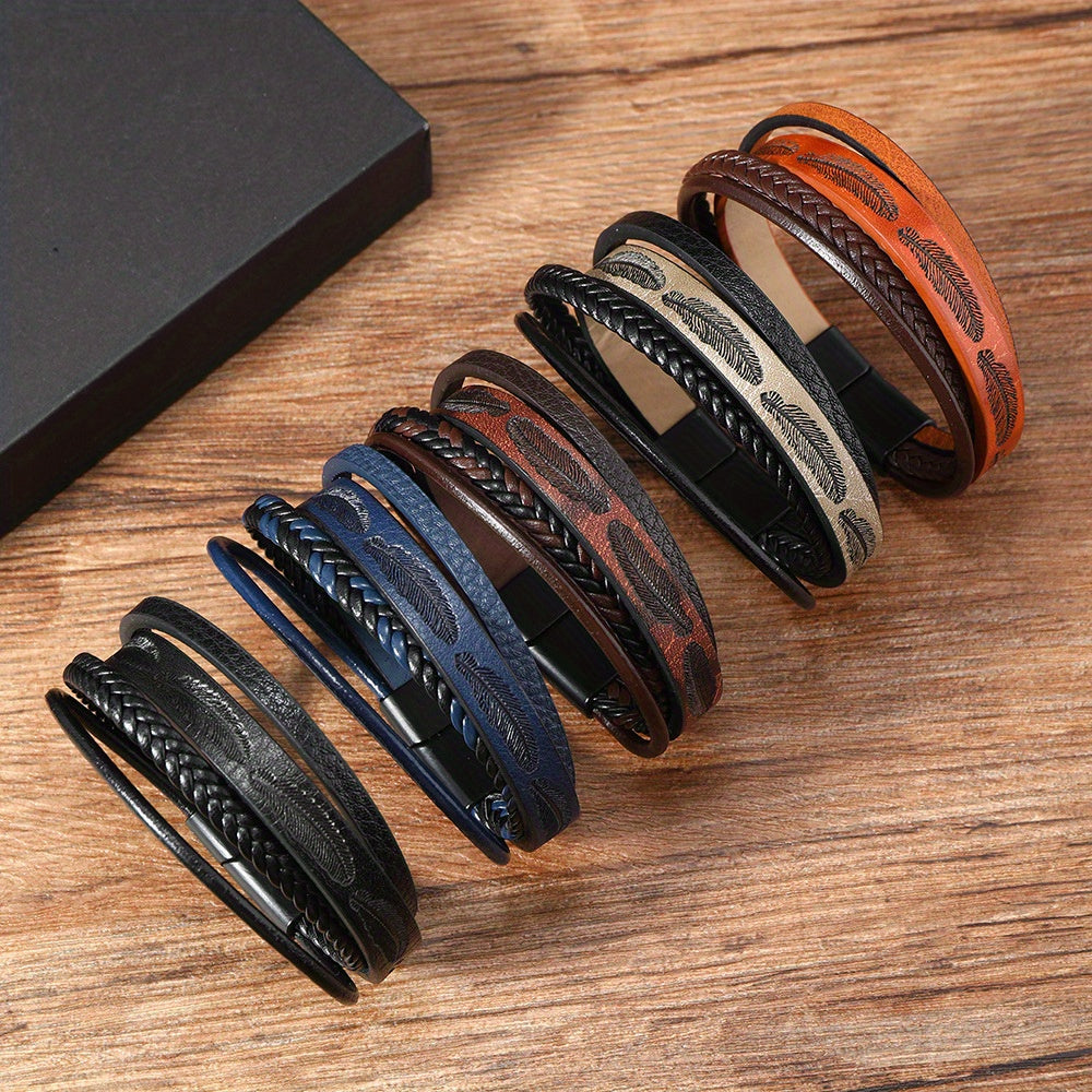 This woven bracelet features a feather pattern and punk style, perfect for casual attire. It is made of faux leather, ideal for a bohemian accessory. The adjustable design allows for a comfortable fit.
