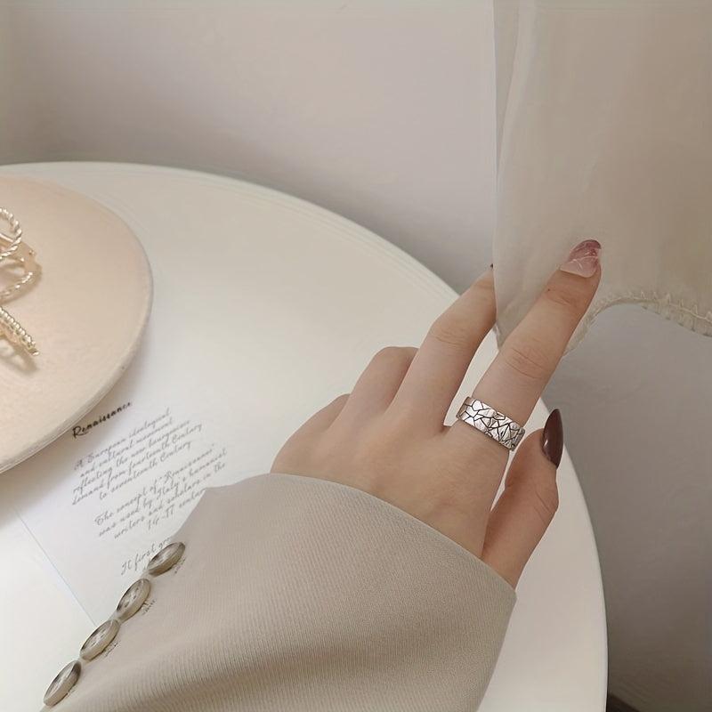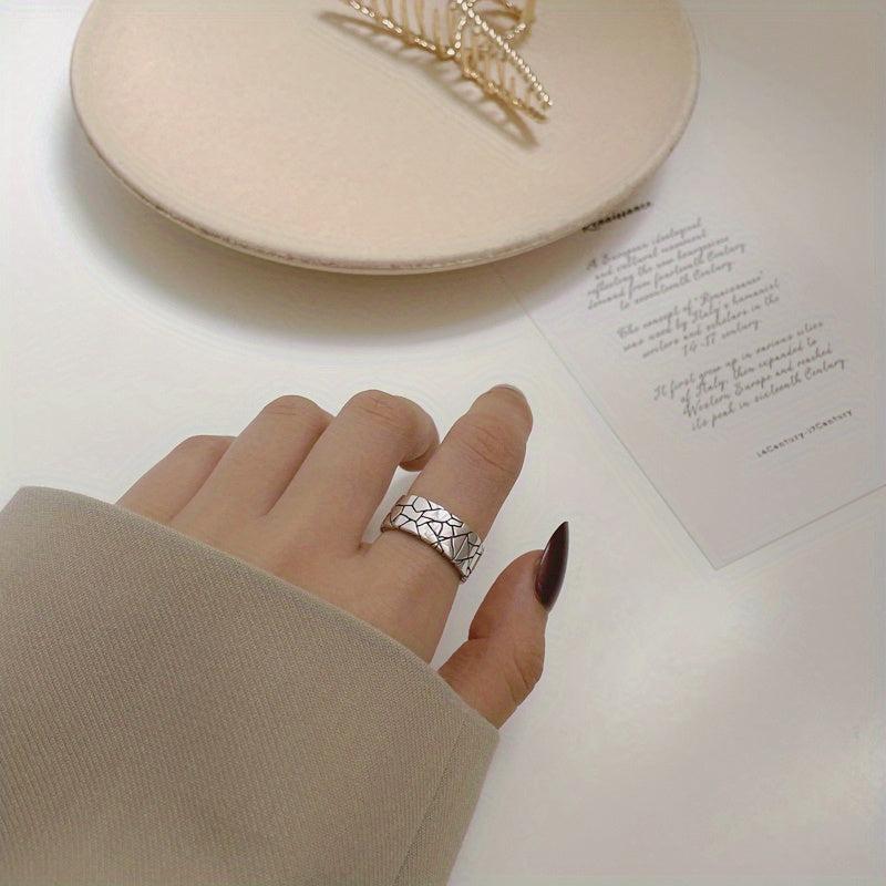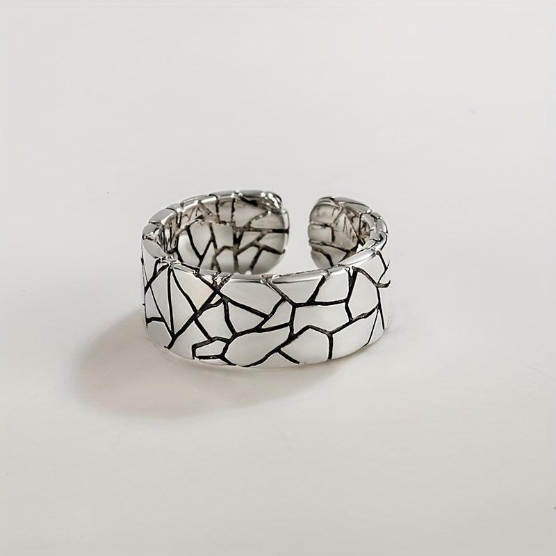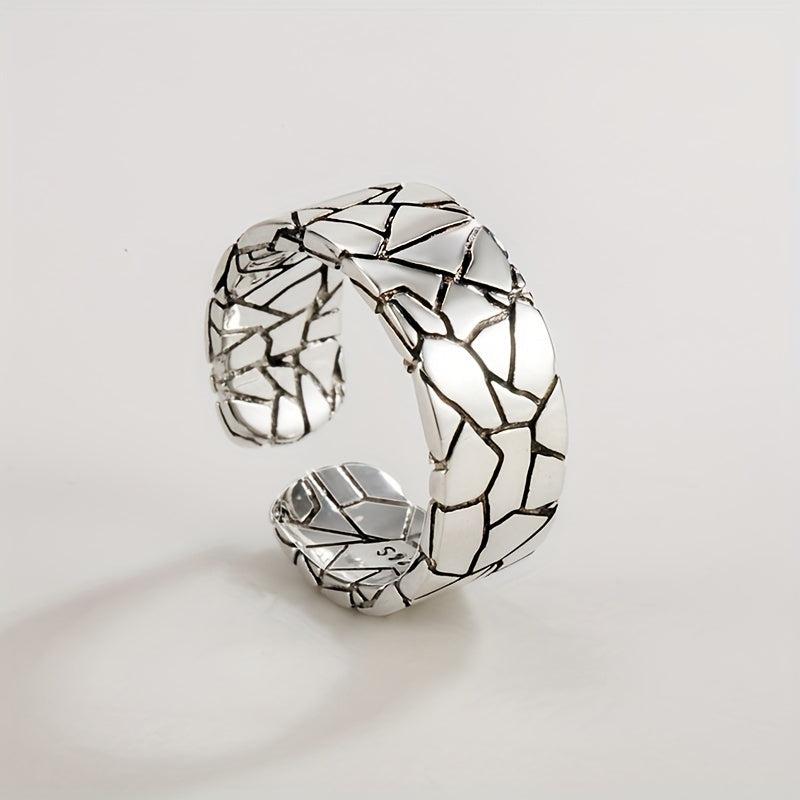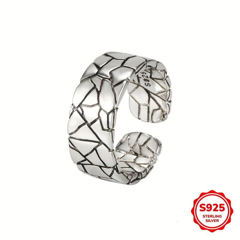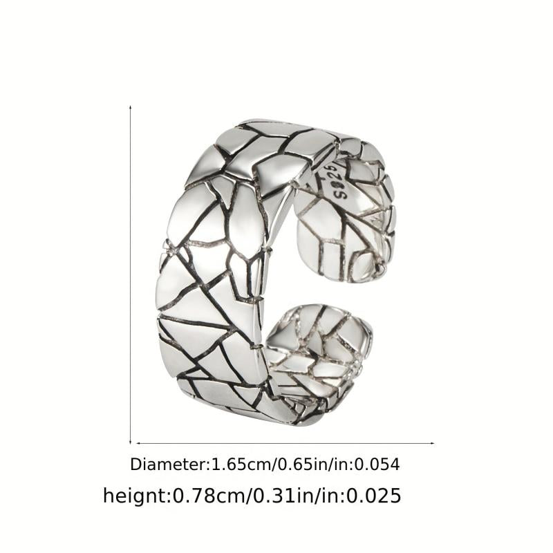This vintage ring features a heavy-duty wide face with a stone pattern crack design. Made of pure S925 silvery metal, it exudes personality and hip hop style. The net weight is 5.90g.