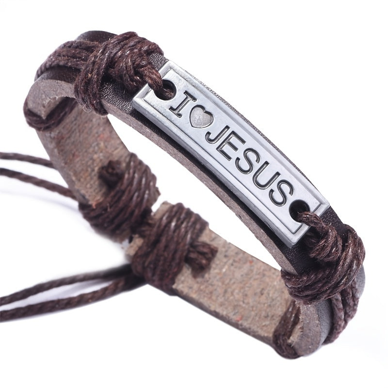 This vintage leather bracelet features a cross design with the message 'I Love Jesus'. Perfect for expressing your faith and style.