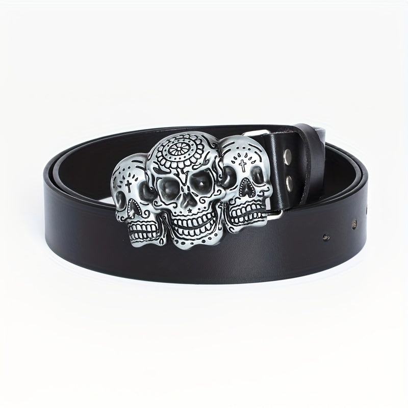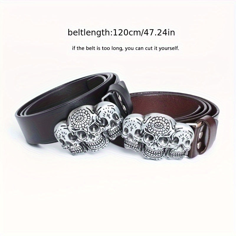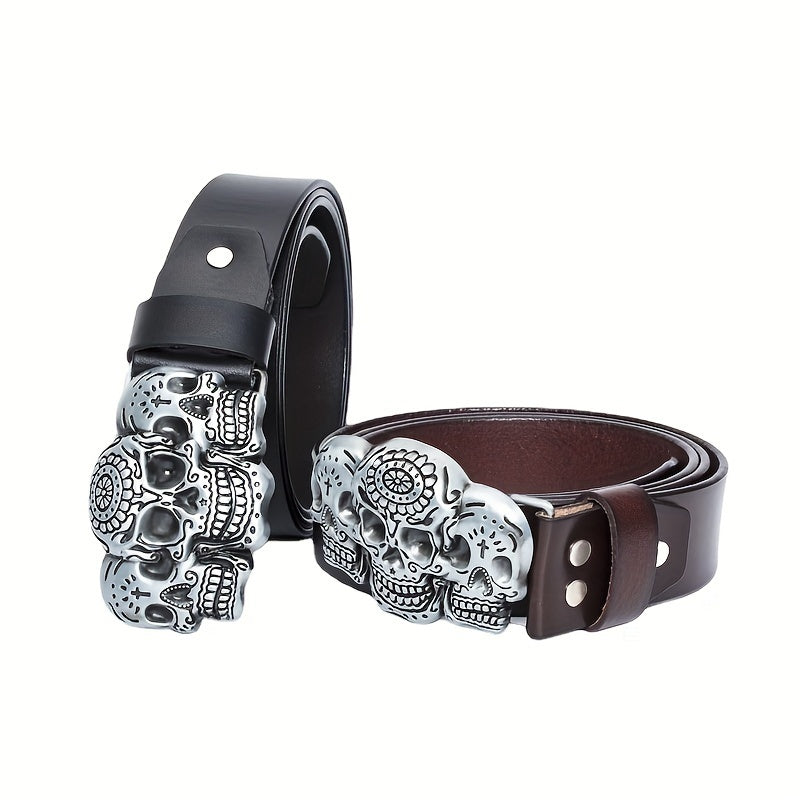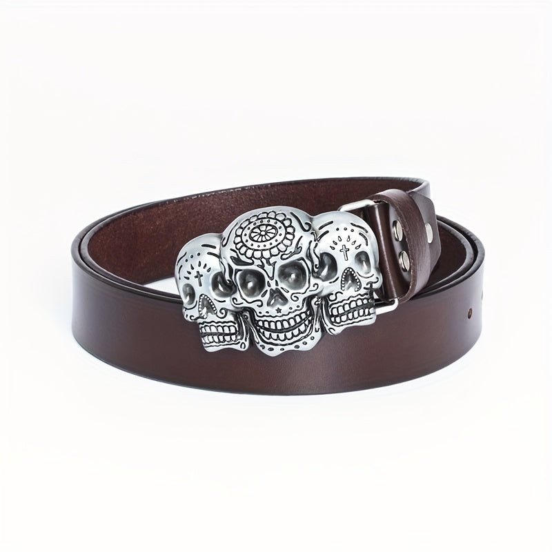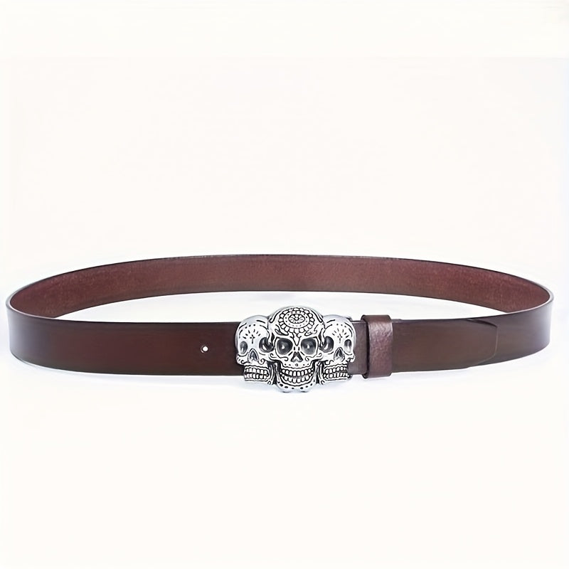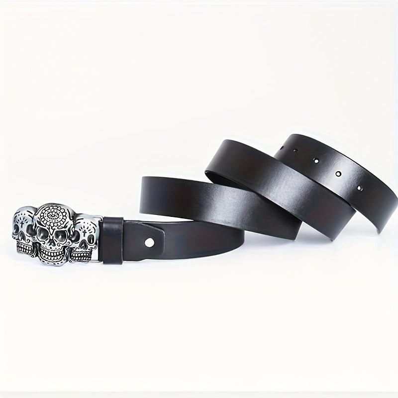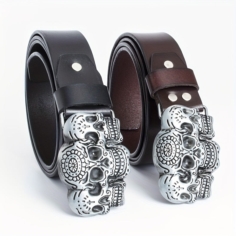 This vintage leather belt features a cool knight skull pattern with a flat buckle, perfect for street style, punk, or hip hop fashion.