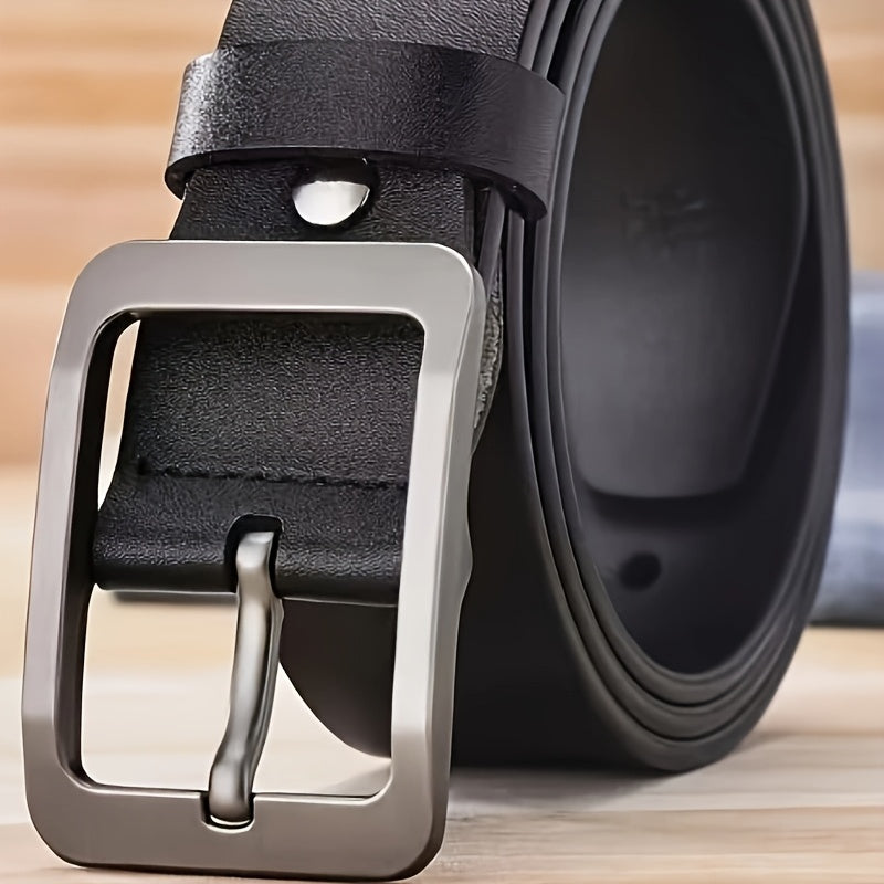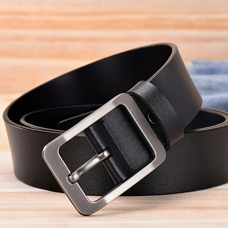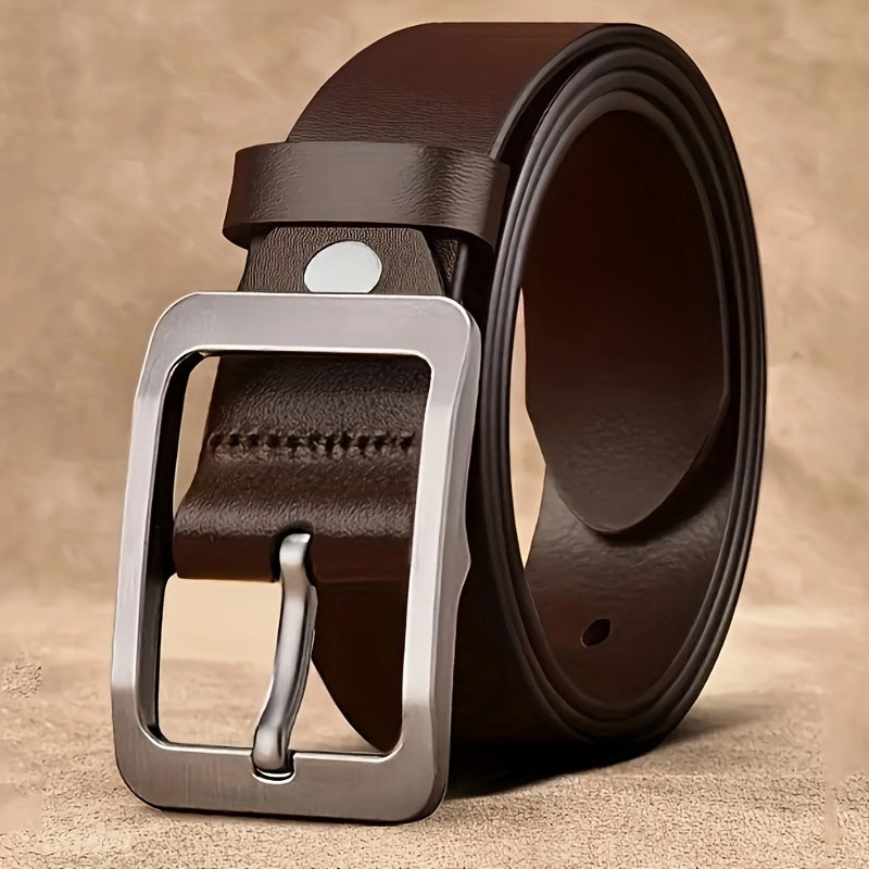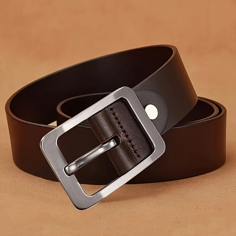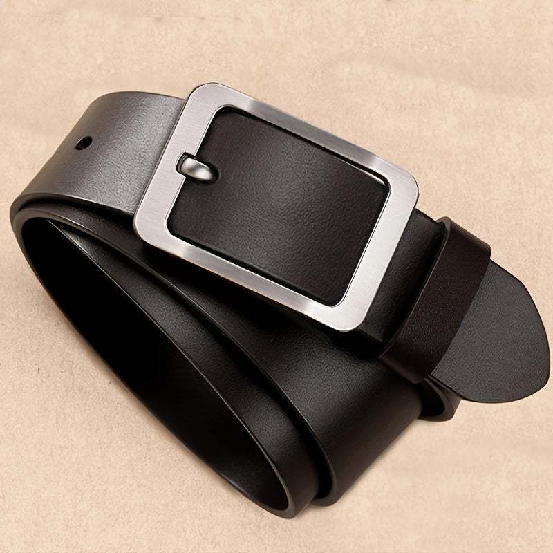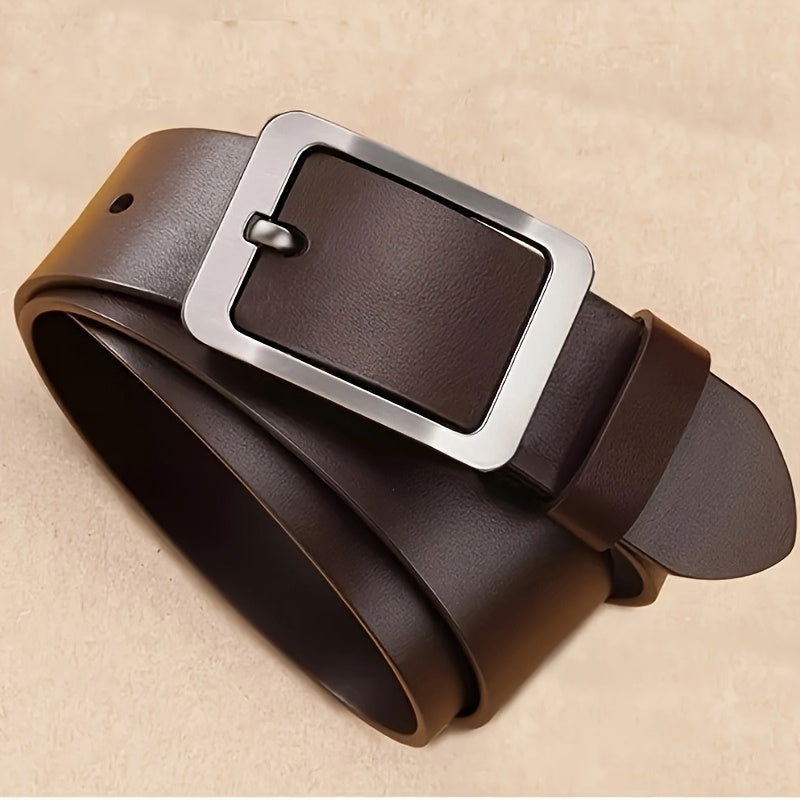 This men's leather belt features a silvery alloy buckle, perfect for both men and women. Available in multiple sizes and colors, it adds a touch of classic style to any outfit.