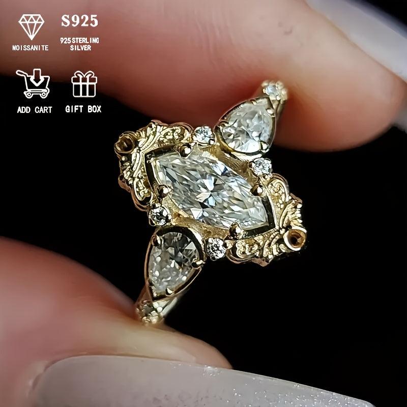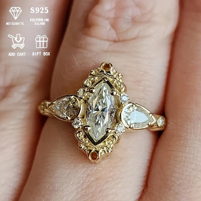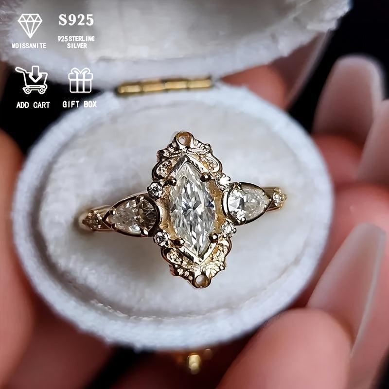 Elegant vintage-inspired marquise ring for women made of 4g S925 silver with 1ct moissanite stone and golden tone accents. Perfect for engagement, wedding, anniversary, Mother's Day, and Valentine's Day.
