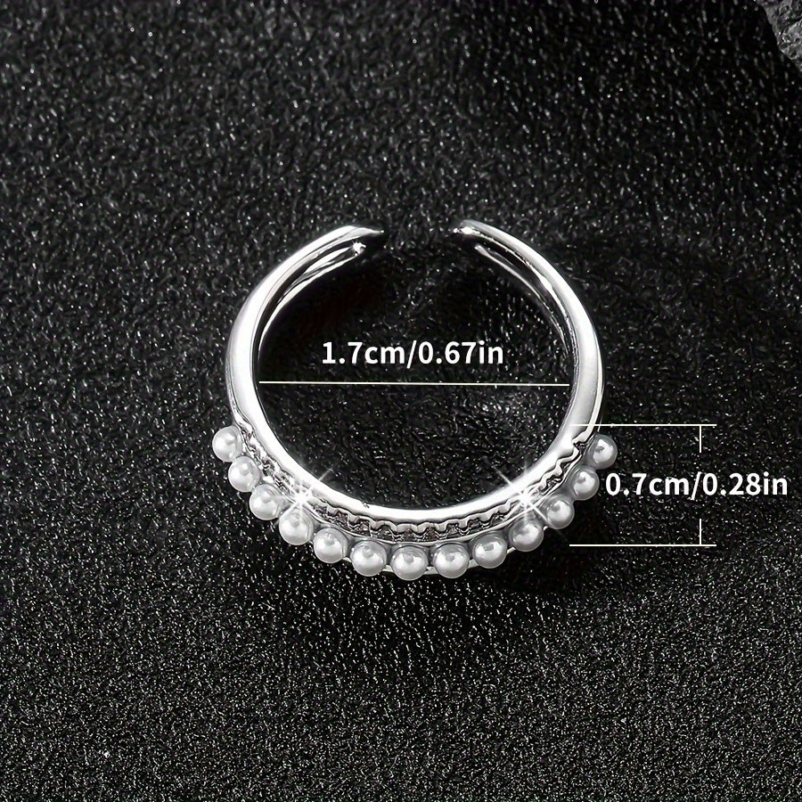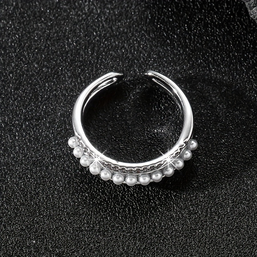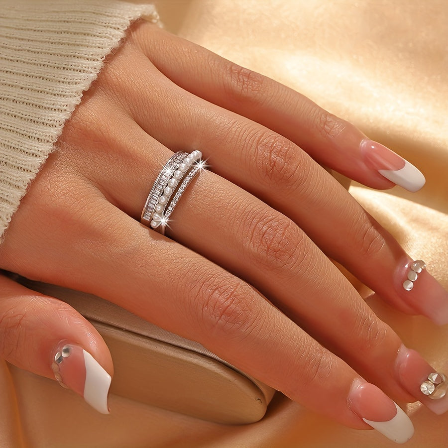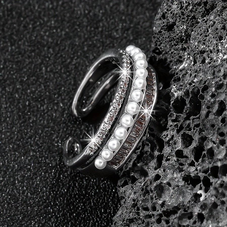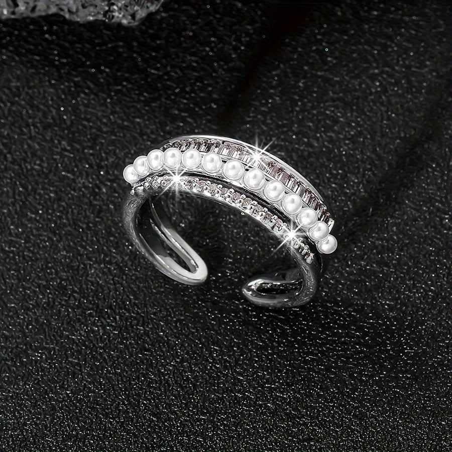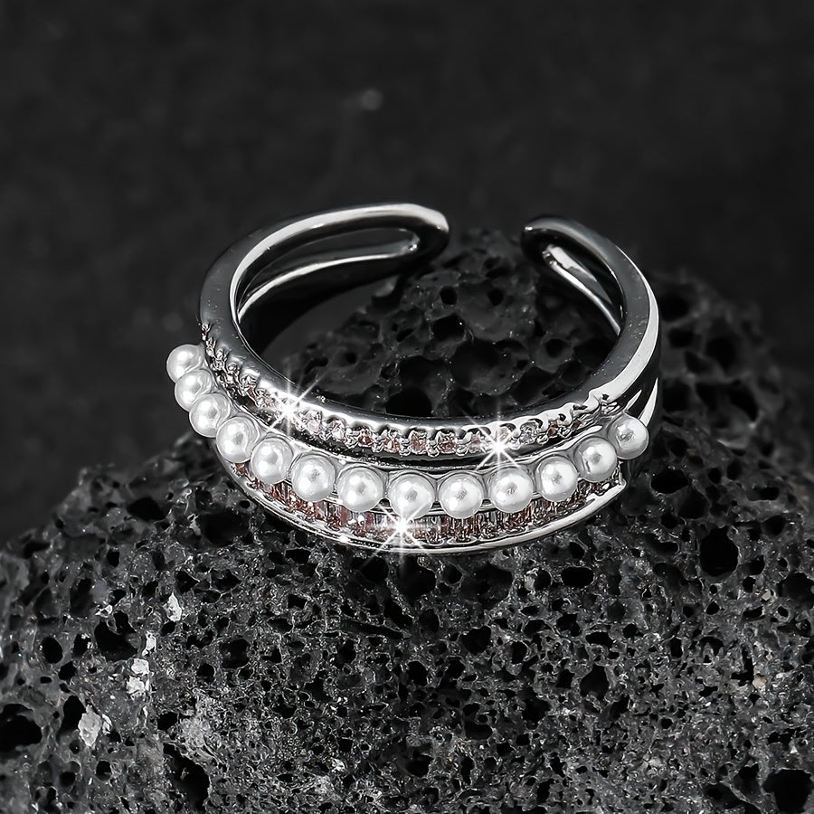 Elevate your style with this vintage open ring featuring three layers of synthetic zirconia and a pearl on a copper base adorned with rhinestones. Perfect for daily wear all year round.