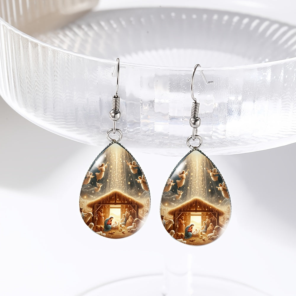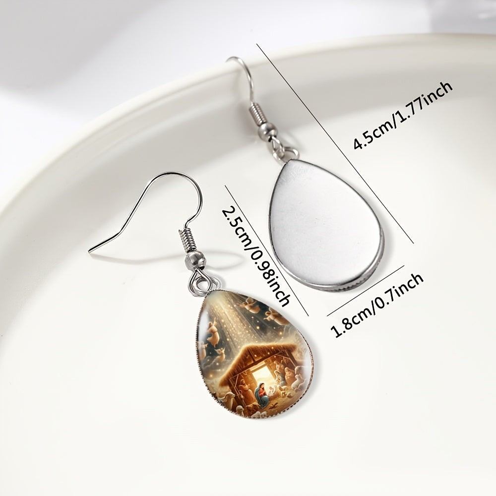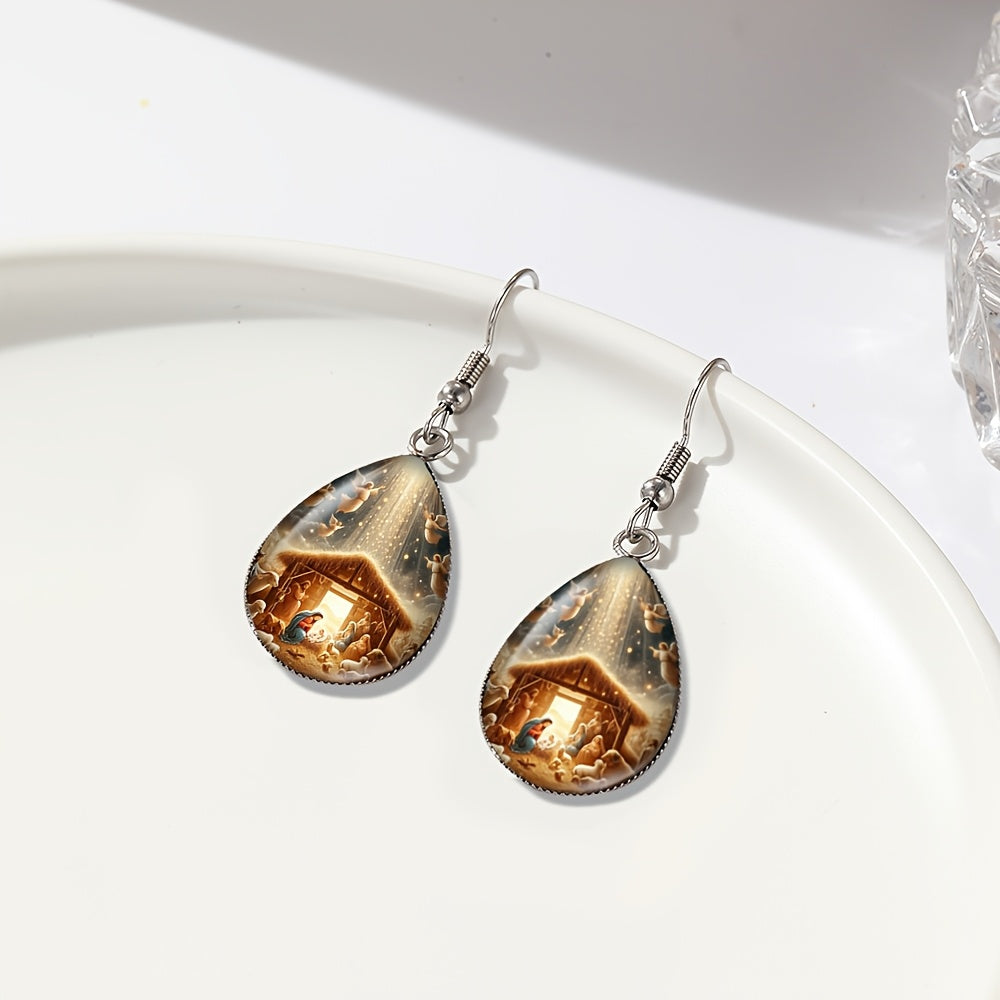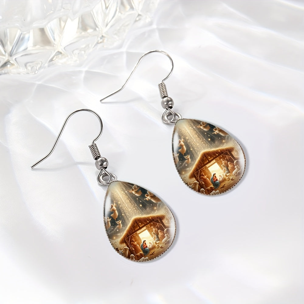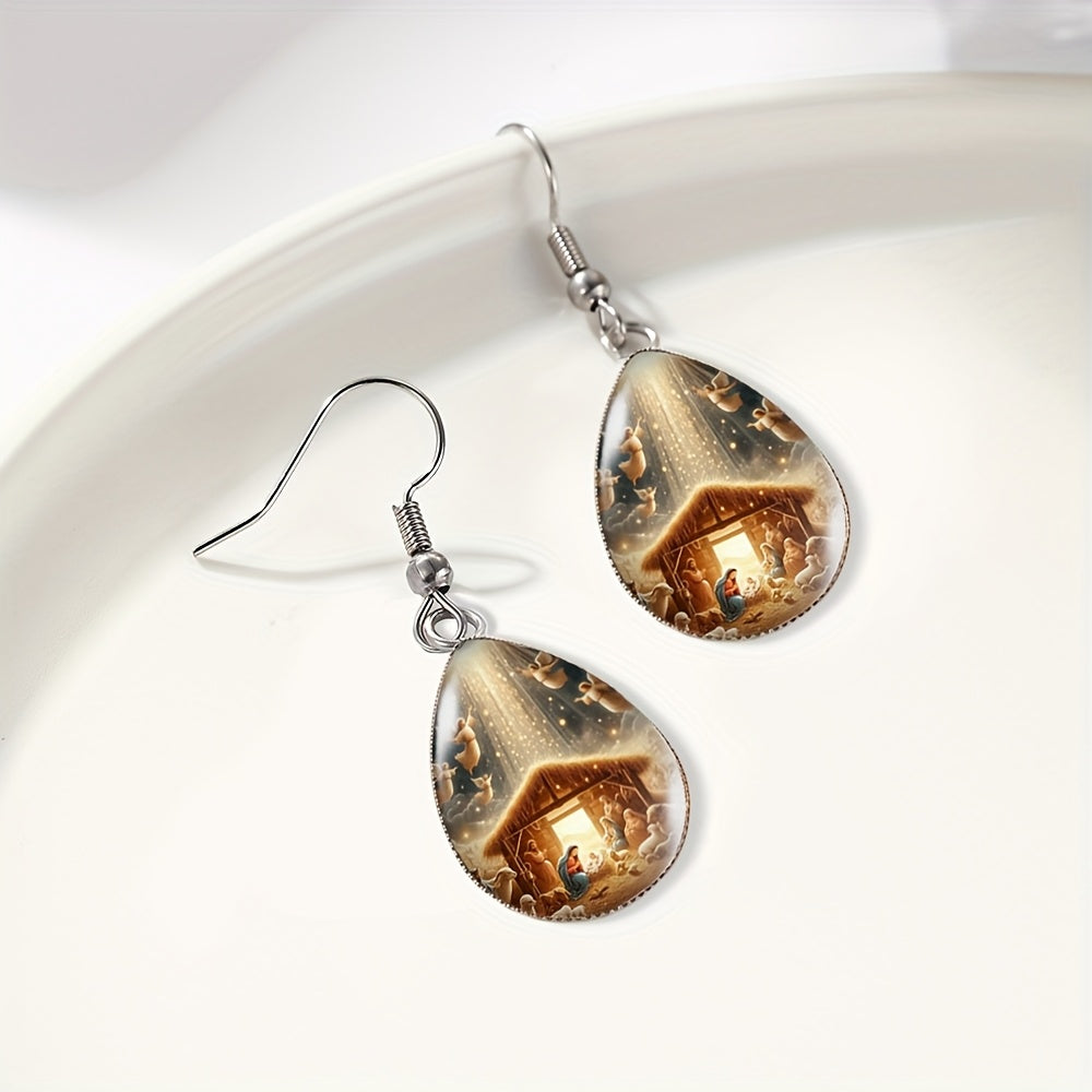 These festive vintage pendant earrings feature a handcrafted glass droplet with a scenic manger design. The earrings are hypoallergenic with stainless steel hooks, making them perfect for the holiday season.