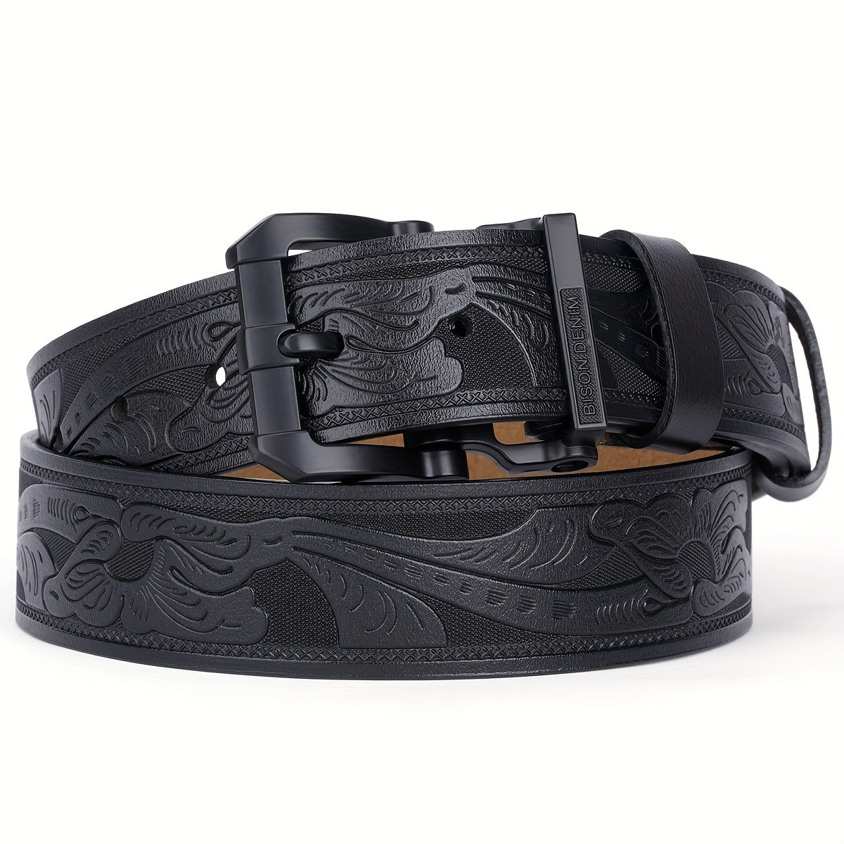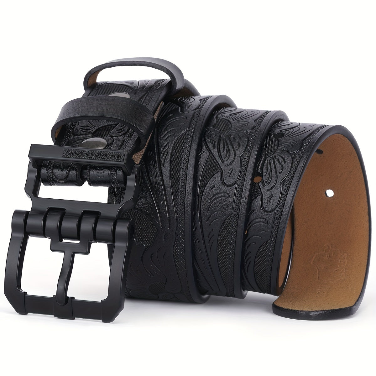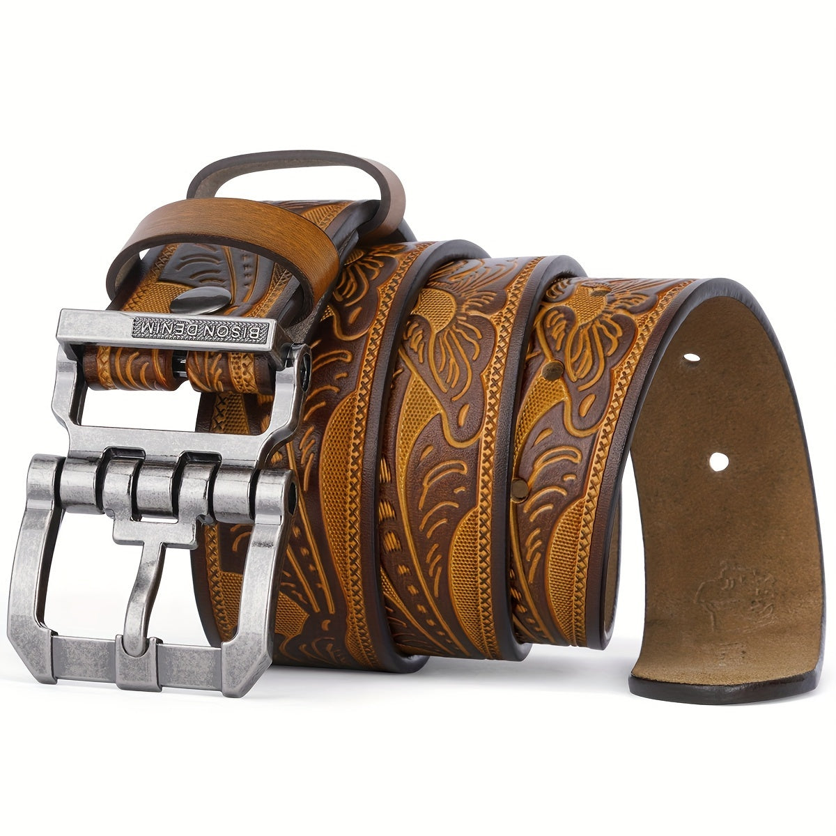 Cowhide leather belt with a vintage print and buckle, perfect for a Western cowboy look. Ideal holiday gift for men.