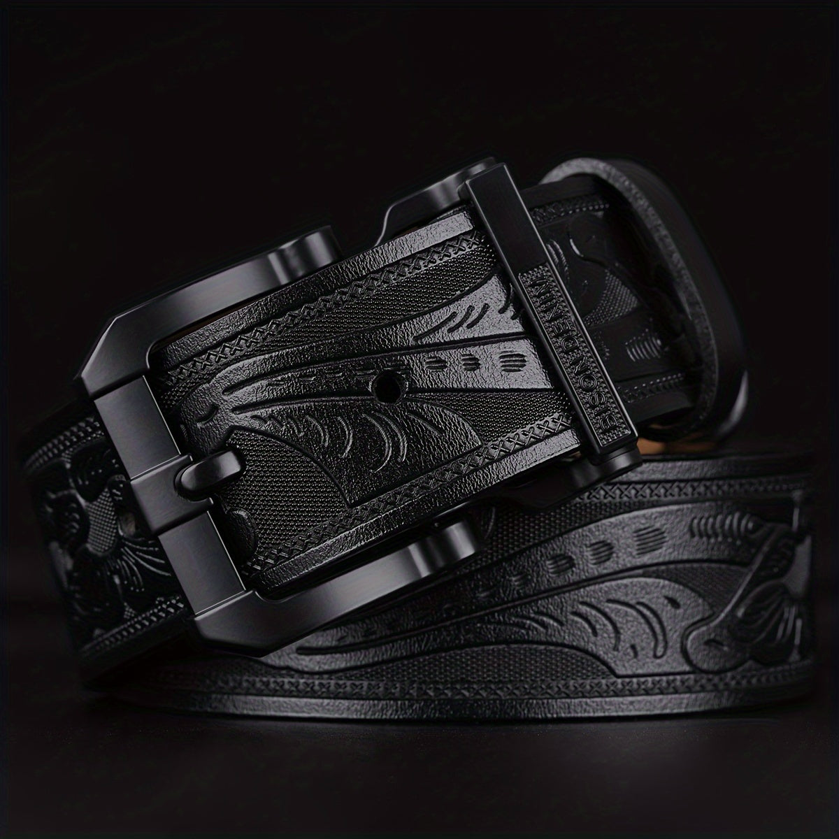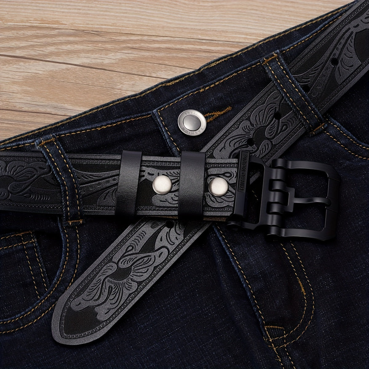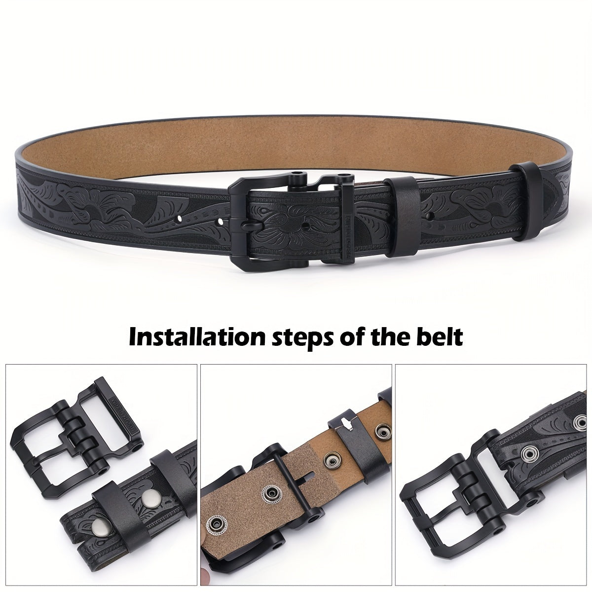 Cowhide leather belt with a vintage print and buckle, perfect for a Western cowboy look. Ideal holiday gift for men.