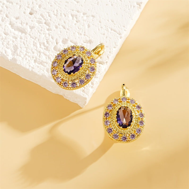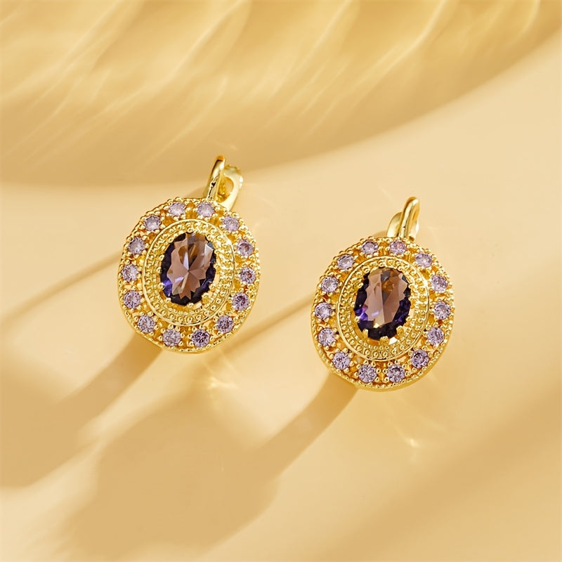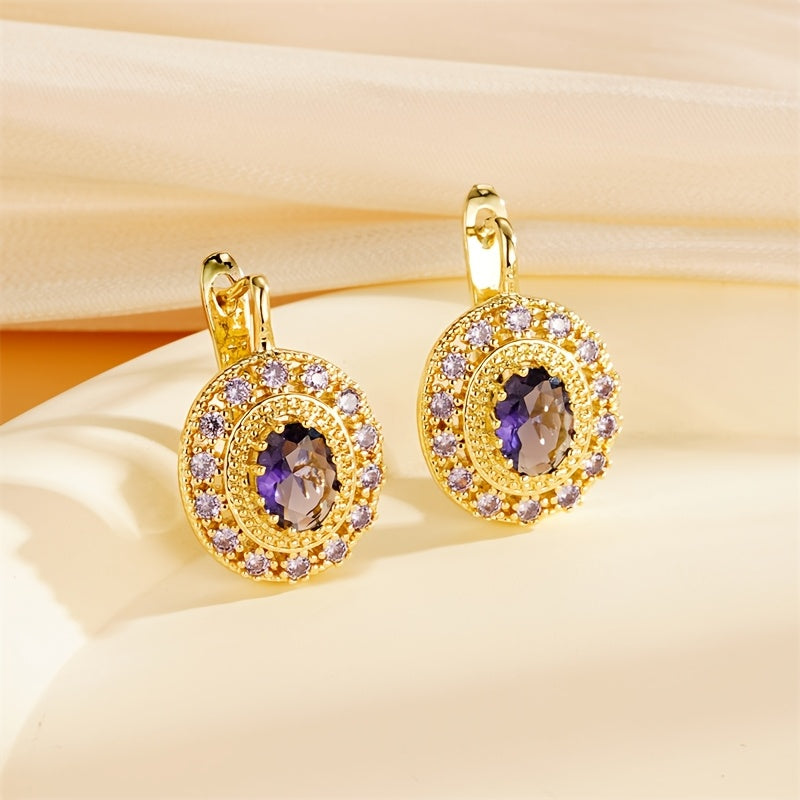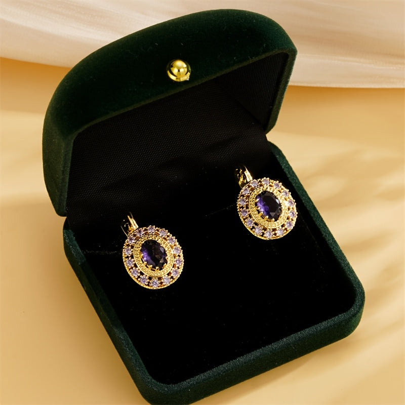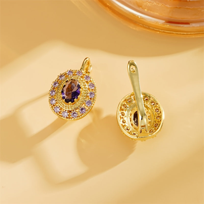 Elegant vintage round d-shaped earrings with a purple pattern design made of copper.