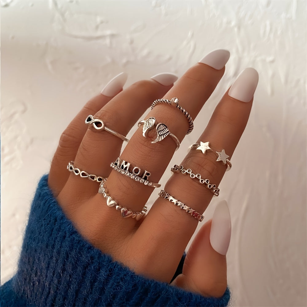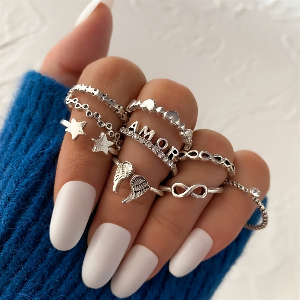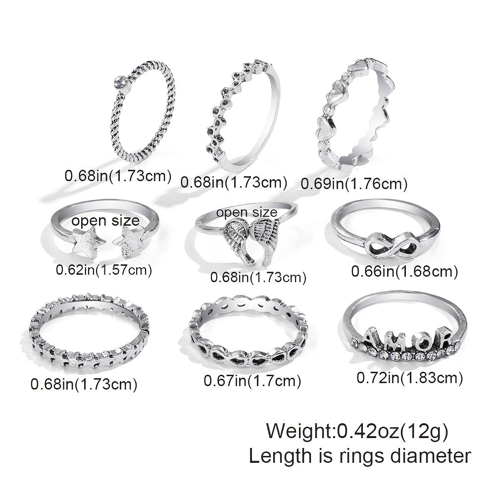 Add a touch of vintage charm with this 9-piece set featuring silver wing, heart, star, and letter rhinestone rings. Perfect for adding a sparkle to your outfit.