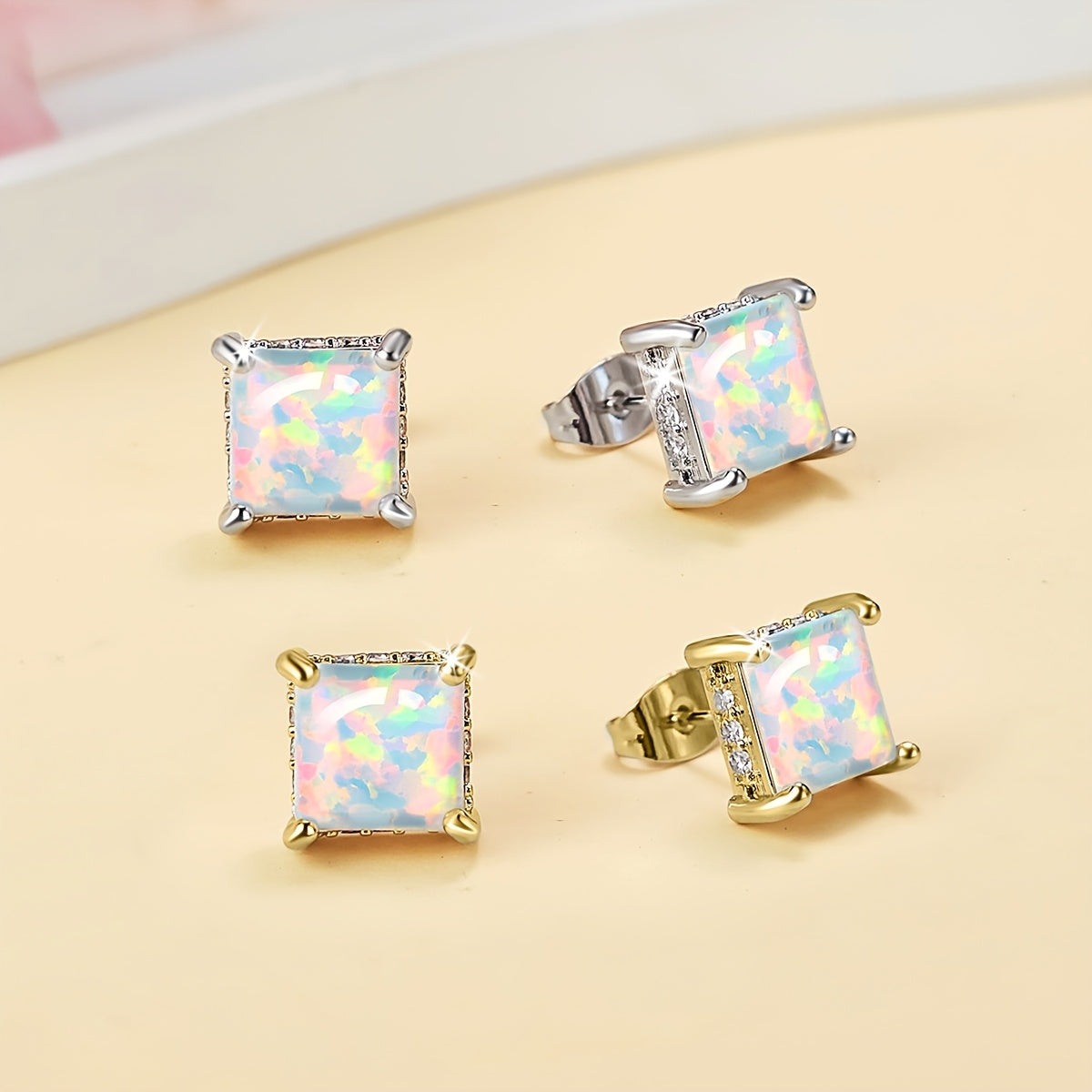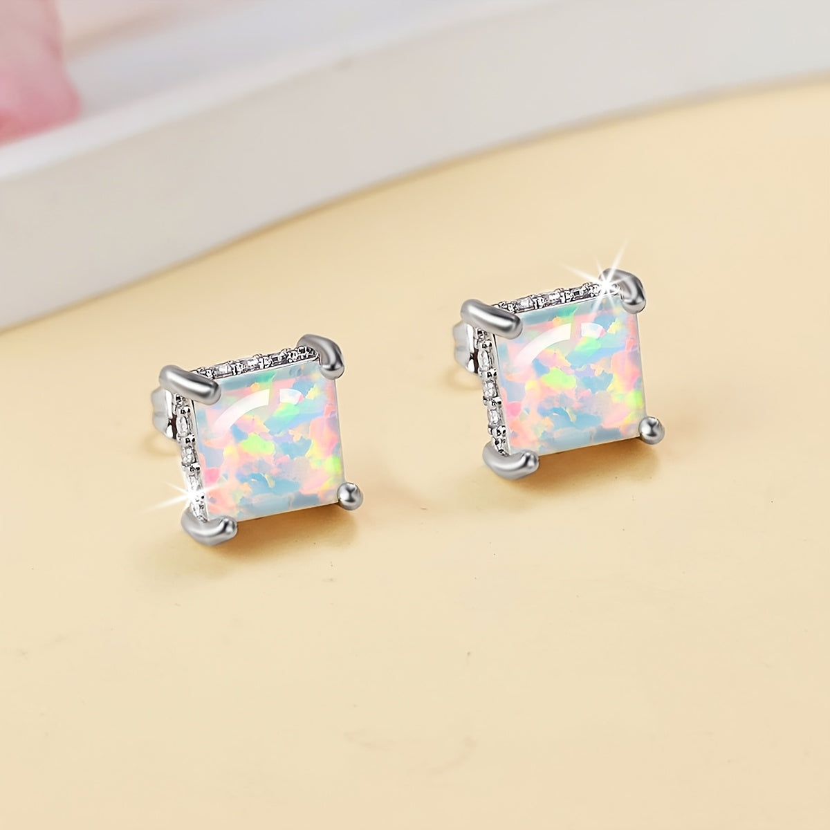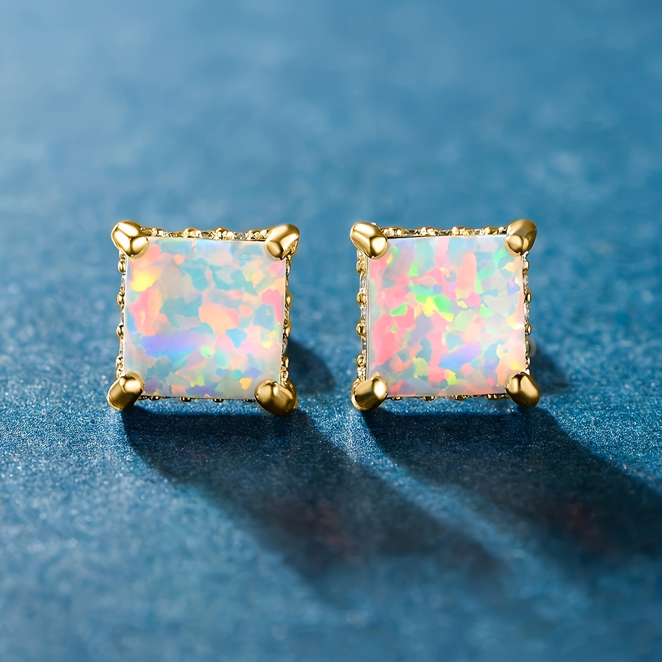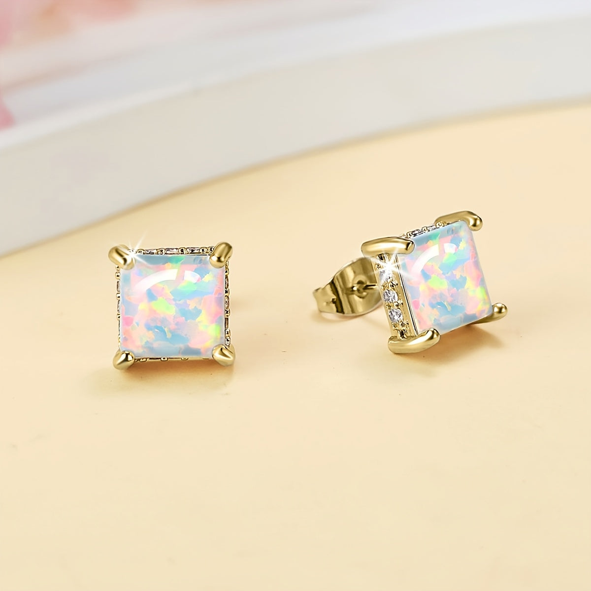Elegant square opal stud earrings with 18K golden plated copper. Perfect for those with an October birthday or anyone who loves opal jewelry.