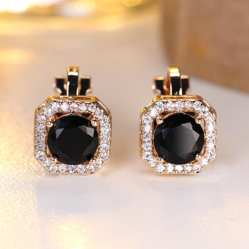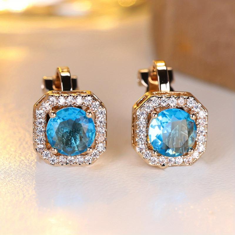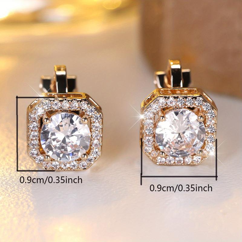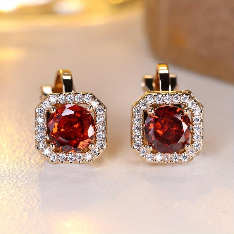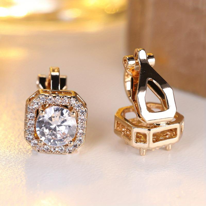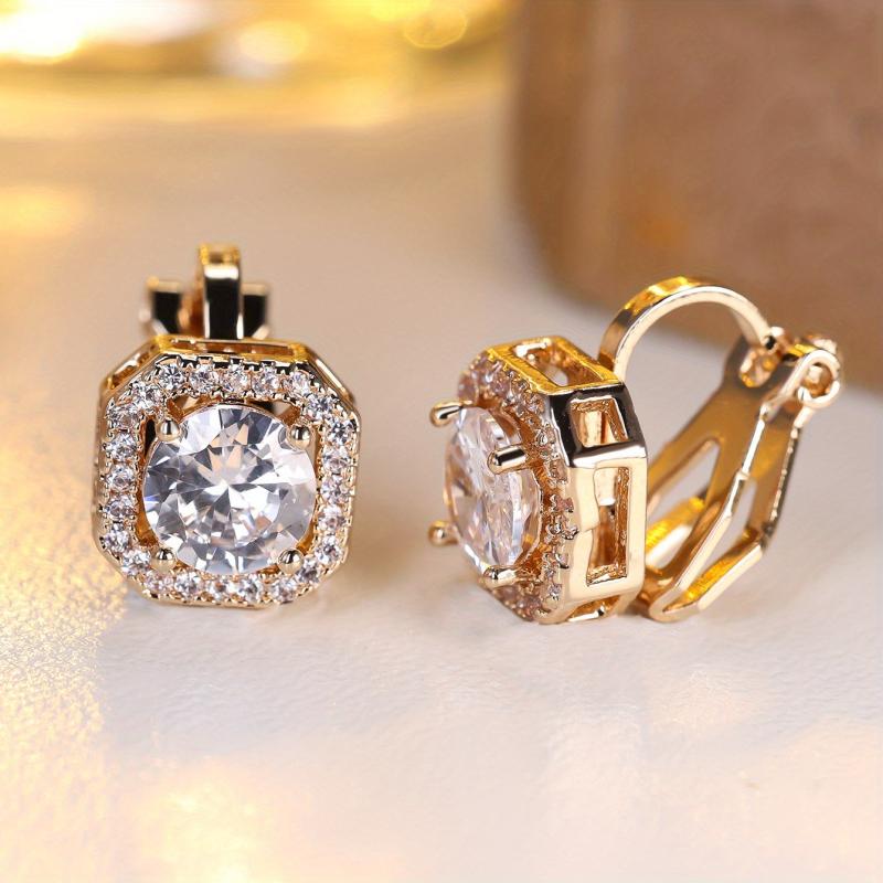 Elegant clip on earrings featuring a round synthetic zirconia center in a classic copper four prong setting with clear zirconia accents.