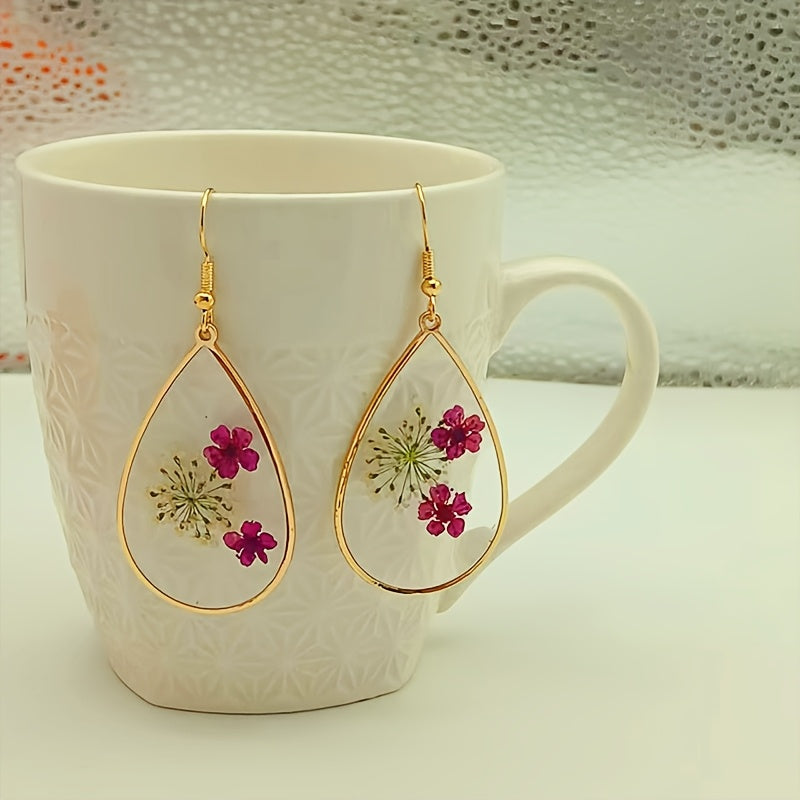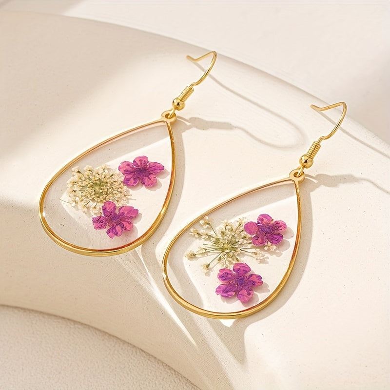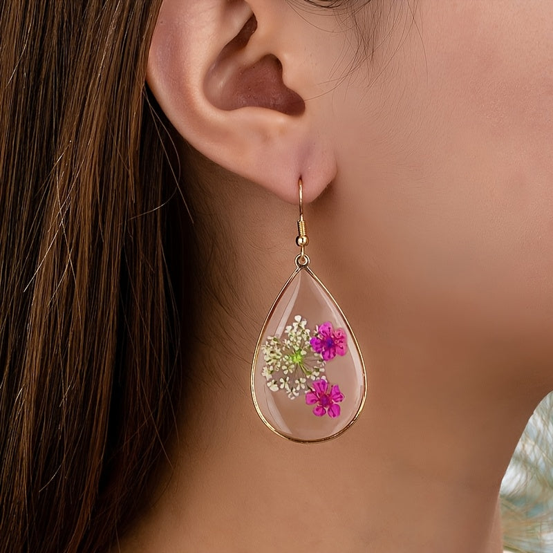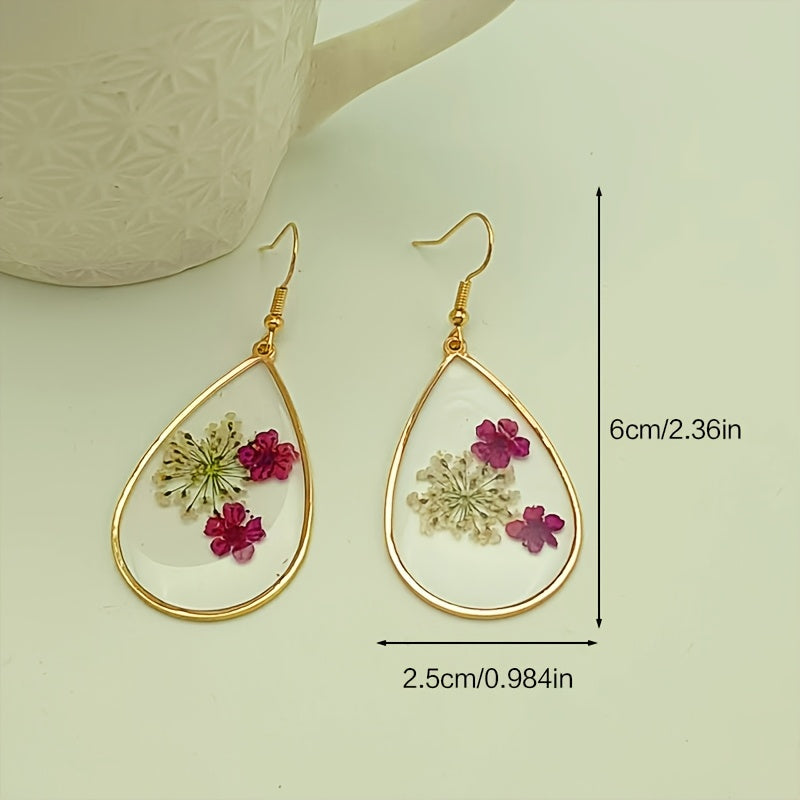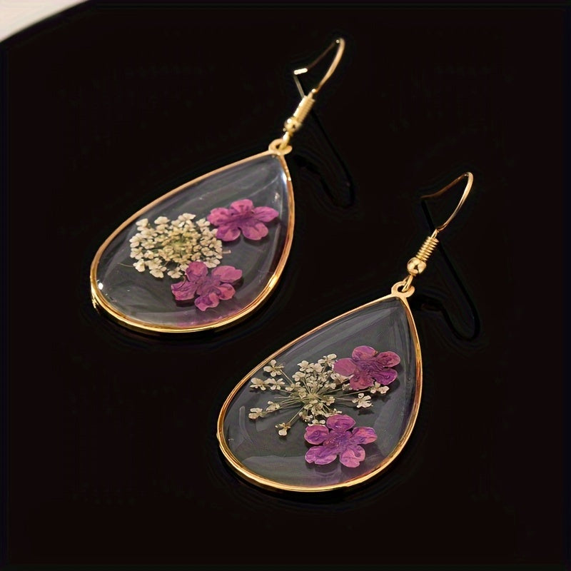 Elegant water drop earrings featuring unique vintage style resin adorned with dried flowers. The size and type of flowers are random, making each pair one-of-a-kind.