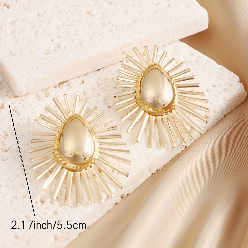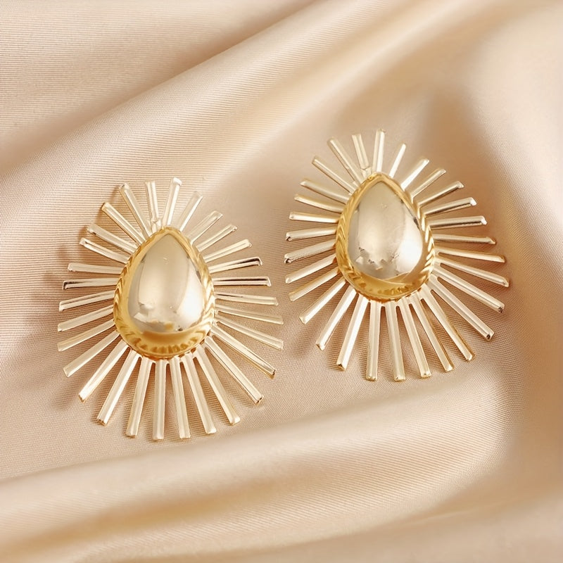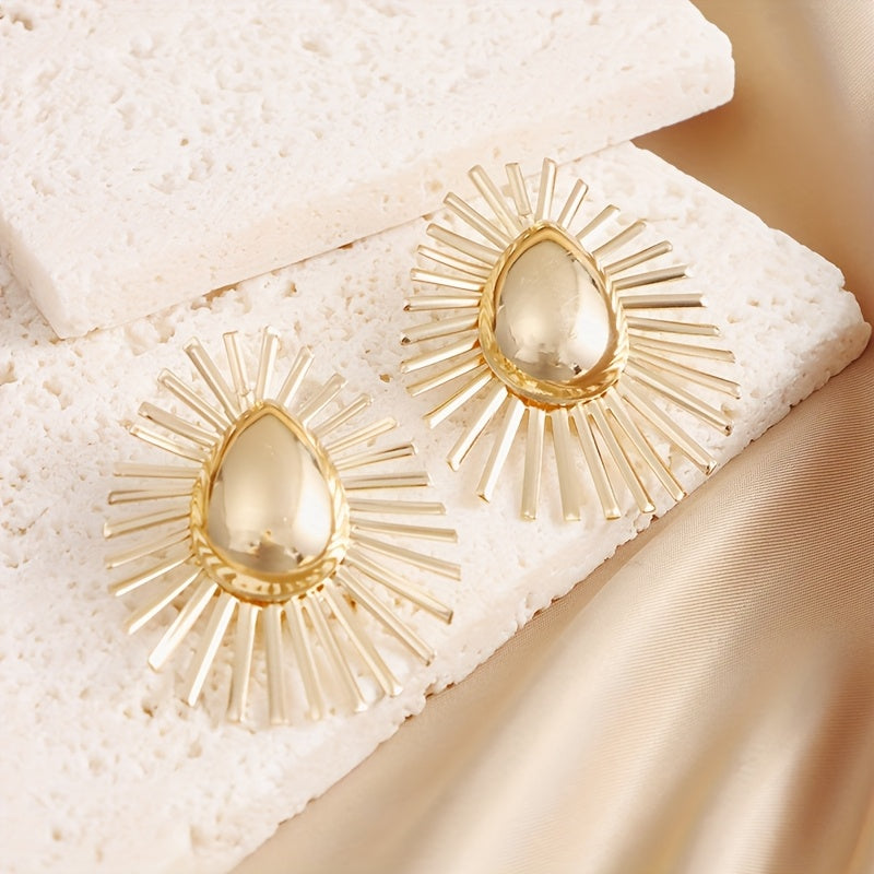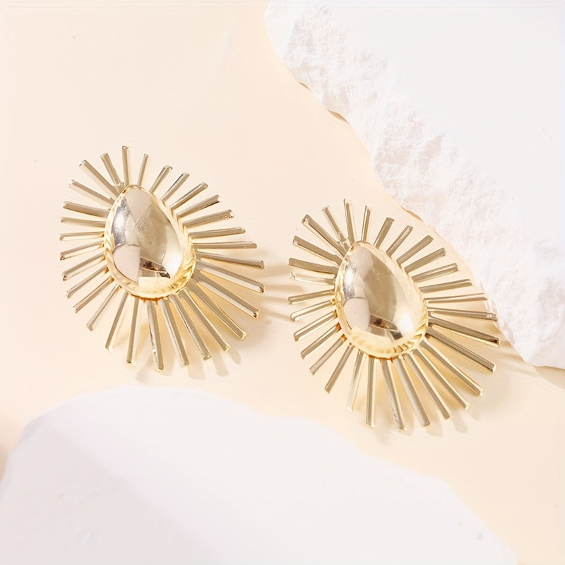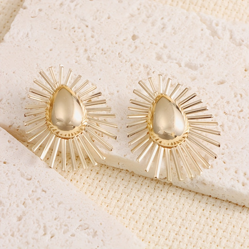 These radiant sunburst ear studs in golden tone metal are a versatile accessory for daily wear. They make a great gift idea for women and add a touch of style to any outfit.