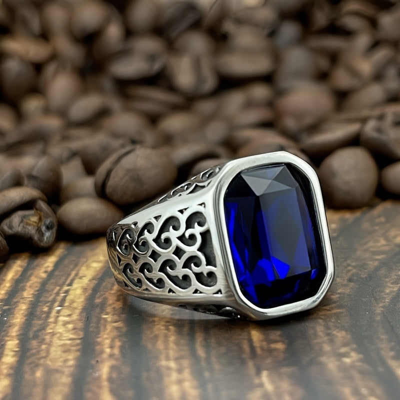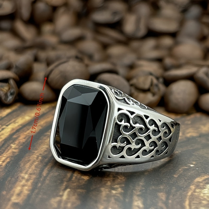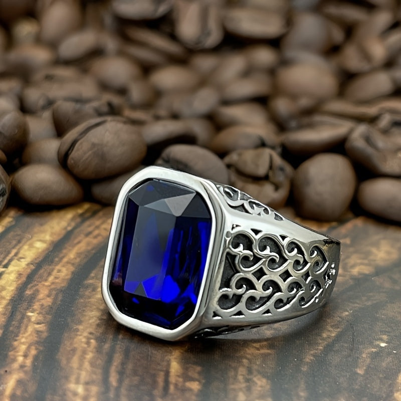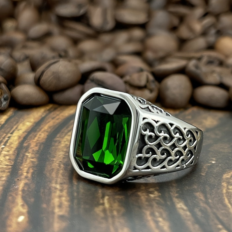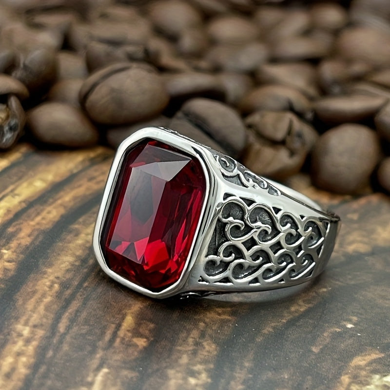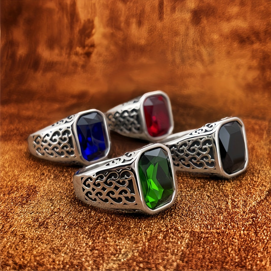 This vintage-inspired titanium stainless steel ring features intricate rectangular synthetic detailing in red, green, or clear options. Perfect as a unisex engagement gift or stylish jewelry addition.