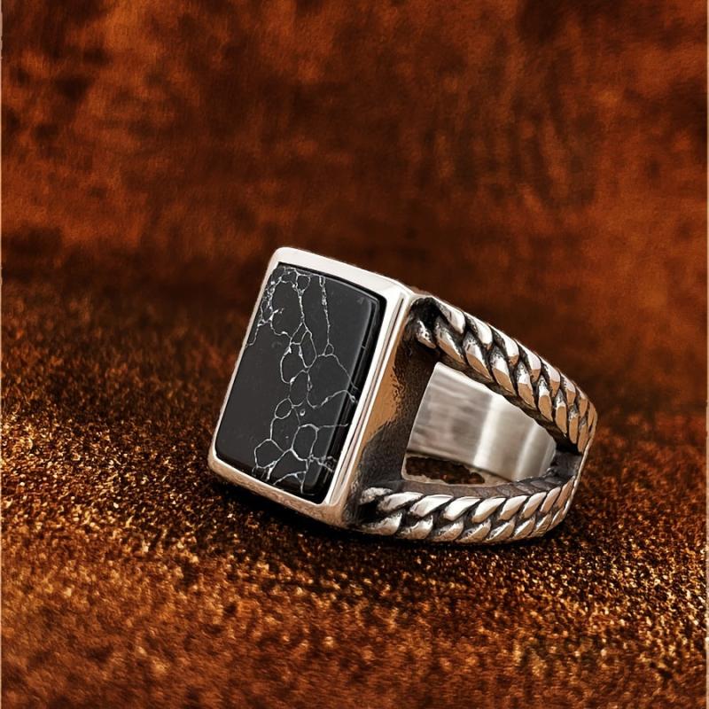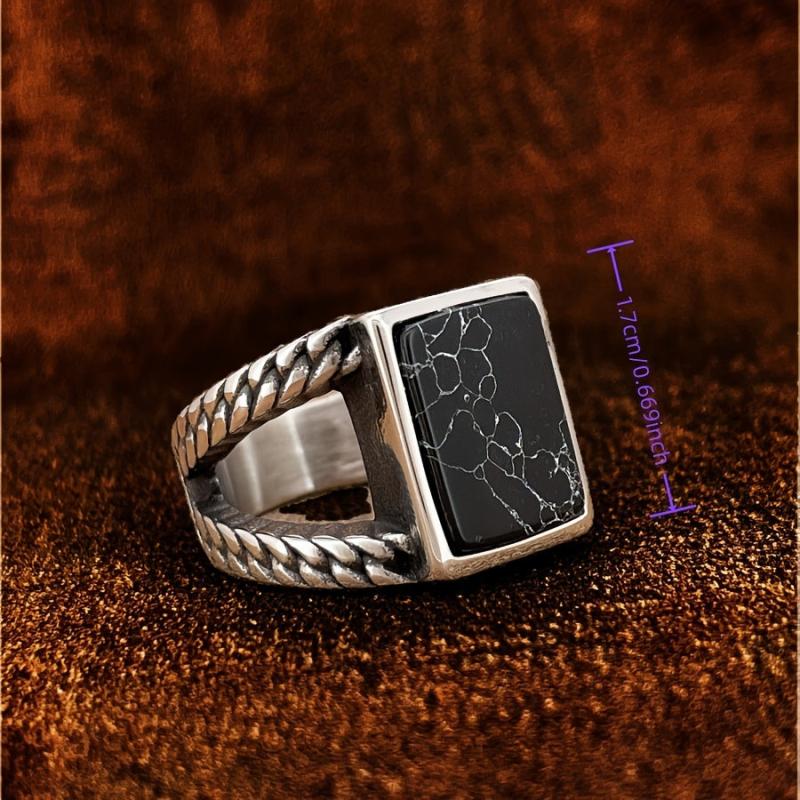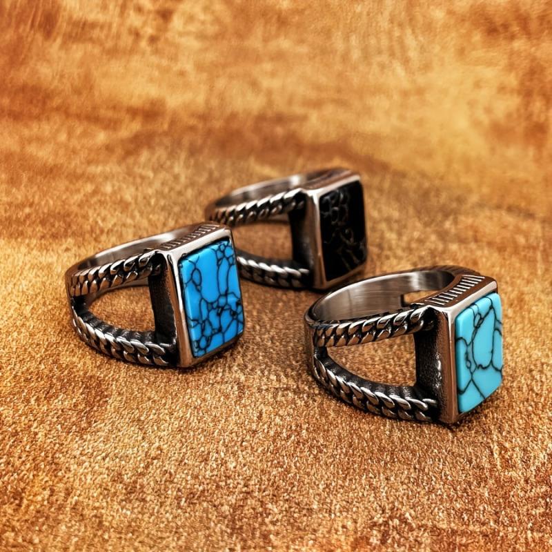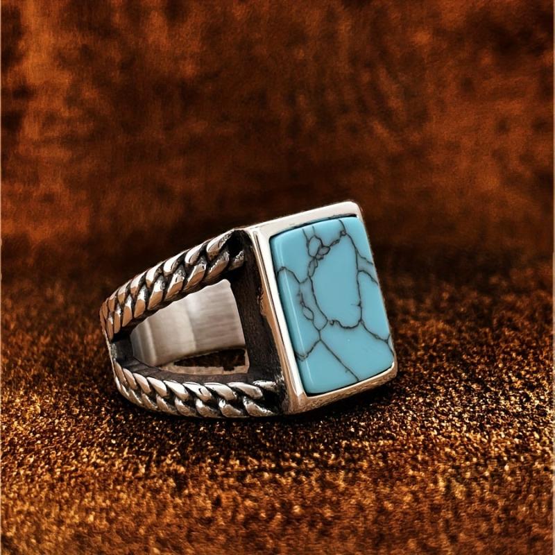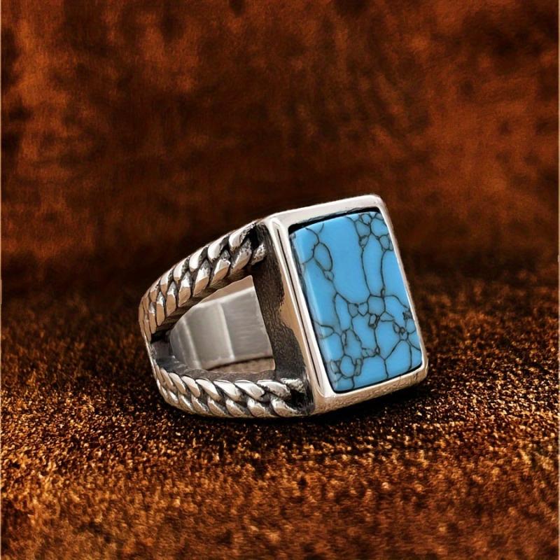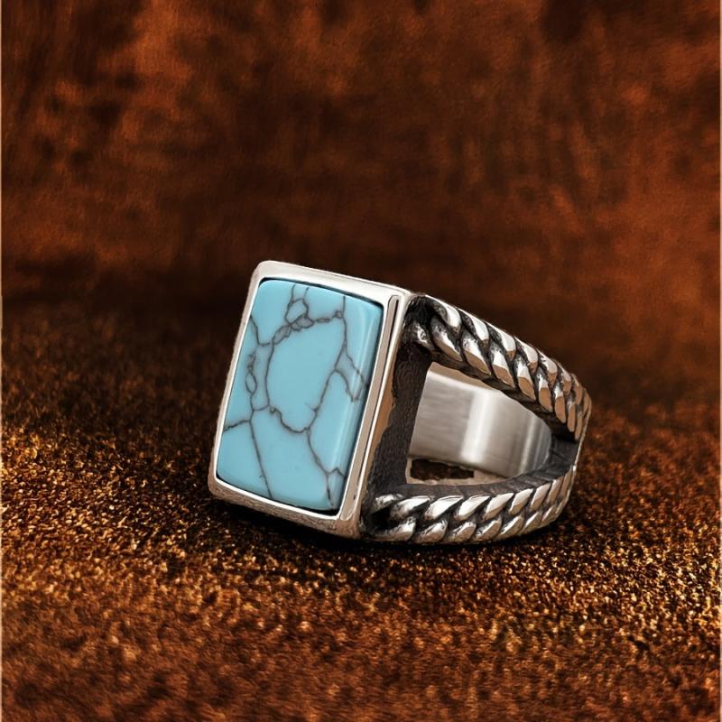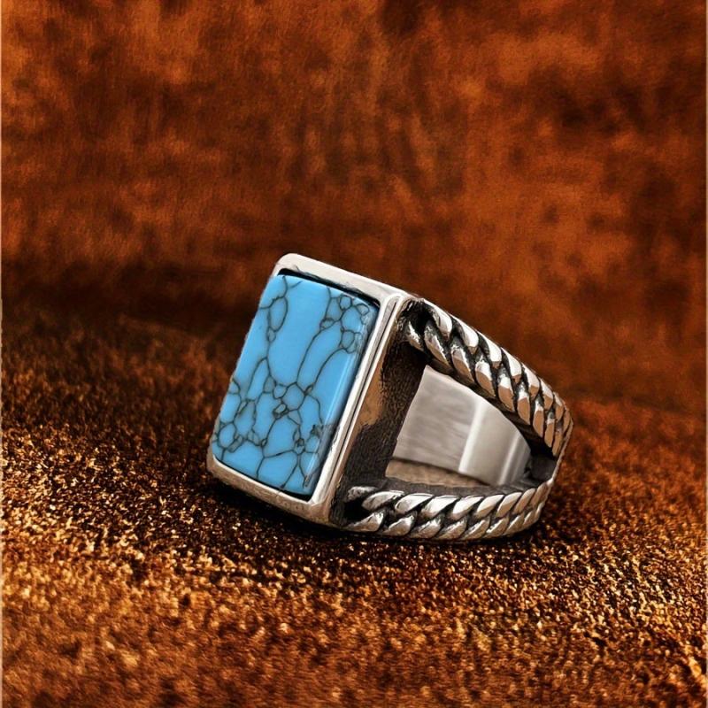 This durable stainless steel ring features a vintage design with turquoise and synthetic cubic zirconia. Suitable for men and women, it is intricately detailed and resistant to allergies.