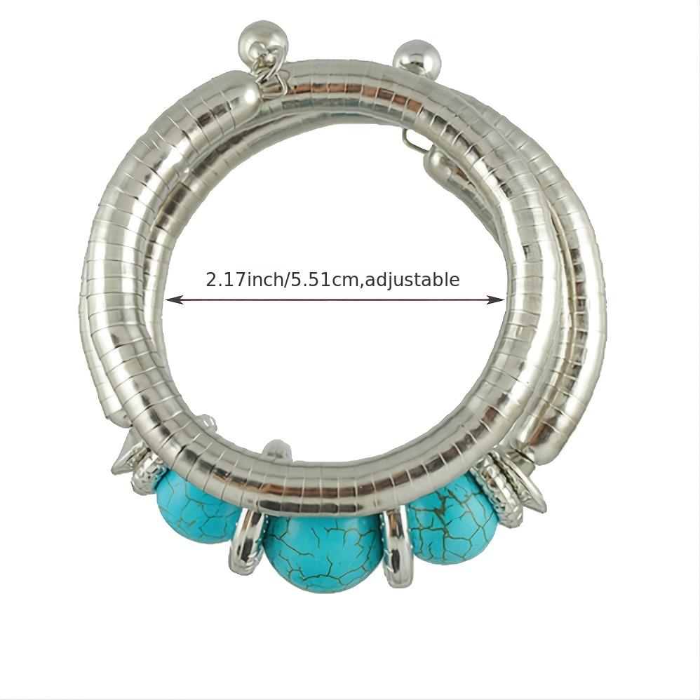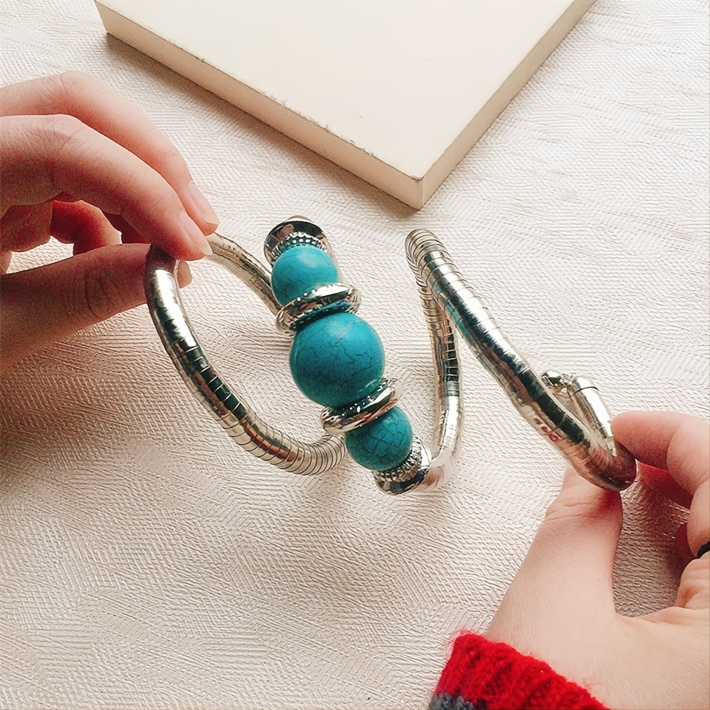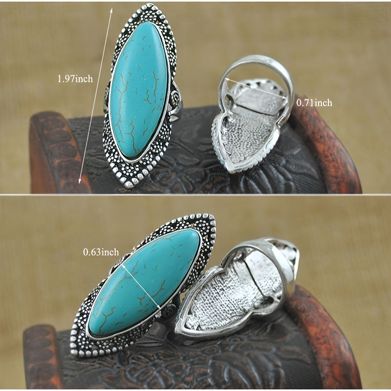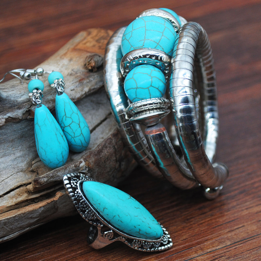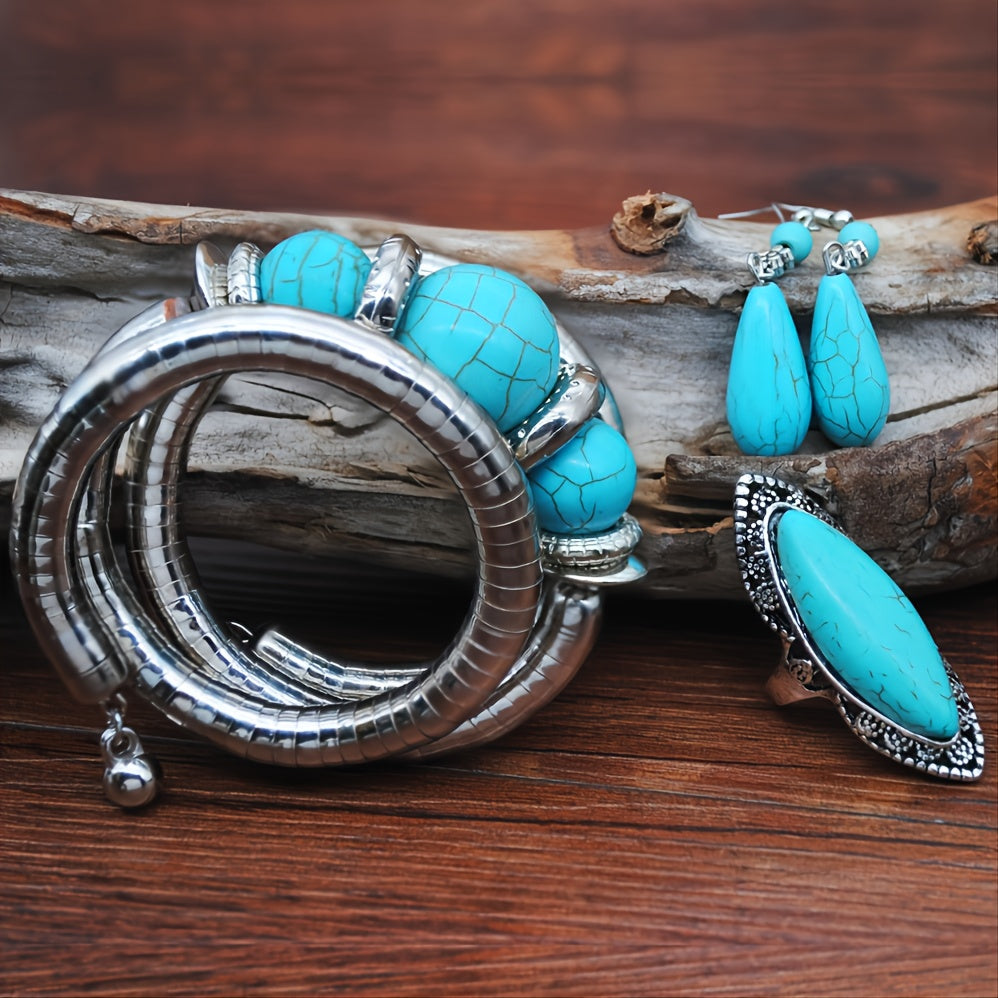 Complete your look with this stunning vintage turquoise jewelry set. Set includes an adjustable bangle, cut out engraved ring, and drop earrings.