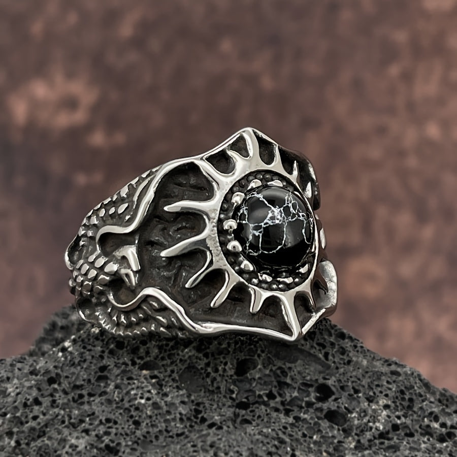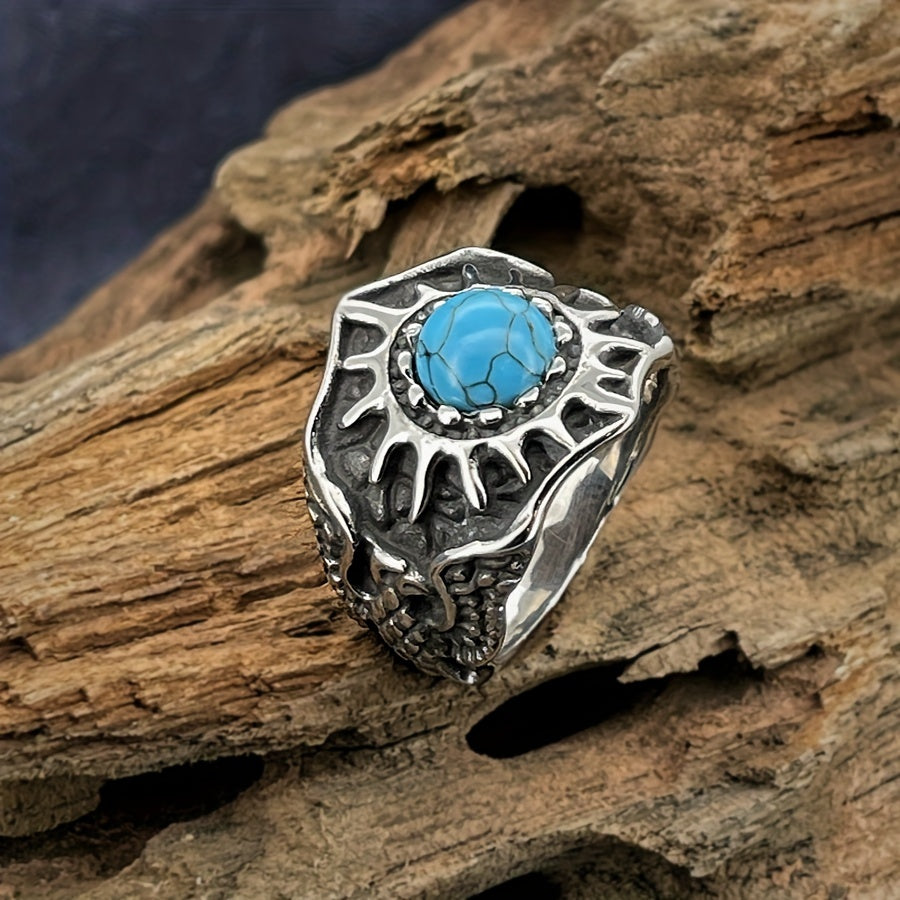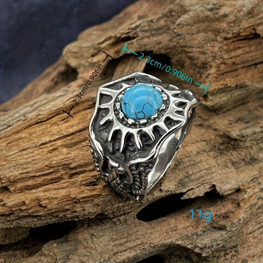 This single band ring features a synthetic turquoise stone with sunflower design. Made of stainless steel, it's perfect for everyday wear.