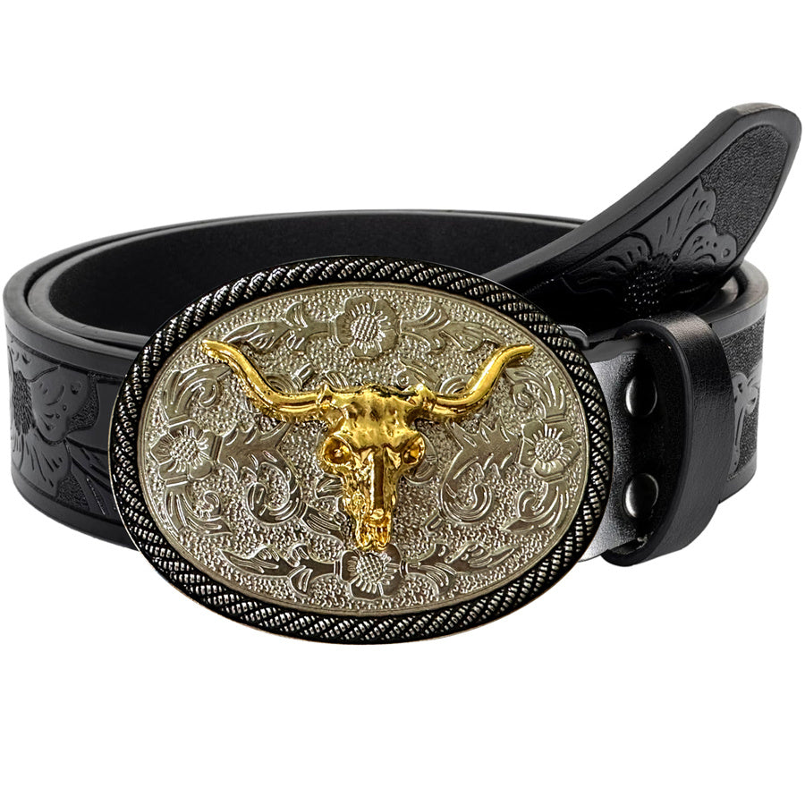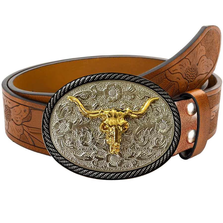 Add a touch of retro Western flair to your outfit with this vintage-style cowboy belt. Featuring a bull head and floral design on brown faux leather, this belt is perfect for adding a rugged touch to your wardrobe.