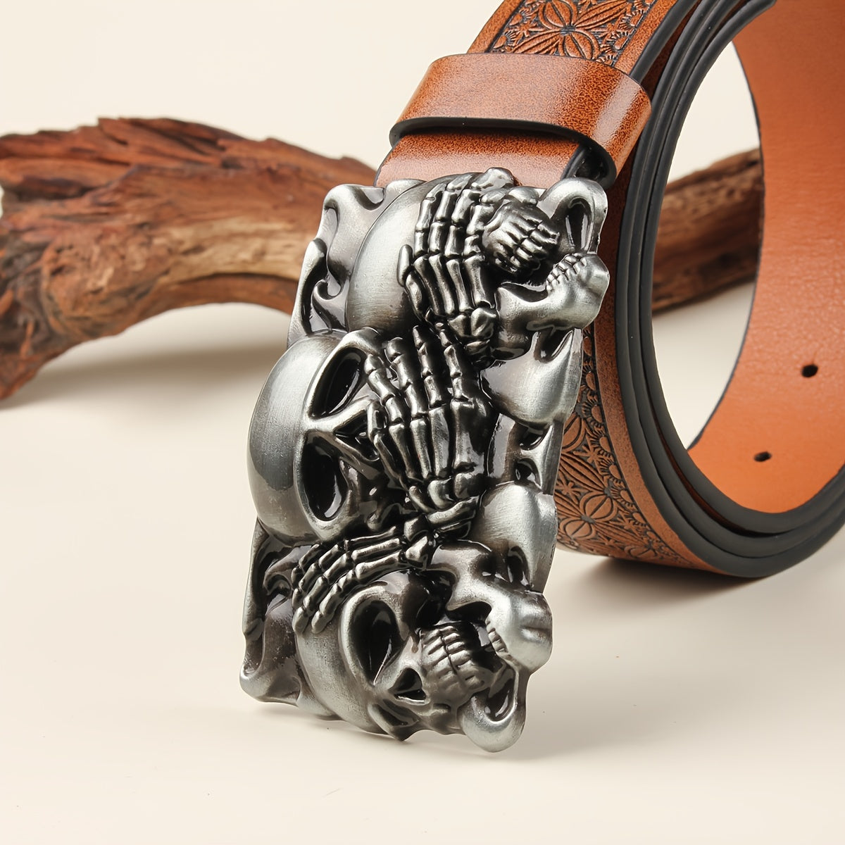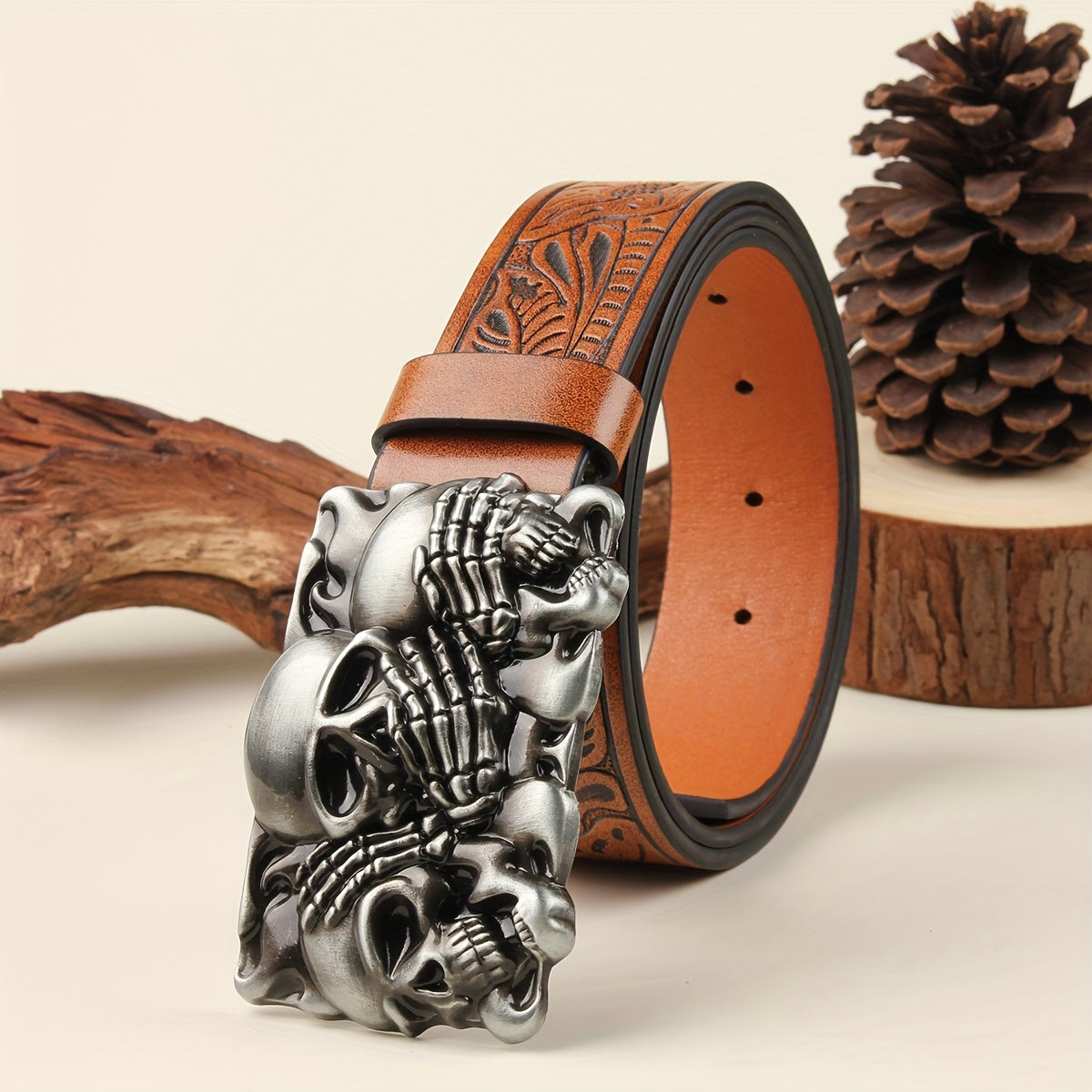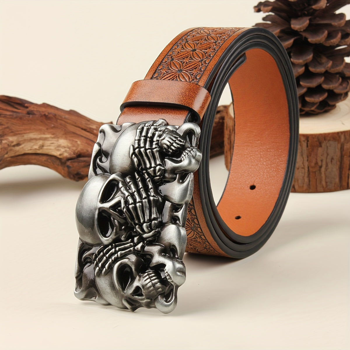 This vintage Western style belt features a unique skull buckle design and a checkered pattern. Made of high-quality faux leather with smooth round holes and an adjustable buckle for easy wear.
