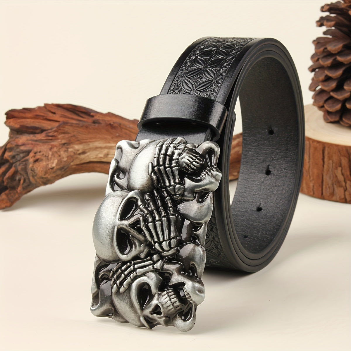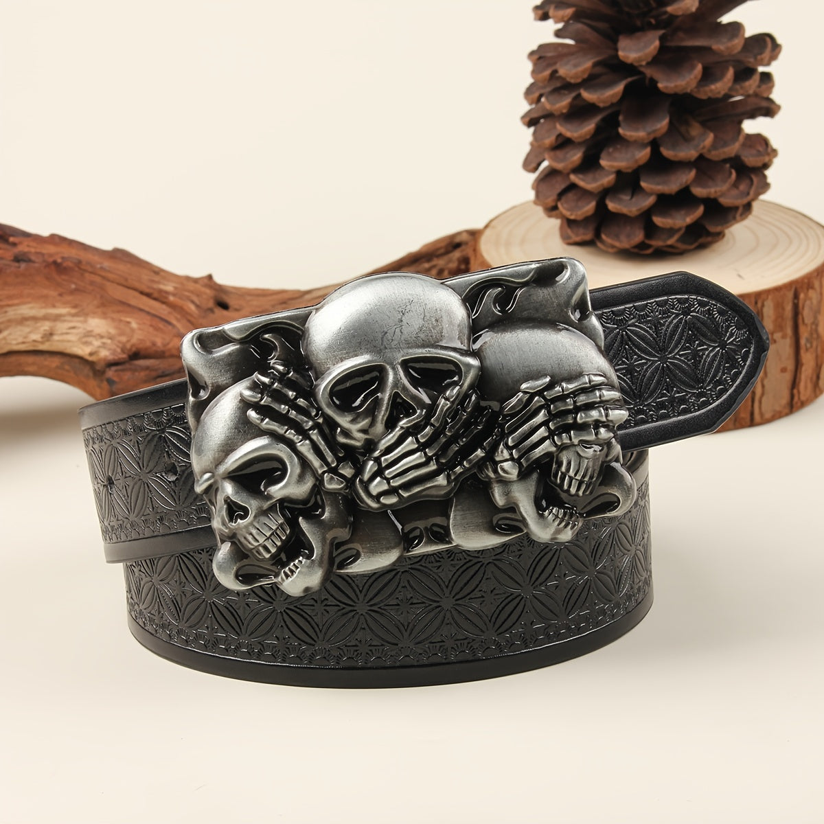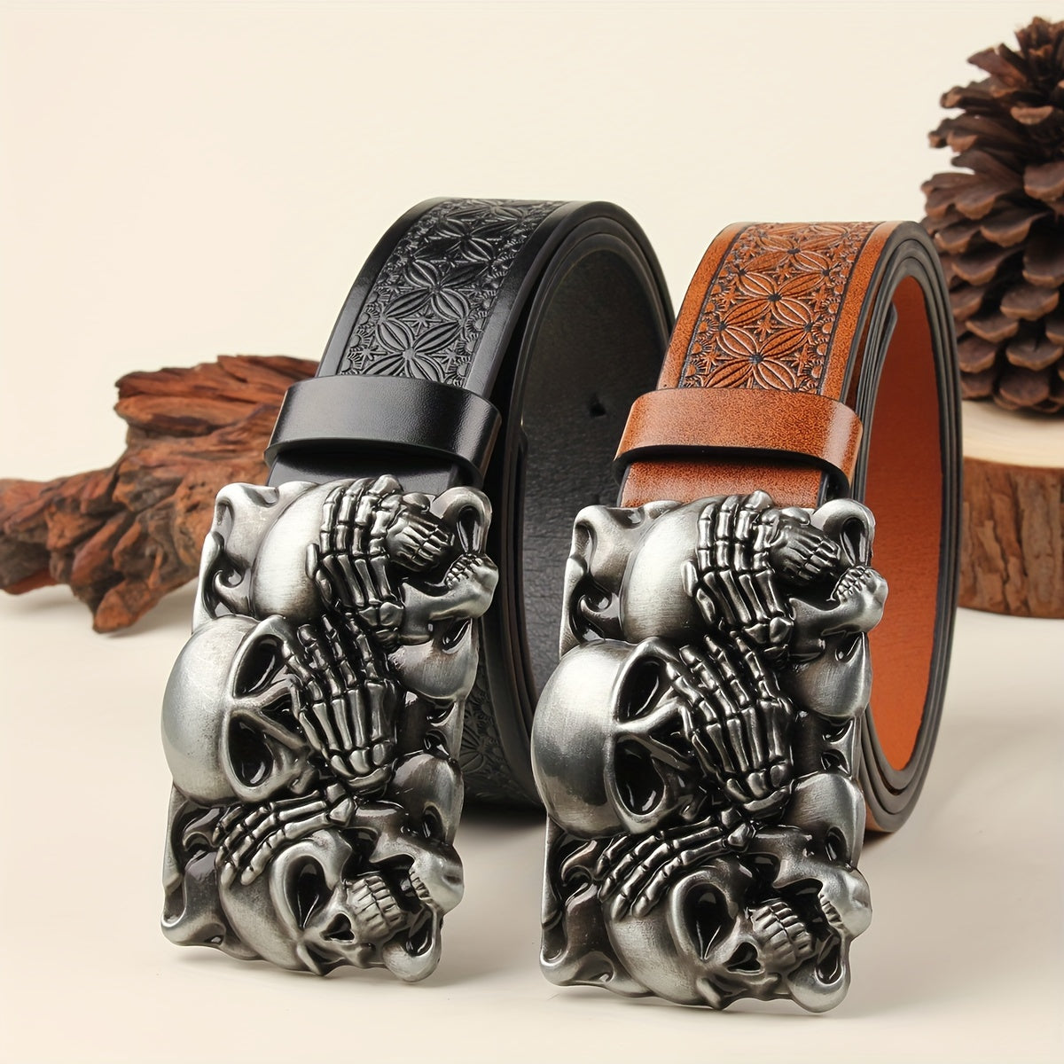 This vintage Western style belt features a unique skull buckle design and a checkered pattern. Made of high-quality faux leather with smooth round holes and an adjustable buckle for easy wear.