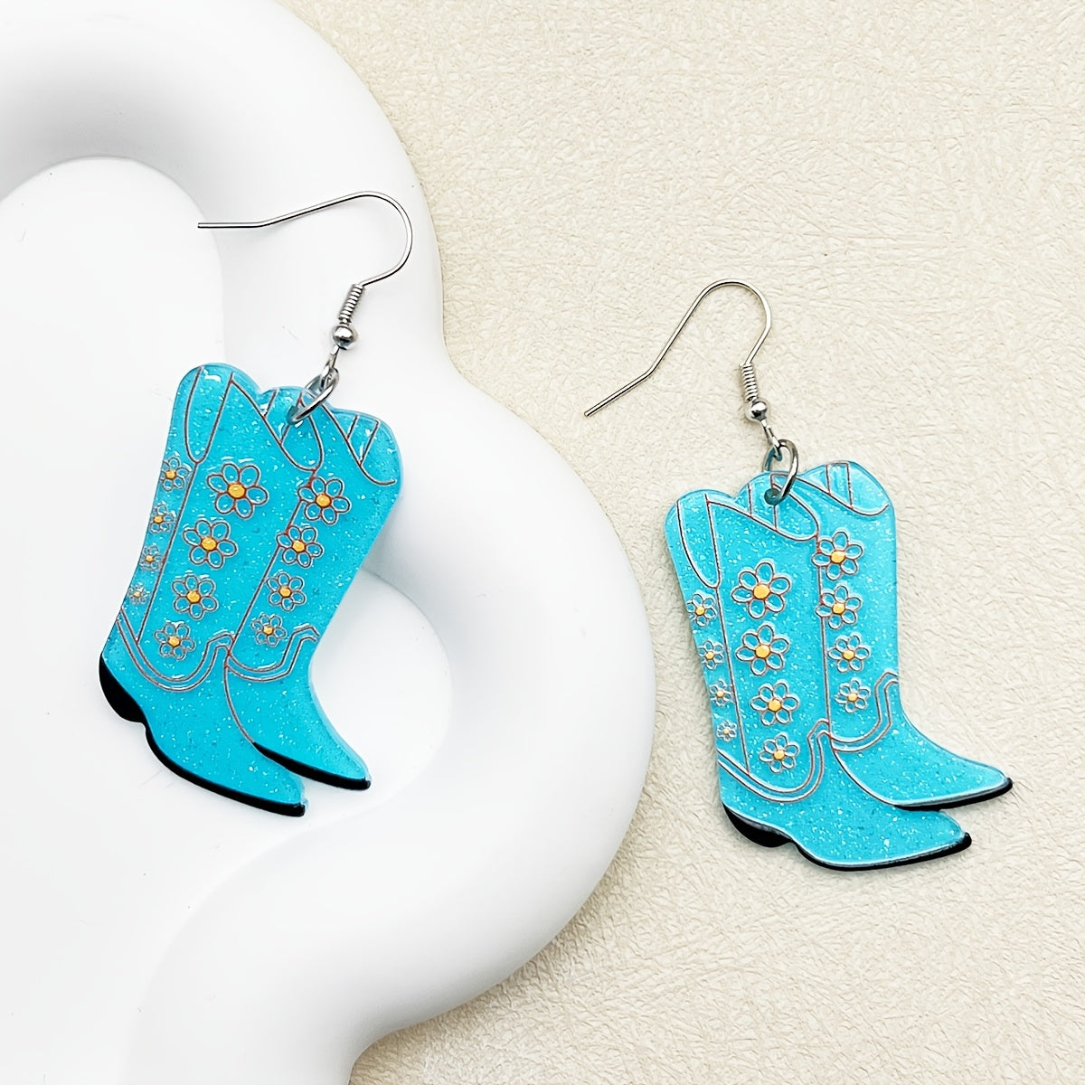 Add a touch of Western flair to your outfit with these statement earrings featuring a cowboy boot design. The turquoise glitter acrylic and floral embellishments make them stand out.