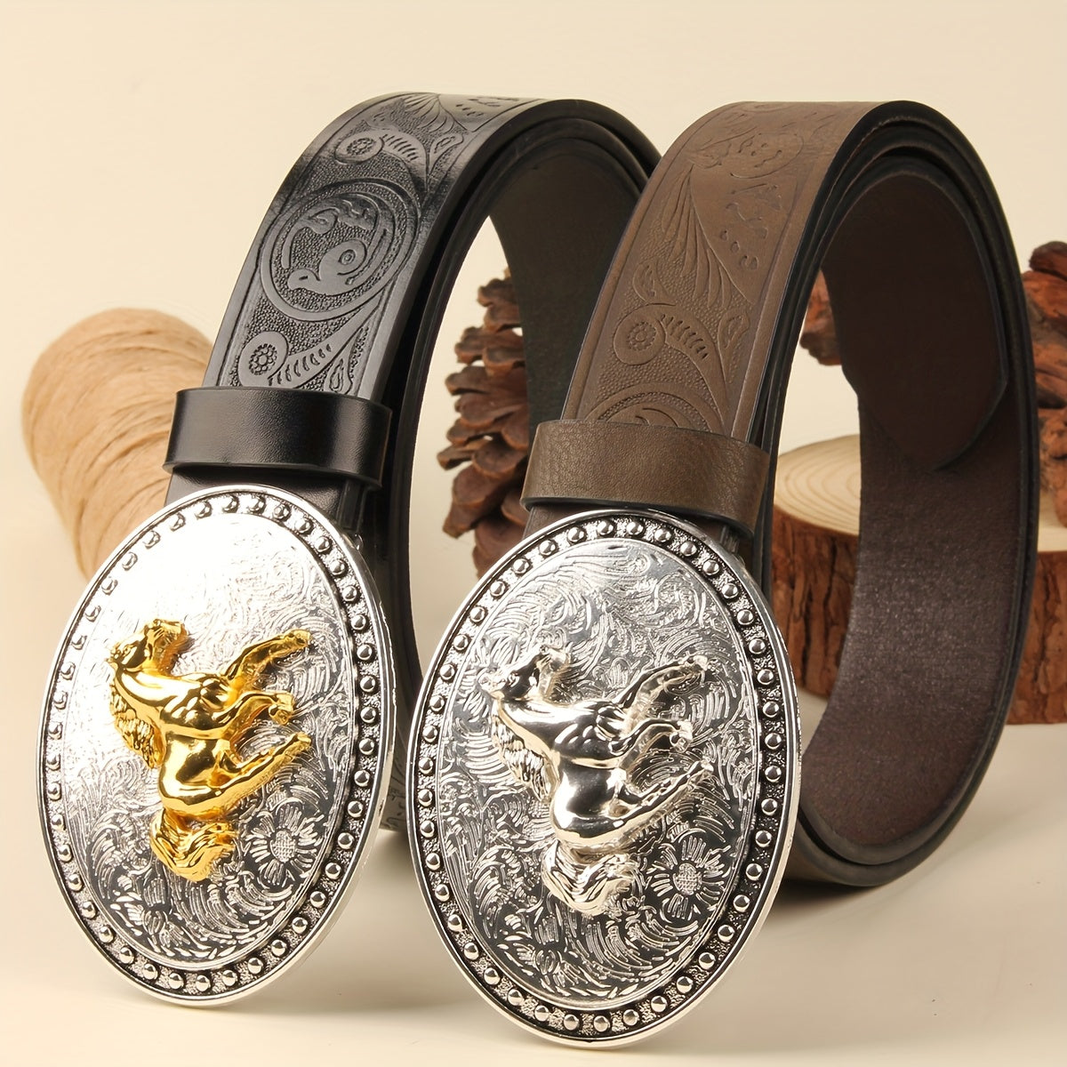 Enhance your cowboy look with this stylish Western belt buckle featuring a golden and silvery horse design. The silver finish adds a touch of elegance to your outfit.