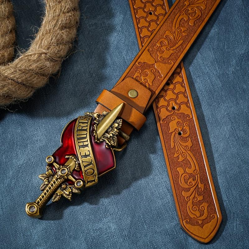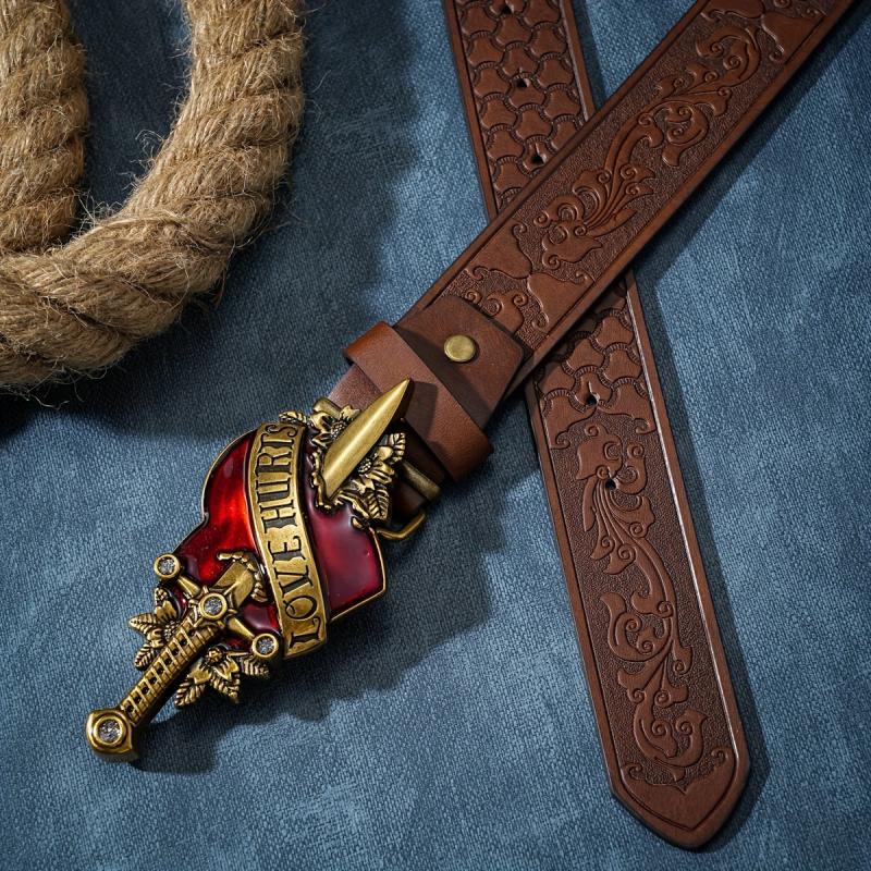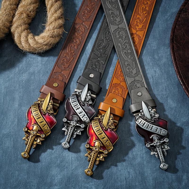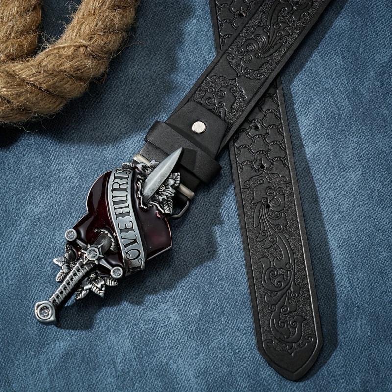 Add a touch of Western cowboy punk style with this belt featuring an arrow through heart buckle. Available in brown and grey options, this accessory is perfect for parties and casual wear.