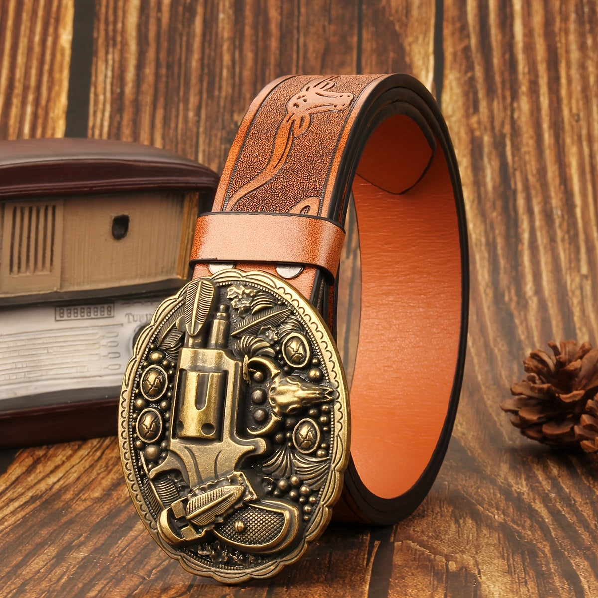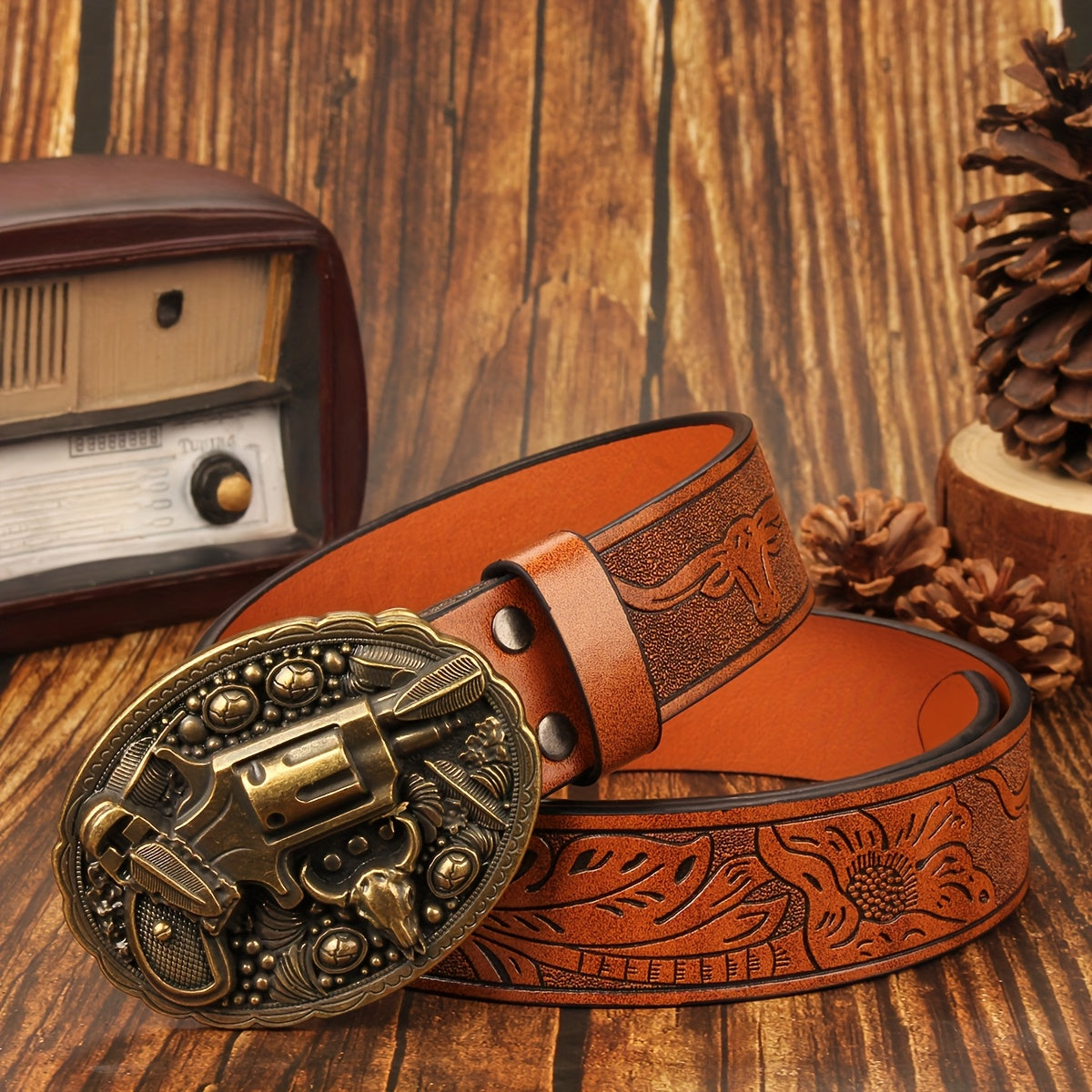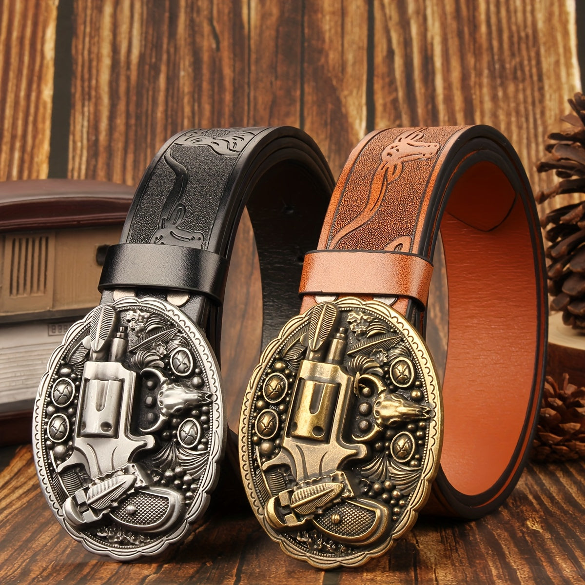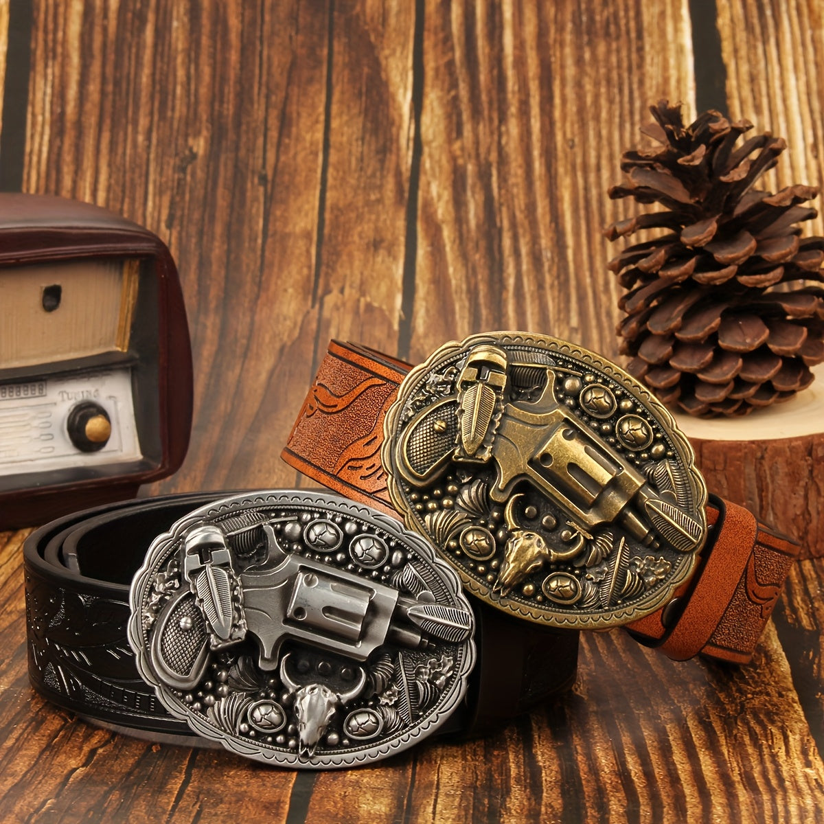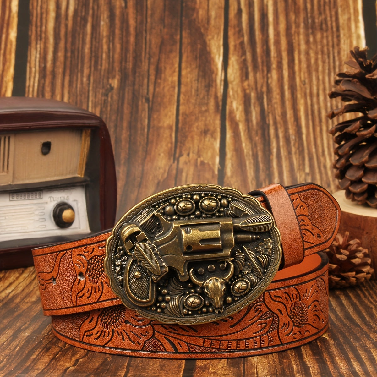 This men's and women's belt features a western oval buckle with embossed design. It is 3" wide and made of high-quality materials.