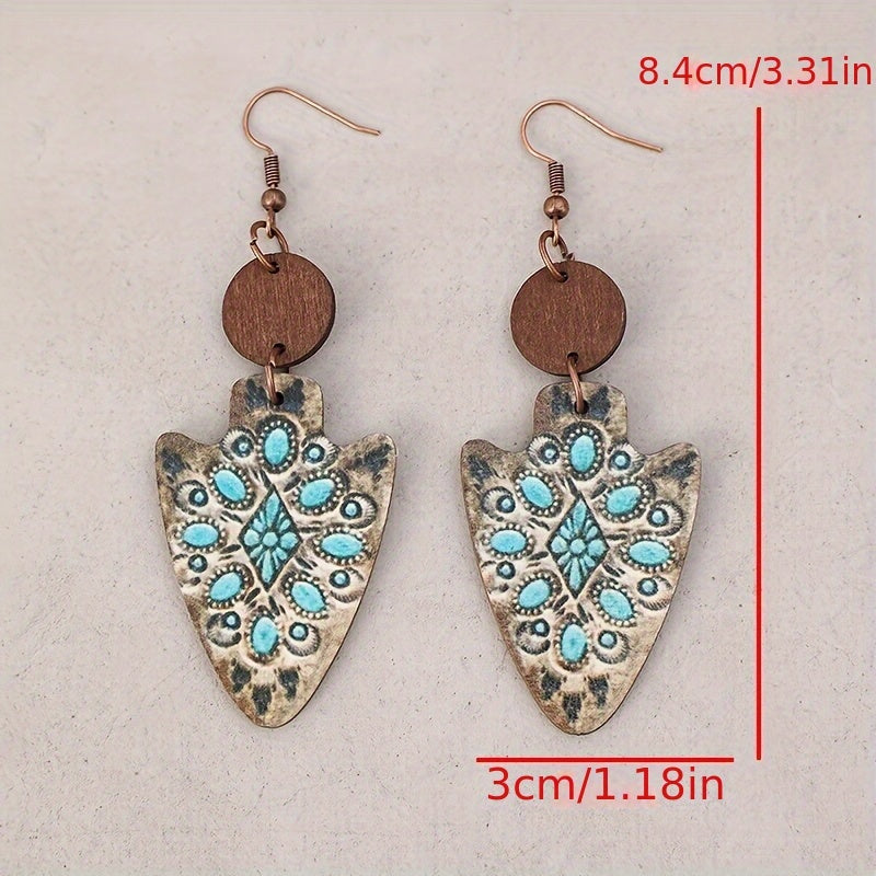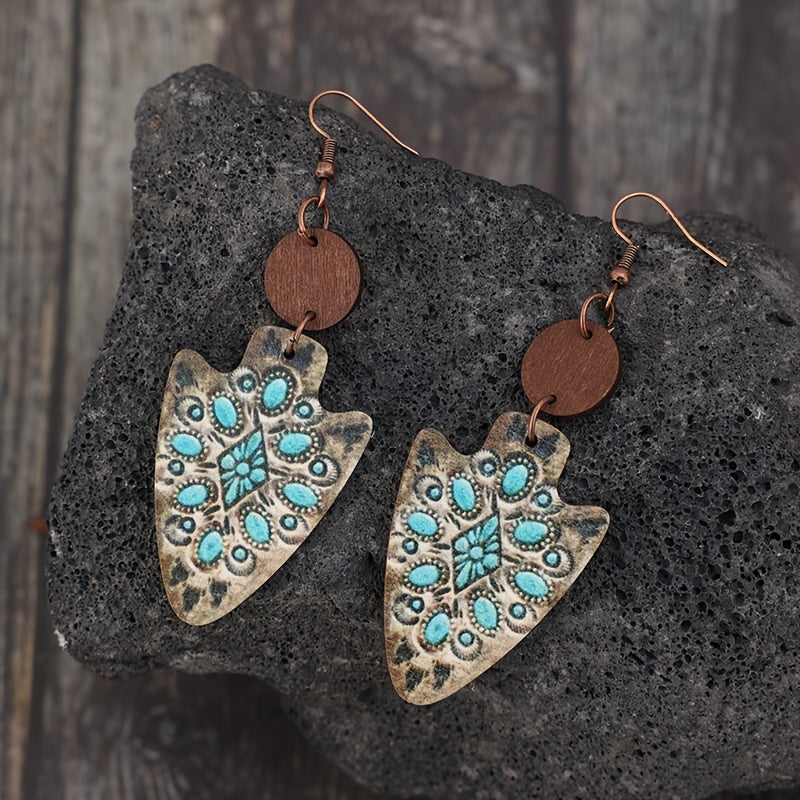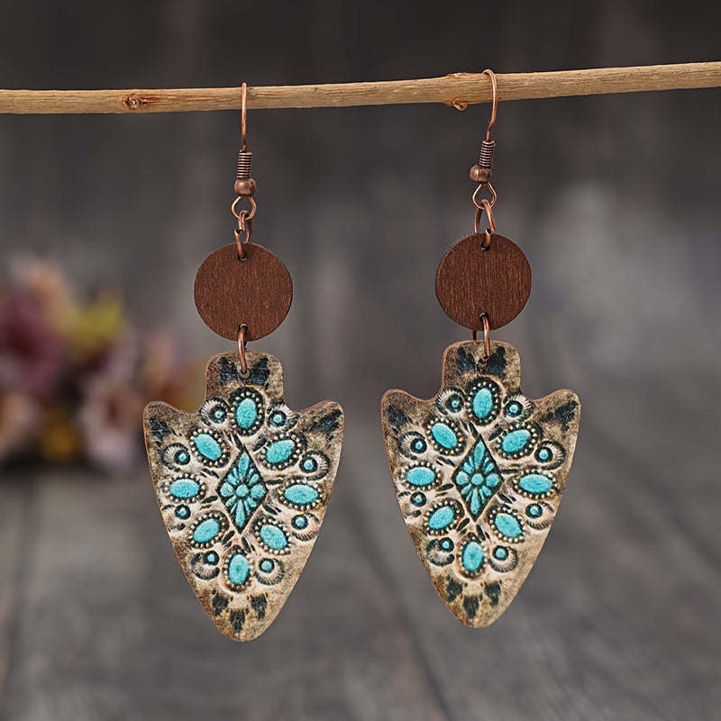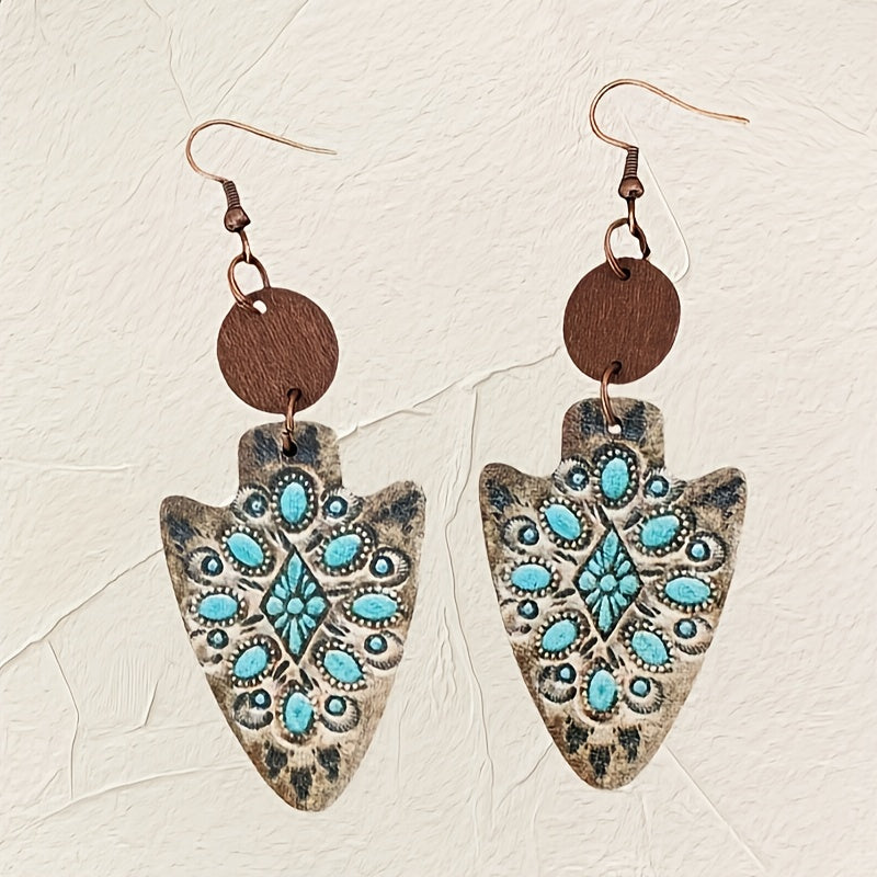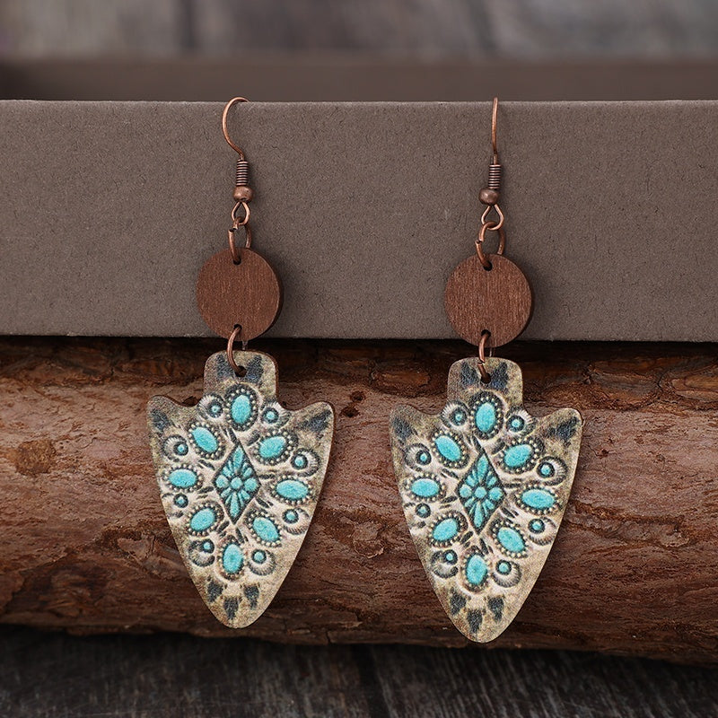 These unique earrings feature a spliced wood design with a western arrow print pattern. They are perfect for adding a touch of creativity to your outfit.