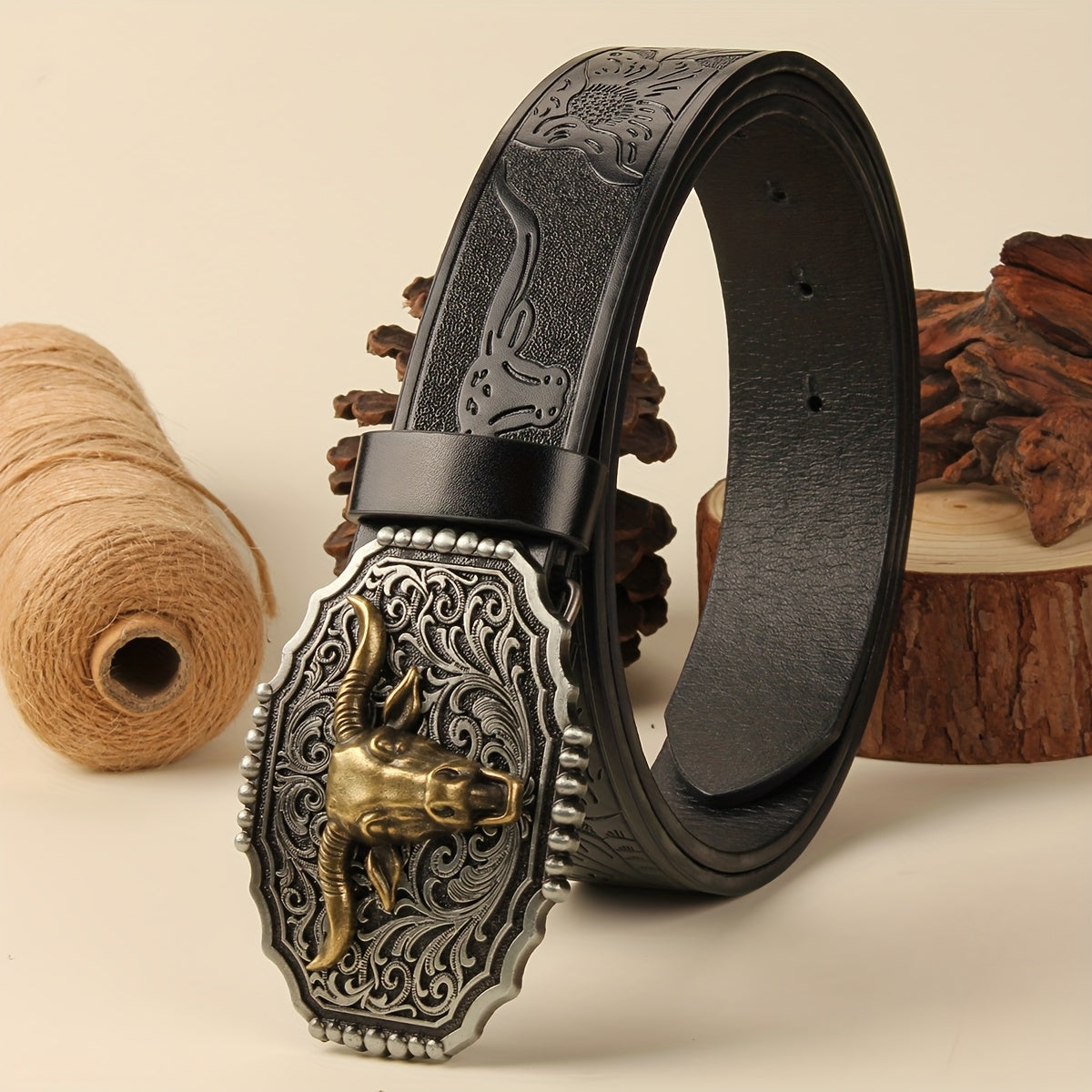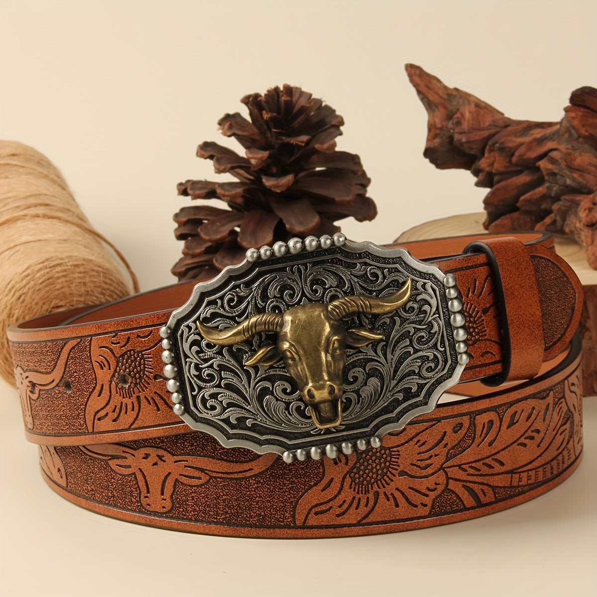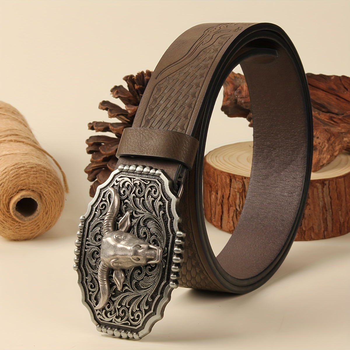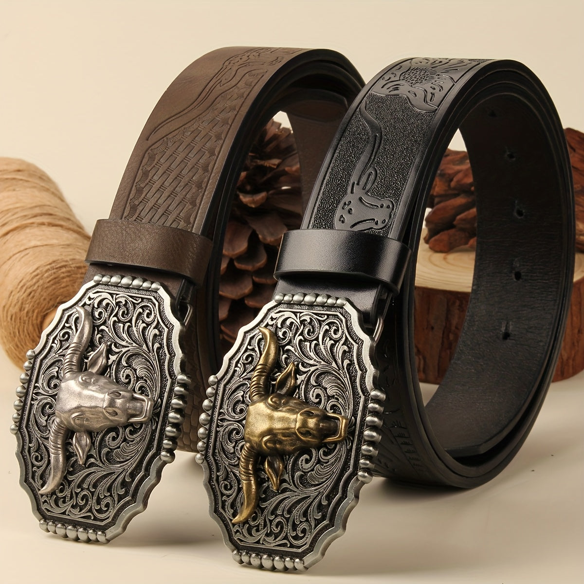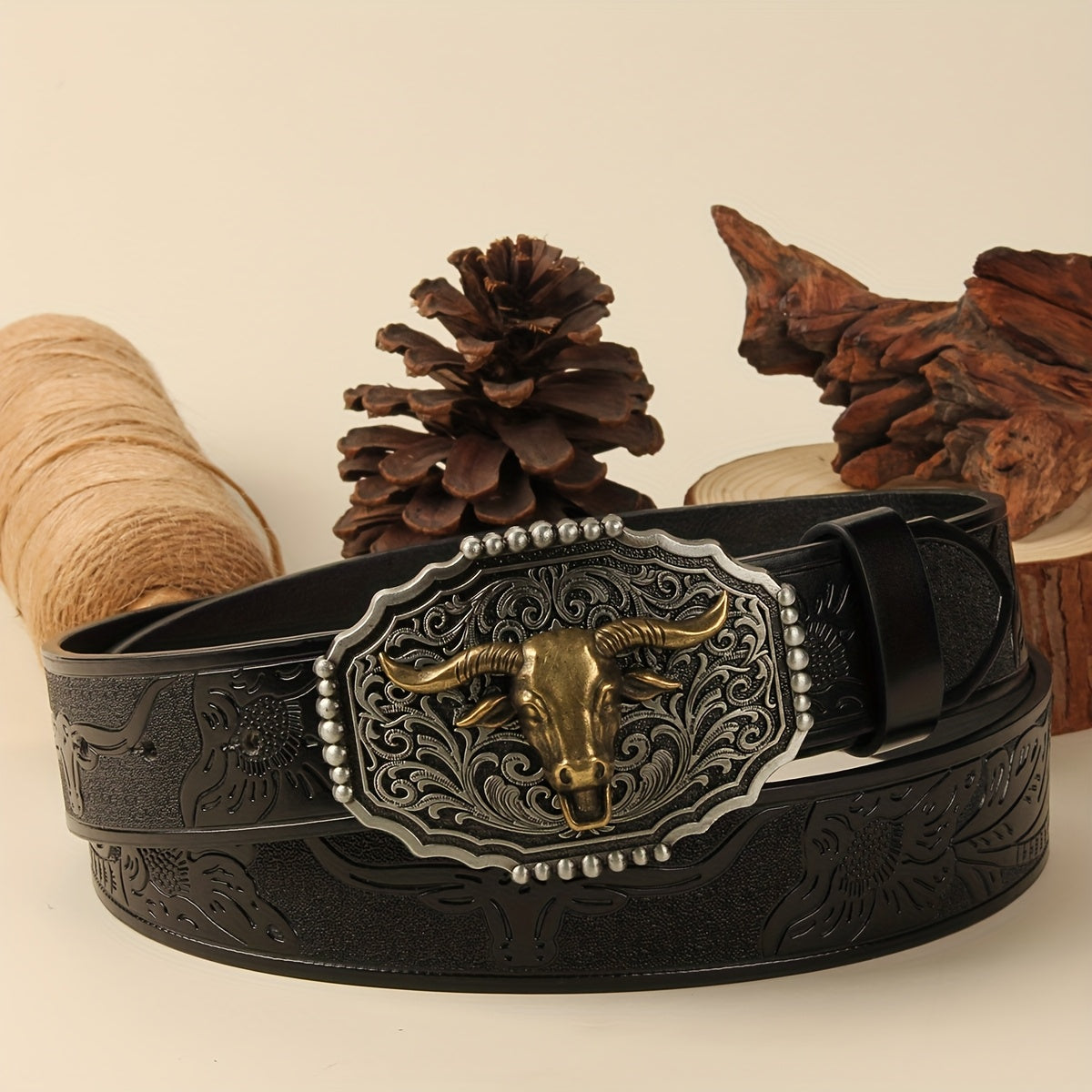 This cowboy belt buckle with intricate silvery and golden engraving comes with a durable faux leather belt, perfect for adding a touch of Western style to your casual attire.